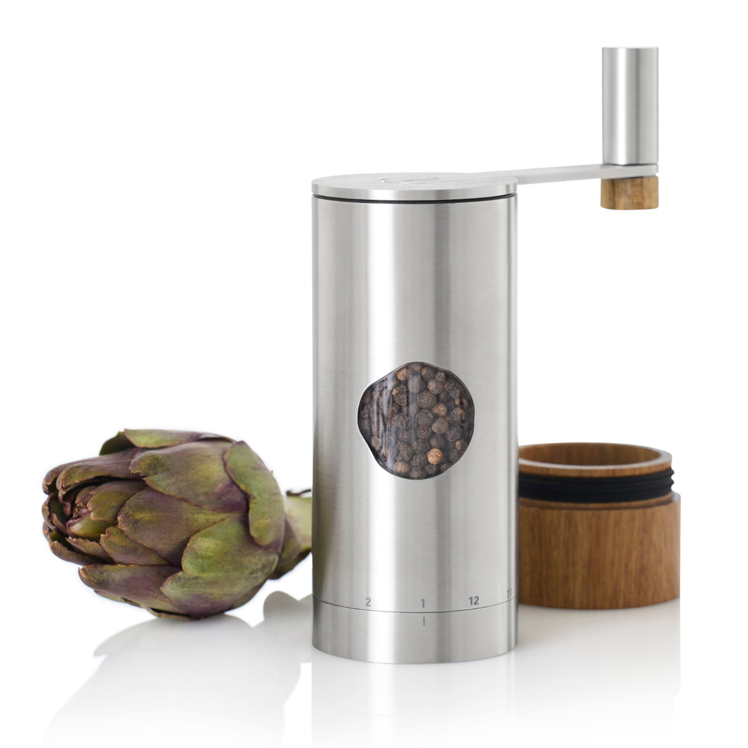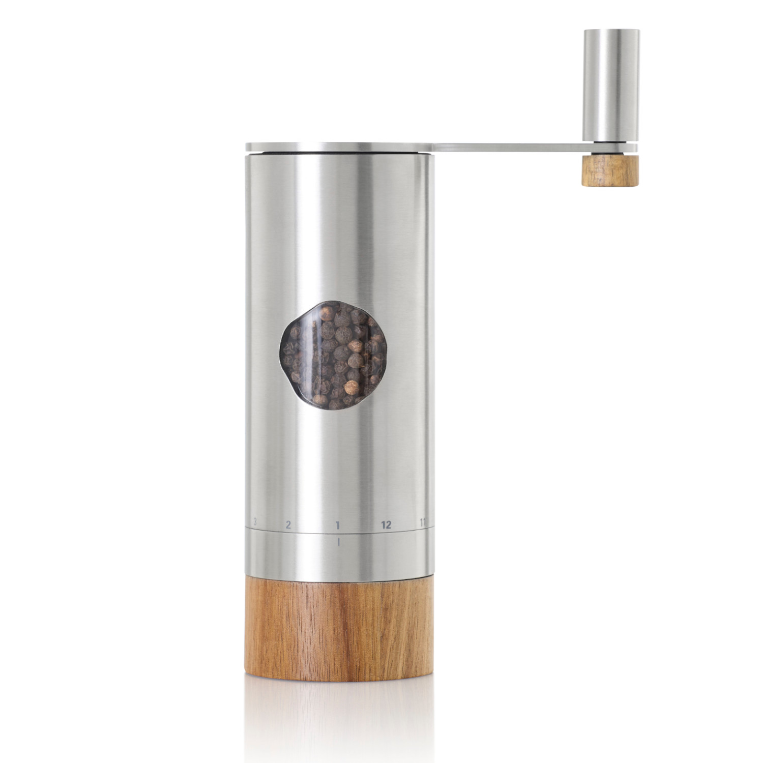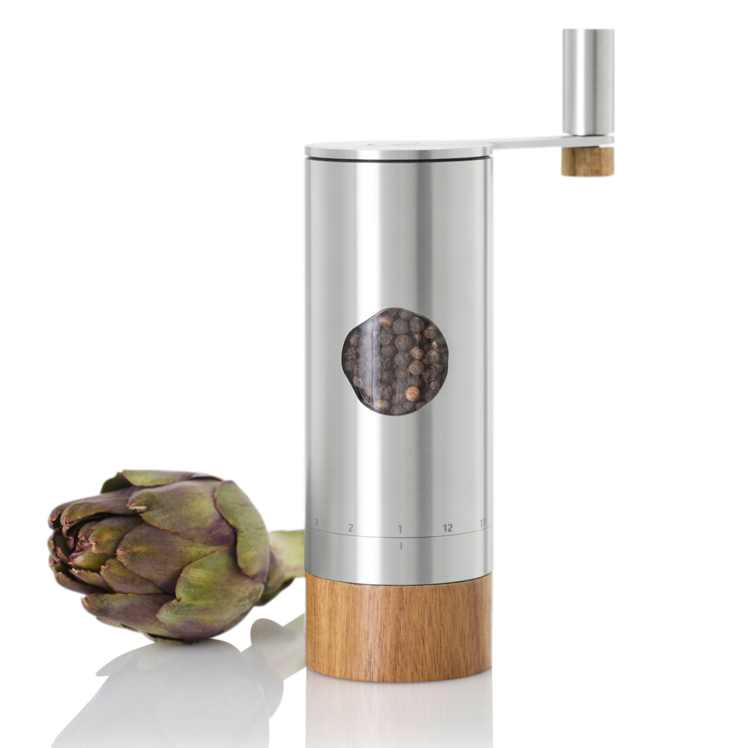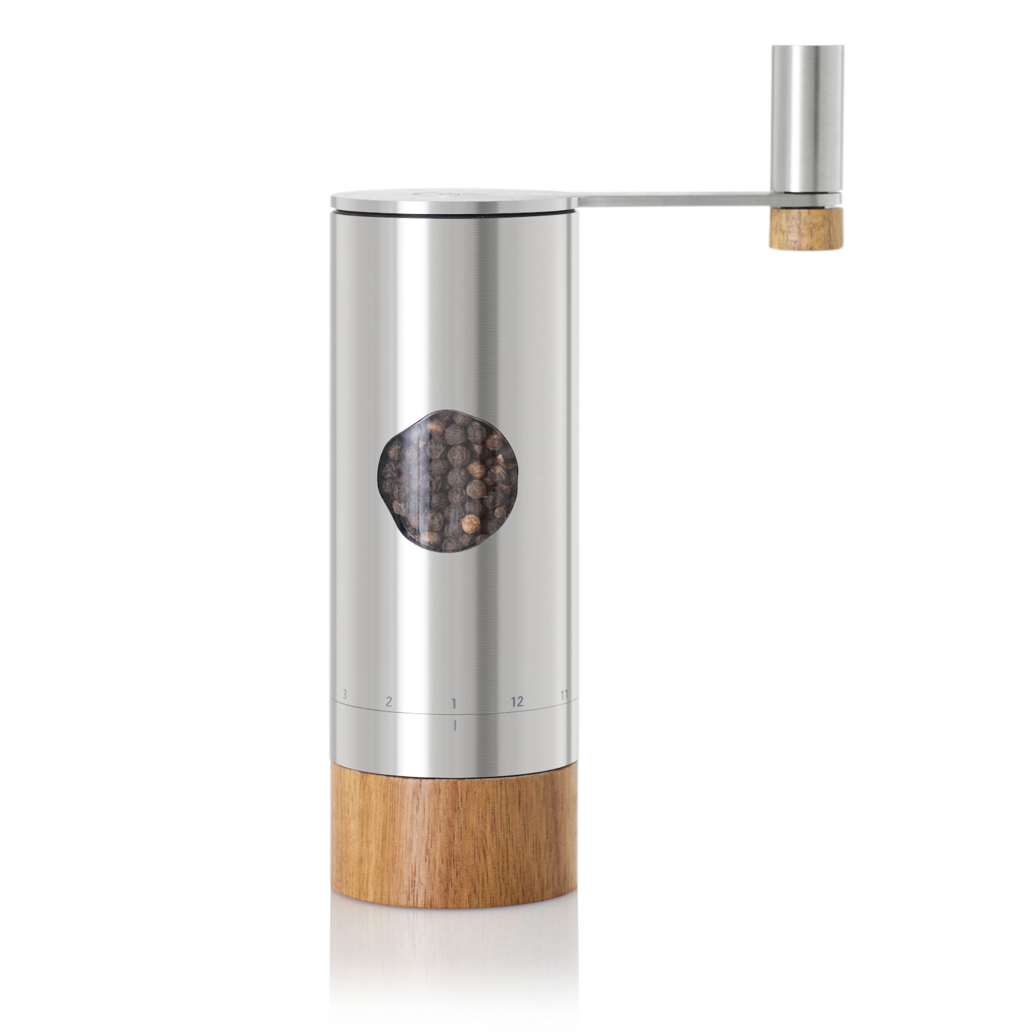 W porównaniu ze zwykłymi młynkami, PowerMill miele przyprawy zdecydowanie bardziej efektywnie. Zastosowanie w urządzeniu systemu przekładni Planet+® z korbką oraz dużych żaren CeraCutXL® zapewnia wyższą efektywność mielenia. Żarna są nie tylko wydajne, odporne na korozję i zużycie, ale też nie chłoną zapachów. Zastosowanie tradycyjnej korbki znacznie ułatwia mielenie, w tym dużych i twardych ziaren, jak na przykład pieprzu tasmańskiego. Młynek ma zewnętrzną precyzyjną 12 stopniową skalę grubości mielenia Precise+®. Na spodzie został umieszczony jest na wcisk drewniany pojemnik na zmielone przyprawy. Produkt został zaprojektowany przez AdHoc Design Team. Aby napełnić młynek należy zdjąć górną część z korbką delikatnie ją ściągając. Zaleca się unikać obracania żarnami podczas wykonywania tej czynności, aby nie doprowadzić do ich uszkodzenia. Po zdjęciu górnej części młynka możliwe jest napełnienie pojemnika na przyprawy. Nie zaleca się ubijania przyprawy wewnątrz pojemnika. Do swobodnego zamknięcia młynka niezbędne jest pozostawienie odpowiedniej ilości miejsca w pojemniku na przyprawy. Szczególną uwagę należy zwracać na czystość przypraw. Pewne zanieczyszczenia mogą doprowadzić do uszkodzenia żaren. Przed przystąpieniem do regulacji konieczne jest sprawdzenie czy pomiędzy żarnami nie zalega przyprawa, mogąca blokować regulację. Uwaga: Nigdy nie miel, jeżeli zbiornik na przyprawy jest pusty, może to doprowadzić do uszkodzenia żaren! Młynek należy czyścić lekko wilgotną, miękka ściereczką. Nigdy nie należy młynka zanurzać w wodzie. Żarna można oczyścić delikatnie szczoteczką. Materiał: stal nierdzewna, drewno akacja. Opakowanie: kartonowe pudełko prezentowe.