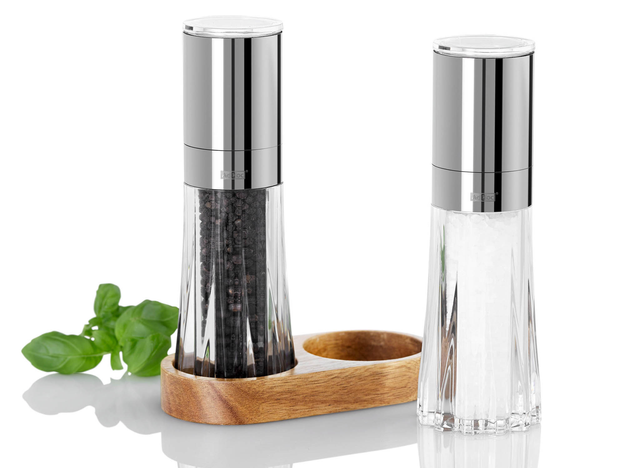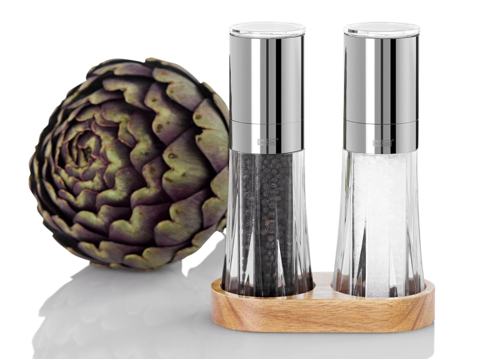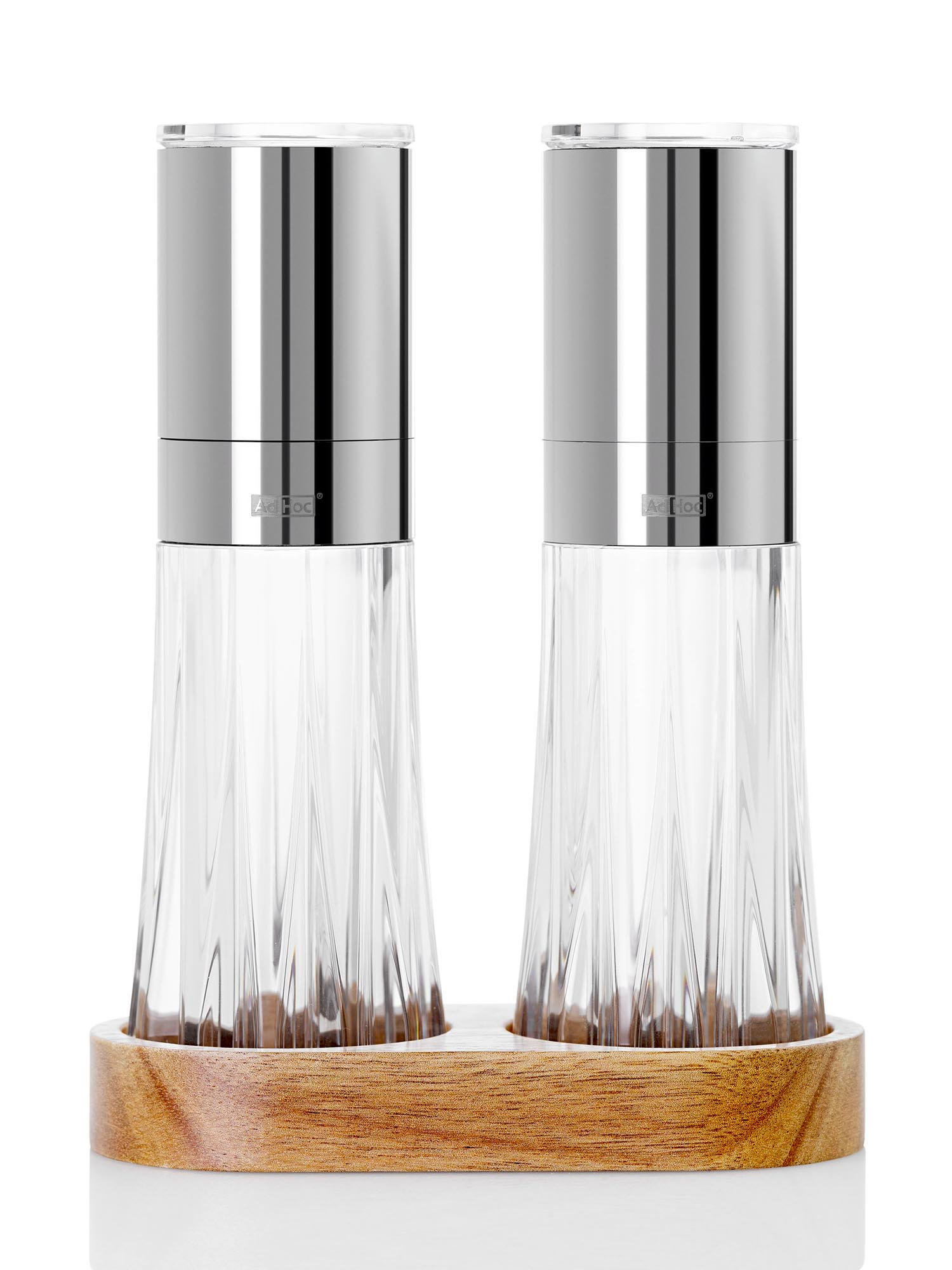 Są to klasyczne i funkcjonalne młynki do zróżnicowanych rodzajów pieprzu i soli. Posiadają bardzo wydajne żarna CeraCut®, które są wolne od zapachów i smaków, a także są niezwykle odporne na zużycie i korozję. Napełnianie młynków jest wygodne dzięki dużemu otworowi. Młynki spoczywają w eleganckiej drewnianej podstawce w taki sposób, że żarna znajdują się u góry, co sprawia, że blat pozostaje czysty. Dodatkowo żarna można zamknąć kapselkami, chroniącymi również przyprawy. Nie należy myć w zmywarce. Produkt zaprojektowany przez AdHoc Design Team. Materiał: stal nierdzewna, akryl, drewno akacjowe. Wymiary zestawu: długość – 13,5cm, szerokość – 6,7cm, wysokość – 17,5cm. Wymiary młynków: średnica – 5,6cm, wysokość – 17cm.