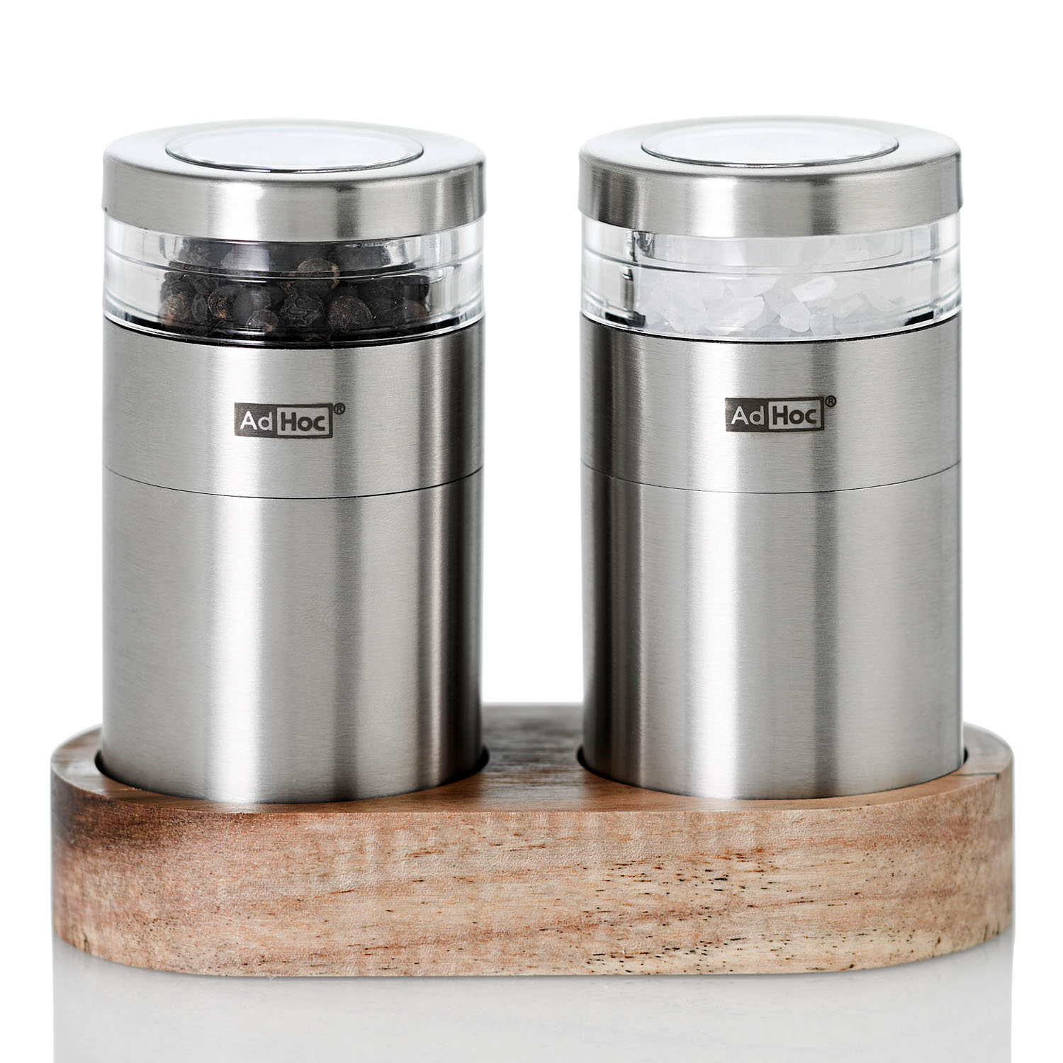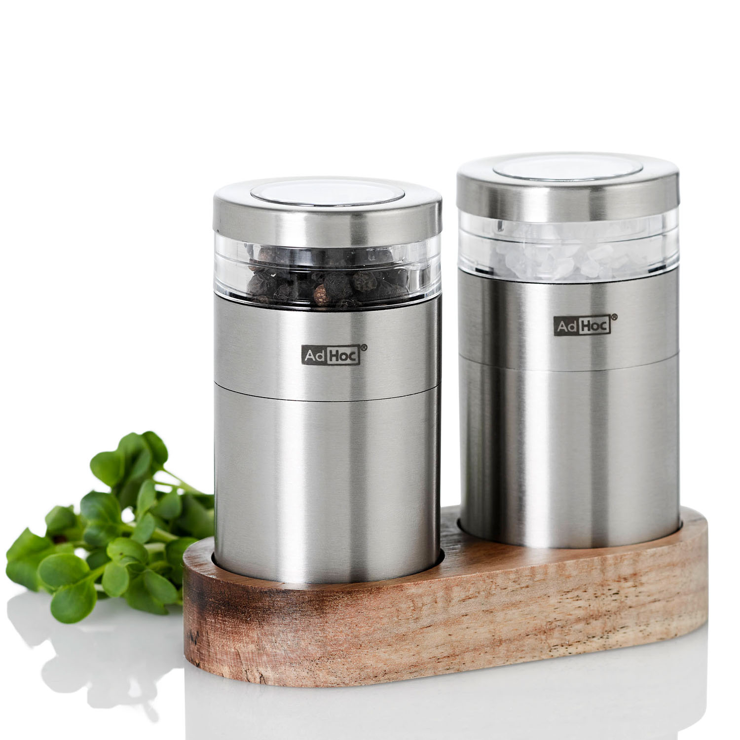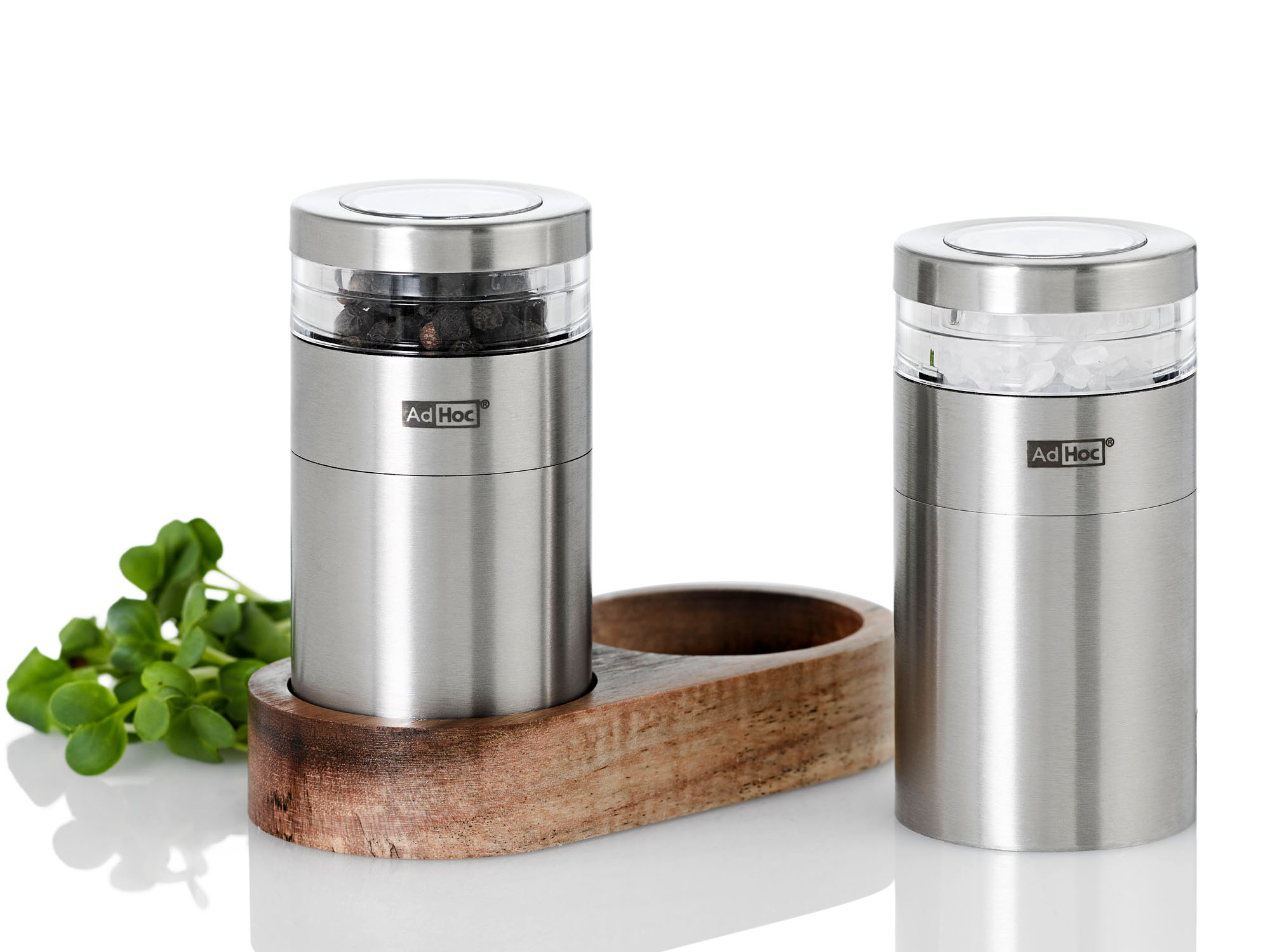 Są to młynki wyposażone w bardzo wydajne żarna CeraCut®, które są wolne od zapachów i smaków, a także są niezwykle odporne na korozje i zużycie. Młynki posiadają mechanizm doboru grubości mielenia w pełnej skali od drobnego do grubego rozmiaru. Demontowana nakrywka umożliwia łatwe napełnienie młynka, a wąskie akrylowe okienko sprawia, że przyprawy są widoczne jednocześnie nie wystawiając ich na zbyt wiele światła. Zawarta w zestawie podstawa zapewnia czystość blatu. Nie należy myć w zmywarce. Produkt został zaprojektowany przez AdHoc Design Team. Materiał: stal nierdzewna, akryl, drewno akacjowe. Wymiary młynka: średnica – 4,5cm, wysokość – 8,6cm. Wymiary podstawy: długość – 11,5cm, szerokość – 5,5cm, wysokość – 9,5cm.