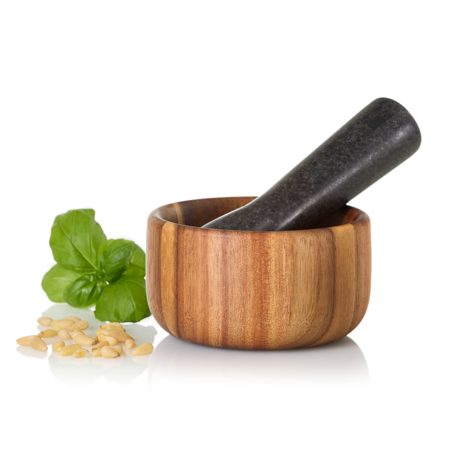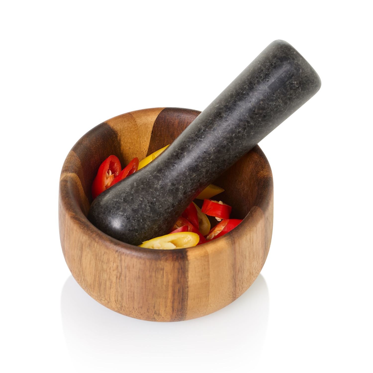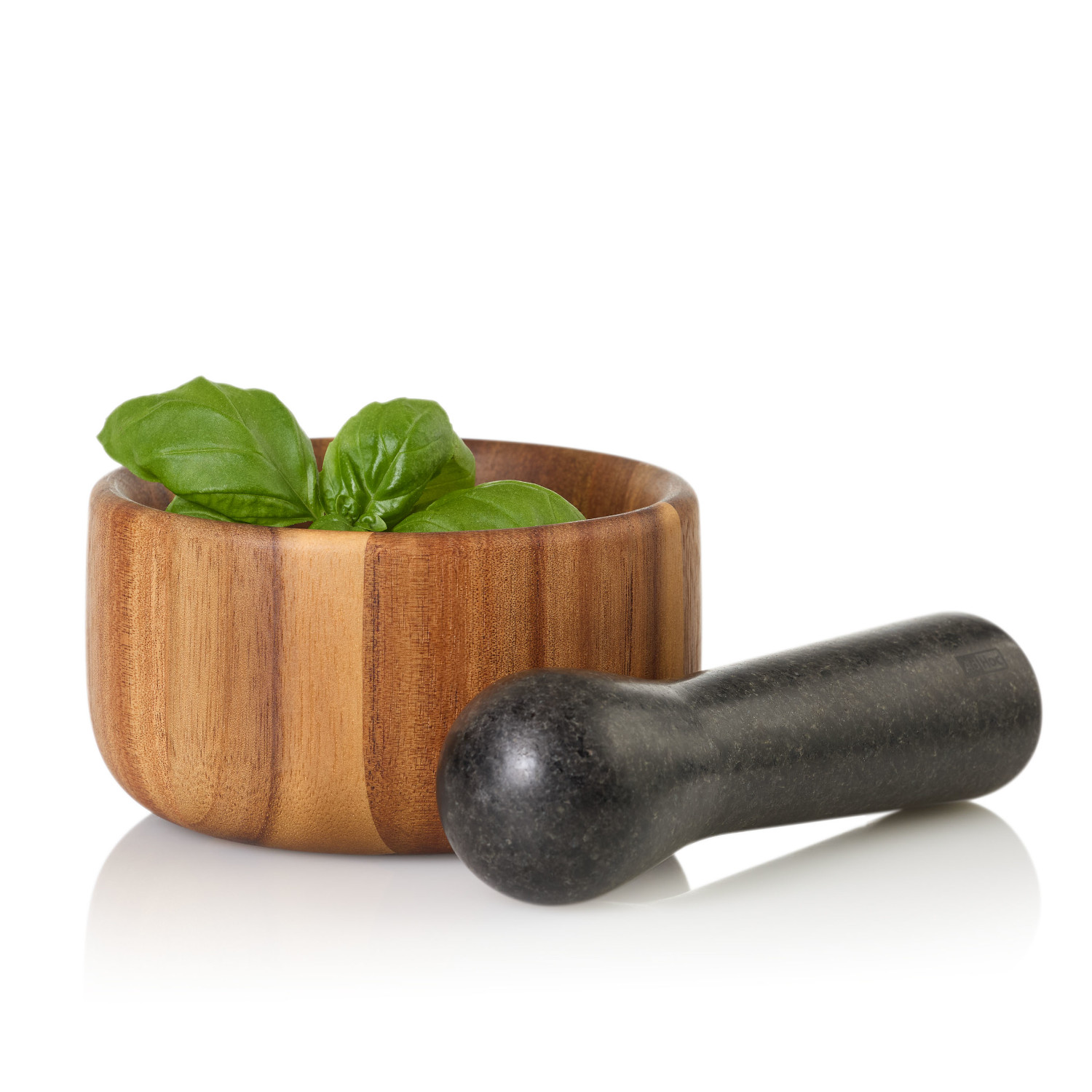 Moździerz Taru o pojemności 190ml, która rozbudzi kuchenną kreatywność. Wykonany z naturalnych materiałów ułatwi miażdżenie i ścieranie zarówno wysuszonych jak i świeżych ziół oraz przypraw, uwalniając pełnię smaków. Kształt tłuczka oraz misy są idealnie dopasowane, aby umożliwić wszechstronne użytkowanie. Miska została wykonana z antybakteryjnego drewna akacjowego, natomiast tłuczek z neutralnego smakowo granitu. Produkt został zaprojektowany przez Rolanda Kreitera. Zaleca się czyścić ręcznie! Materiał: miska drewno akacjowe, granit. Przybliżone wymiary miski: średnica – 11,5cm, wysokość – 6cm. Przybliżone wymiary tłuczka: średnica – 4cm, wysokość – 14cm. Przybliżone wymiary brutto: wysokość – 11,2cm, długość – 11,6cm, szerokość – 12,7cm. Przybliżona waga brutto: 0,596kg. Opakowanie: kartonowe pudełko prezentowe.