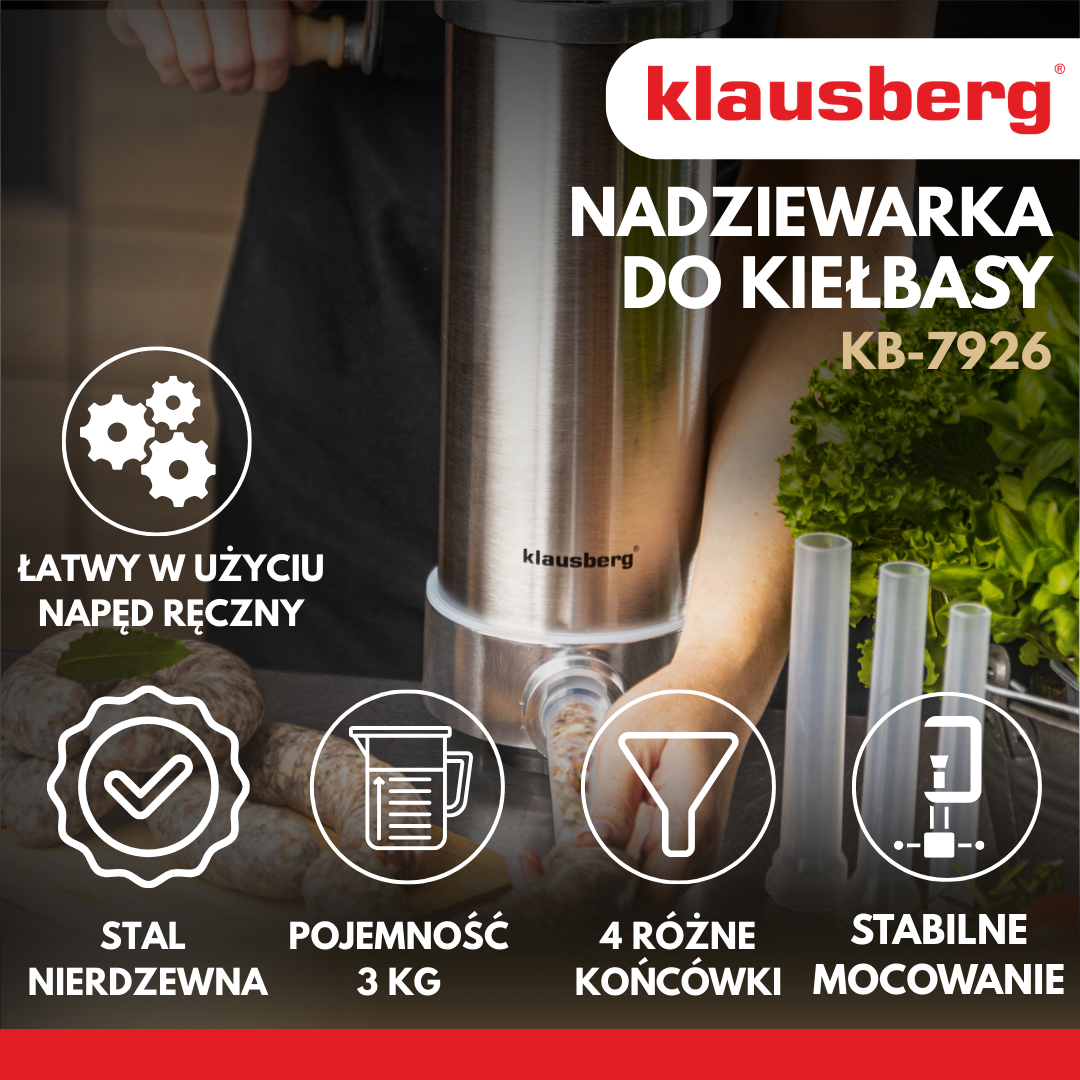 Model KB-7926 to niezawodne rozwiązanie dla osób, które chcą przygotować własne, zdrowe i smaczne kiełbasy w domowych warunkach. Dzięki solidnej konstrukcji i pojemności 3 kg sprawdzi się zarówno przy okazjonalnym, jak i częstszym użytkowaniu.