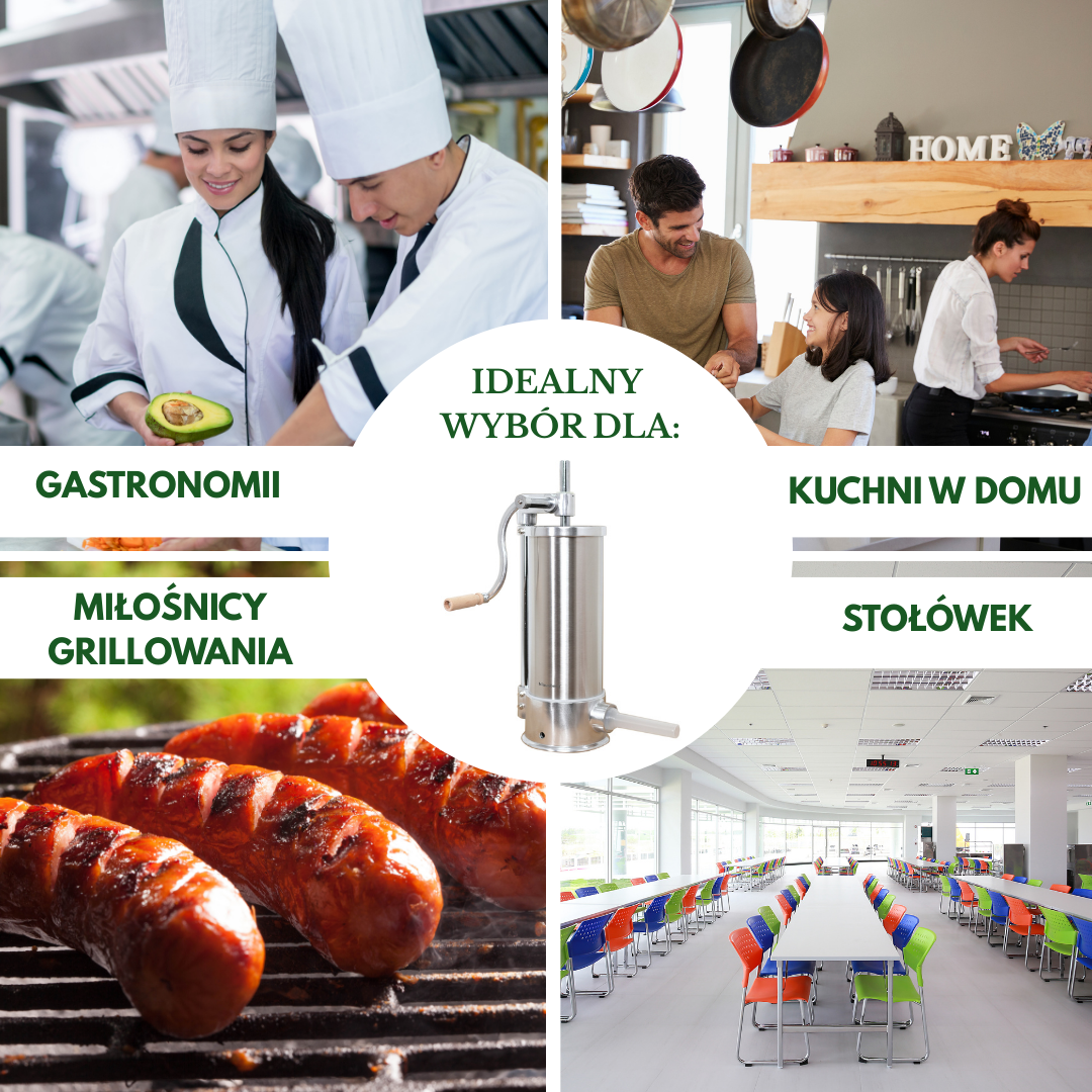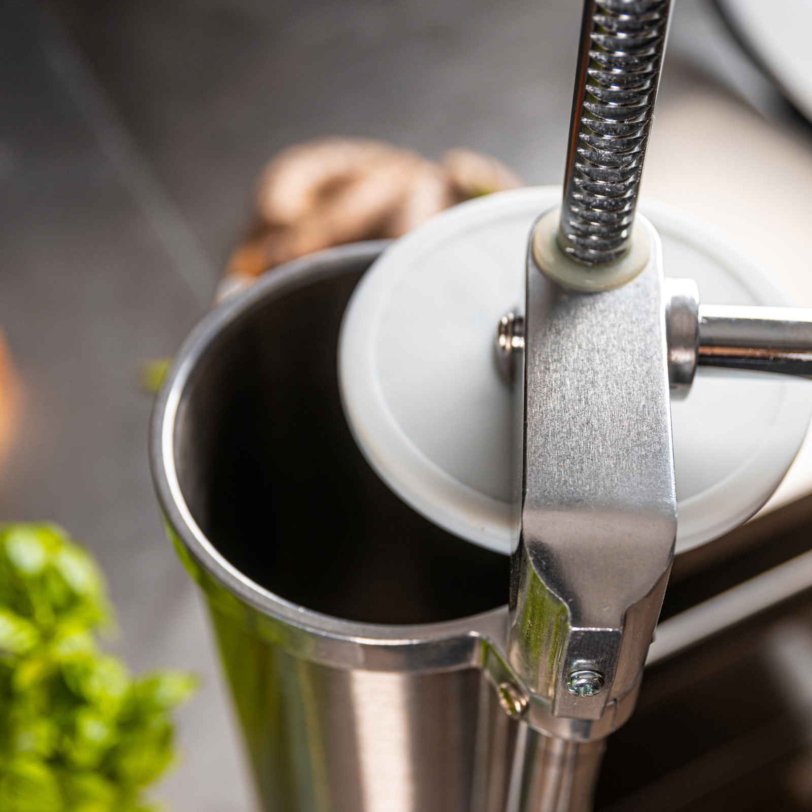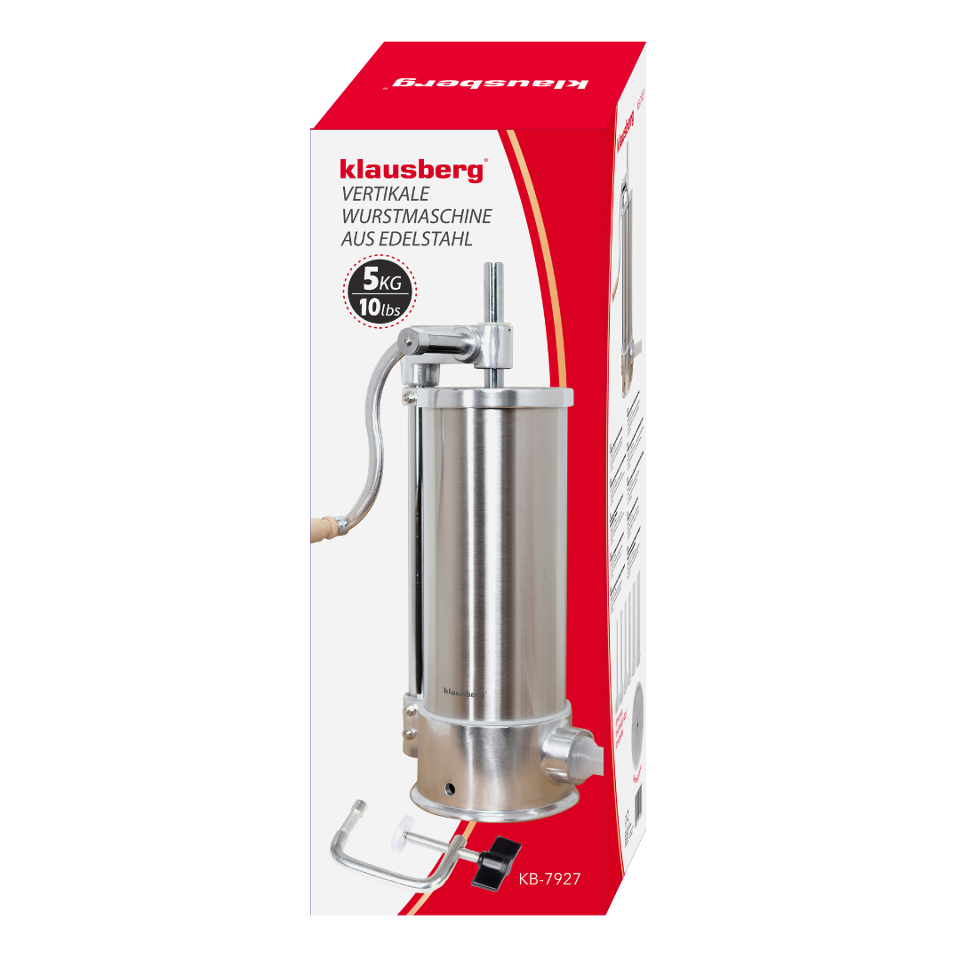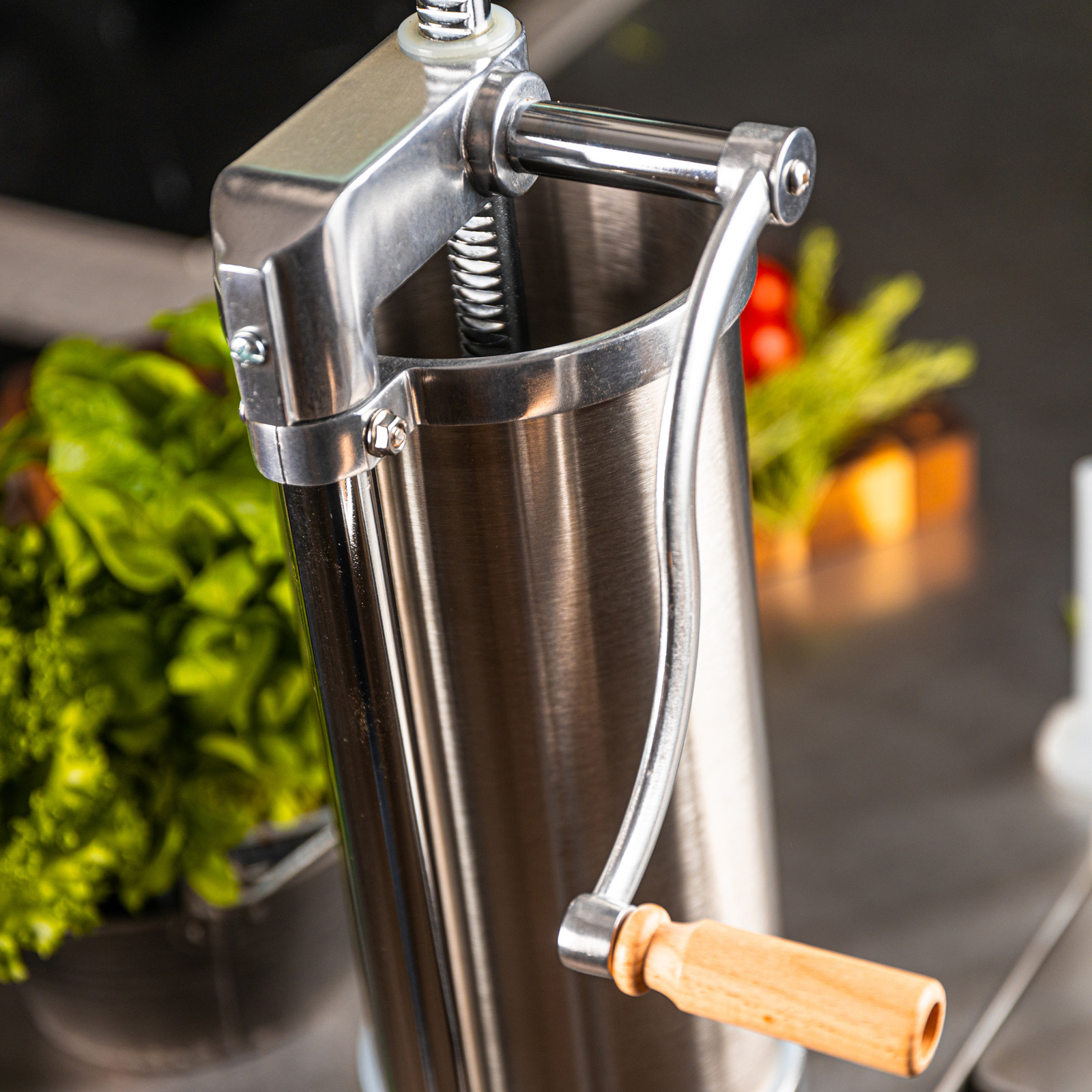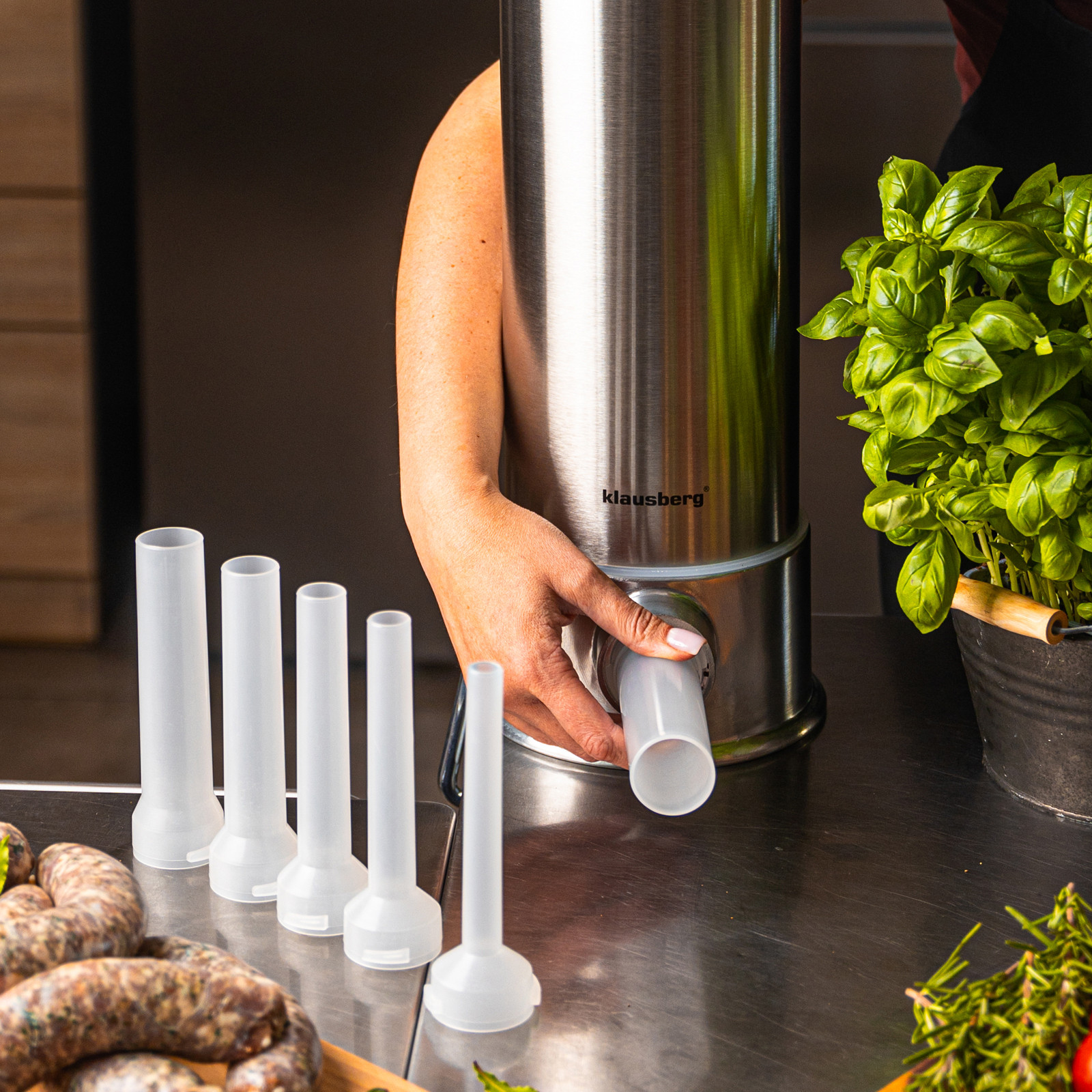 Pionowa nadziewarka do kiełbas Klausberg KB-7927 to profesjonalne i solidne urządzenie, które pozwala w prosty sposób przygotować domowe wyroby mięsne. Wykonana z wysokiej jakości stali nierdzewnej, gwarantuje trwałość, higienę i wygodę użytkowania. Dzięki pojemności 5 kg sprawdzi się zarówno podczas okazjonalnego przygotowania kiełbas w domu, jak i przy większych partiach wyrobów. Pionowa konstrukcja umożliwia wygodne i równomierne napełnianie osłonek, a mocne mocowanie do blatu zapewnia pełną stabilność podczas pracy.