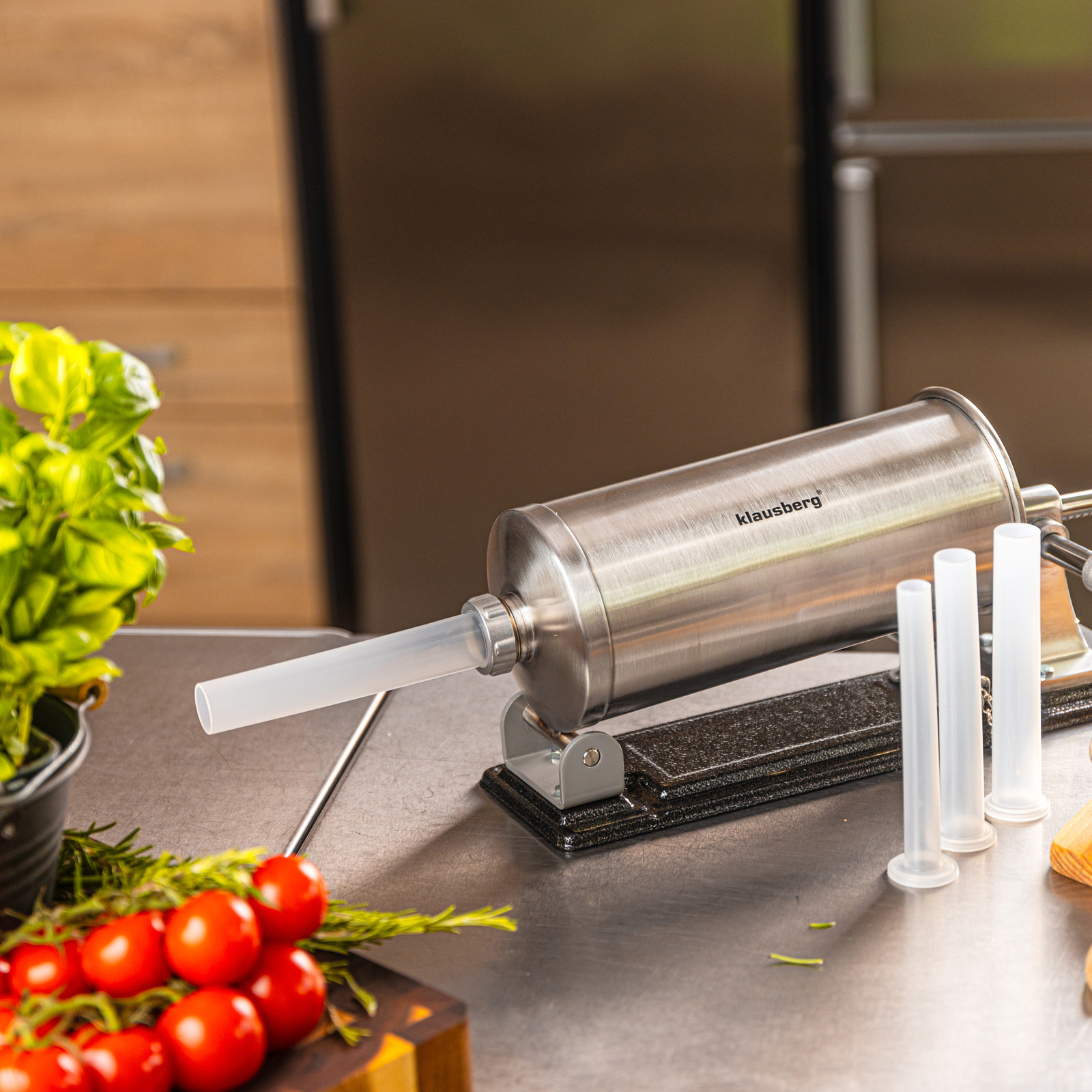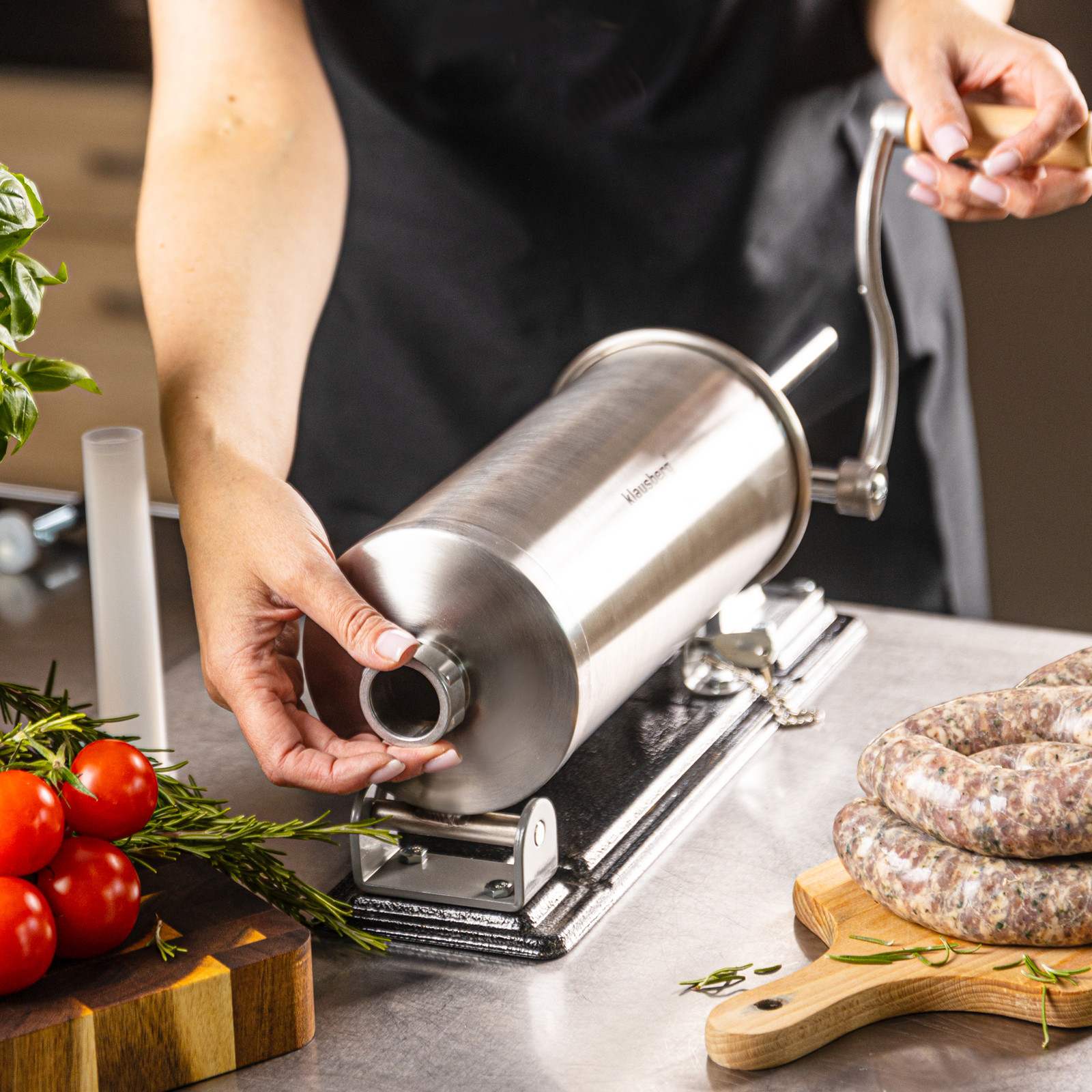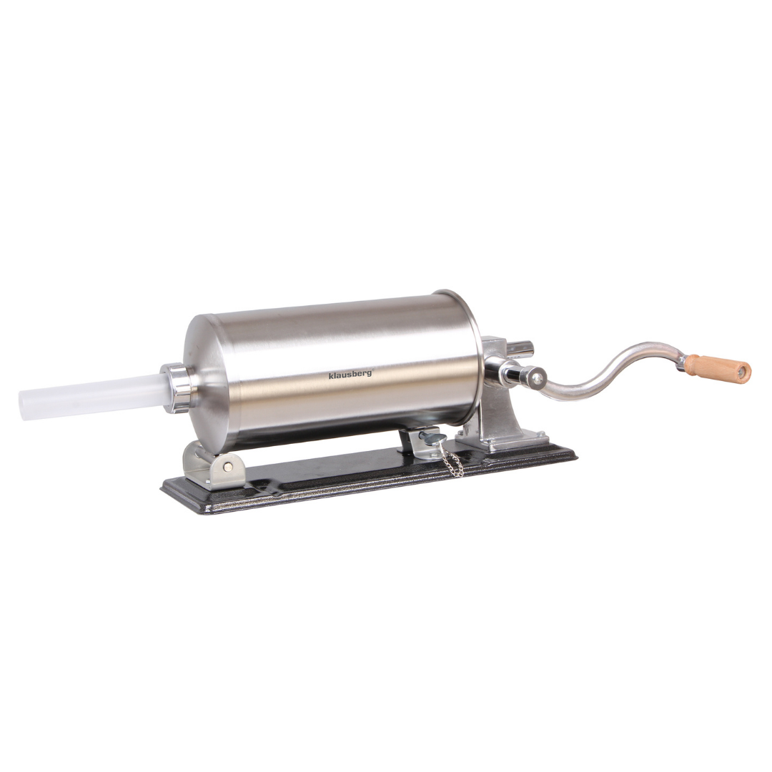 Pozioma nadziewarka do kiełbas Klausberg KB-7929 to solidne i funkcjonalne urządzenie, które ułatwia przygotowanie domowych wyrobów mięsnych. Wykonana z wysokiej jakości stali nierdzewnej, gwarantuje trwałość, higienę oraz wygodę użytkowania. Dzięki dużej pojemności 5 kg sprawdzi się zarówno podczas okazjonalnego przygotowania kiełbas, jak i przy większych partiach domowych wyrobów. Stabilna pozioma konstrukcja i mocne mocowanie do blatu zapewniają komfort i bezpieczeństwo pracy, a ręczna obsługa z wygodną korbką pozwala na pełną kontrolę nad procesem nadziewania.