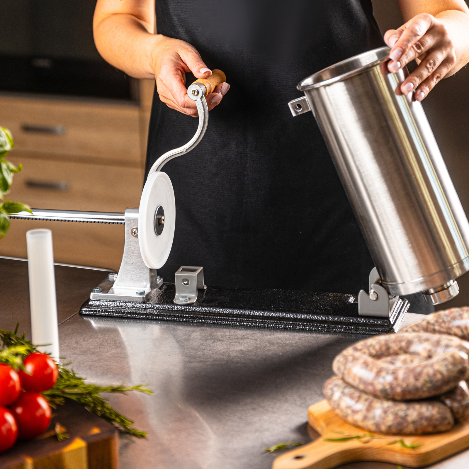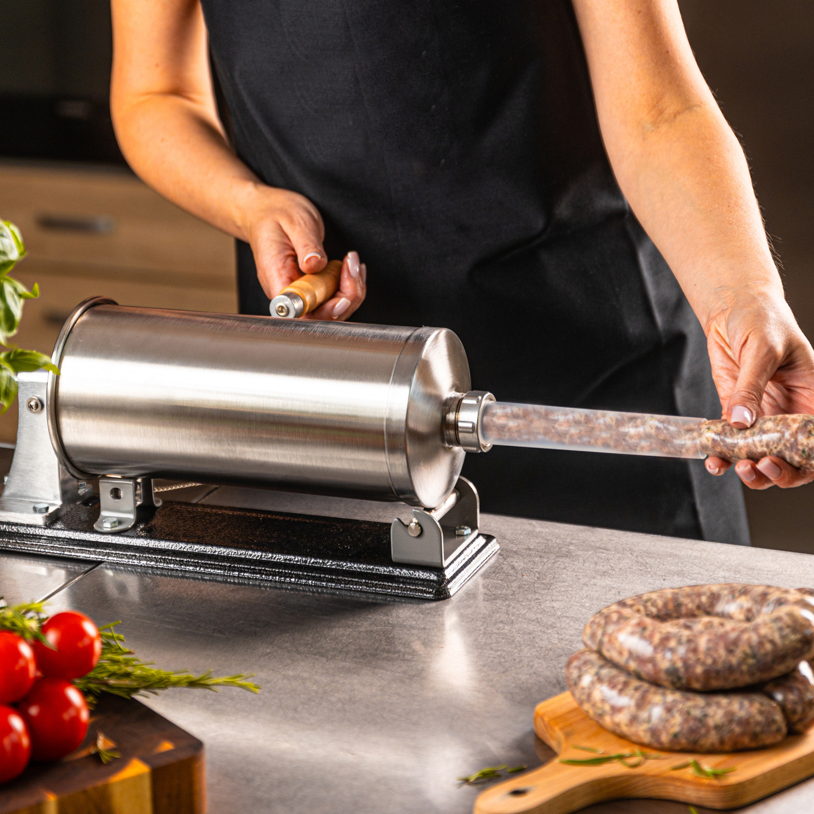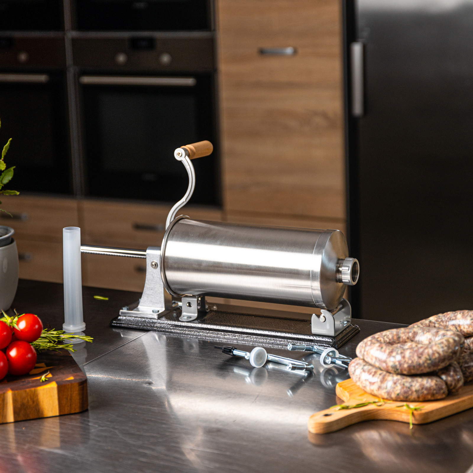 Pozioma nadziewarka do kiełbas Klausberg KB-7929 to solidne i funkcjonalne urządzenie, które ułatwia przygotowanie domowych wyrobów mięsnych. Wykonana z wysokiej jakości stali nierdzewnej, gwarantuje trwałość, higienę oraz wygodę użytkowania. Dzięki dużej pojemności 5 kg sprawdzi się zarówno podczas okazjonalnego przygotowania kiełbas, jak i przy większych partiach domowych wyrobów. Stabilna pozioma konstrukcja i mocne mocowanie do blatu zapewniają komfort i bezpieczeństwo pracy, a ręczna obsługa z wygodną korbką pozwala na pełną kontrolę nad procesem nadziewania.
