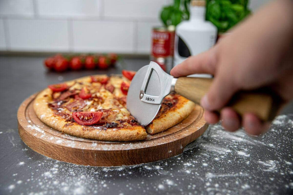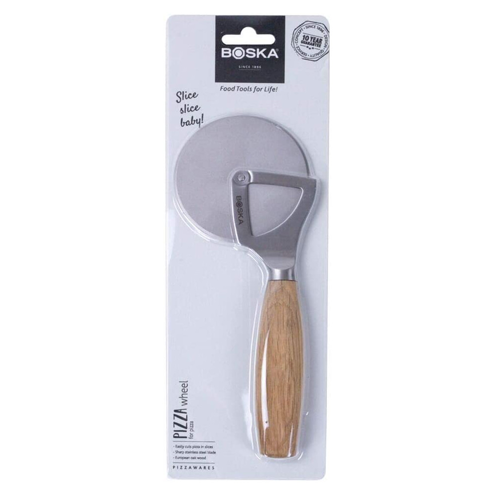 Nóż okrągły do pizzy z drewnianą rękojeścią, nóż został pokryty specjalną powłoką zapobiegająca przywieraniu krojonych produktów. Rękojeść należy regularnie olejować. Zaleca się myc ręcznie, dokładnie wysuszyć po każdym umyciu.