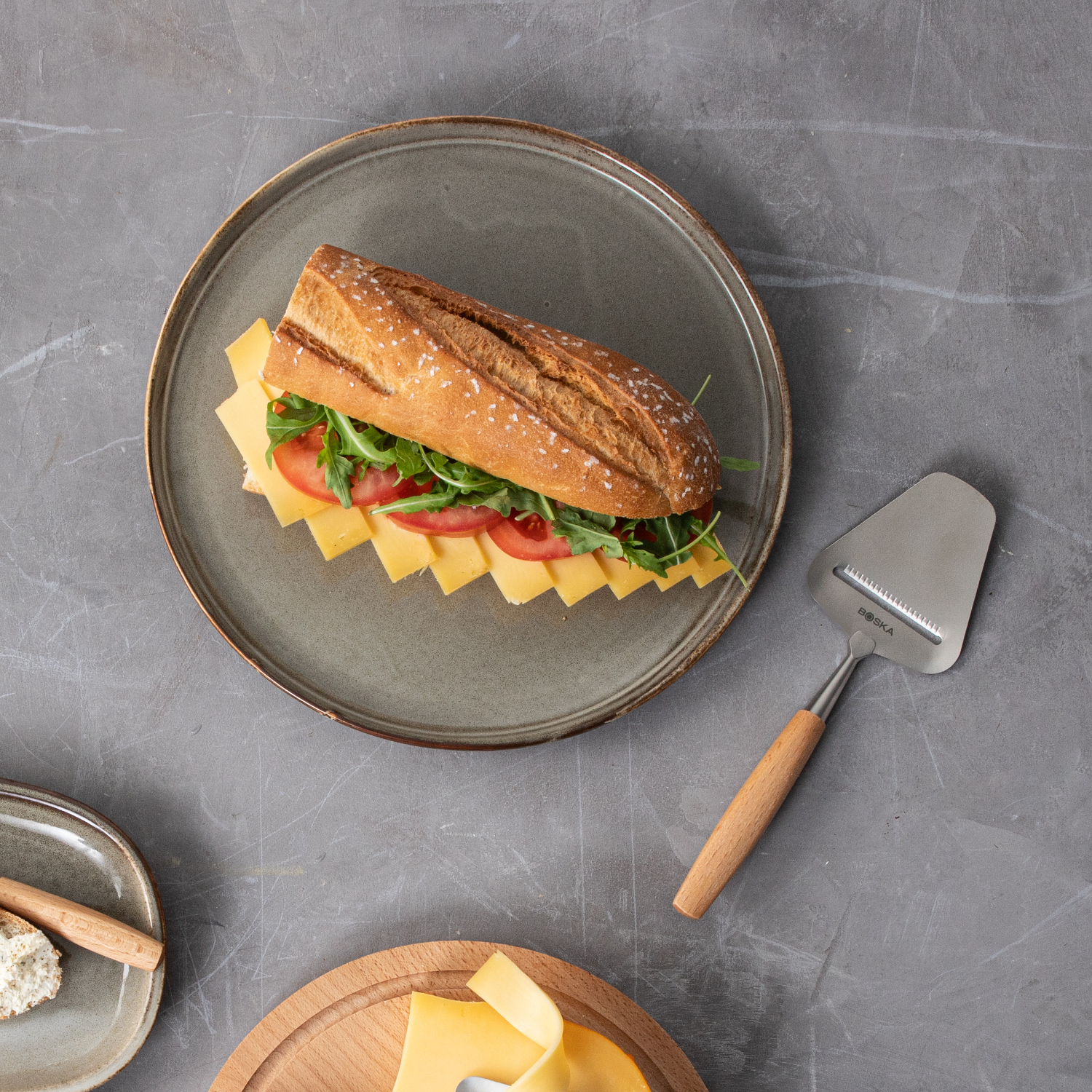 Nóż łopatka z rączką z drewna bukowego nadaje się do serów łagodnych i dojrzałych. Zębate ostrze zostało wykonane ze stali nierdzewnej pokrytej powłoką BSF™ co zapobiega przywieraniu sera podczas krojenia. Zaleca się myć ręcznie. Materiał: stal nierdzewna, drewno bukowe. Przybliżone wymiary: długość – 22,6cm, szerokość całkowita – 7,5cm, szerokość ostrza – 5cm. Przybliżone wymiary brutto: wysokość – 29cm, długość – 9,4cm, szerokość – 1,5cm. Przybliżona waga brutto: 0,114kg. Opakowanie: kartonowe pudełko prezentowe/ zawieszka z okienkiem.