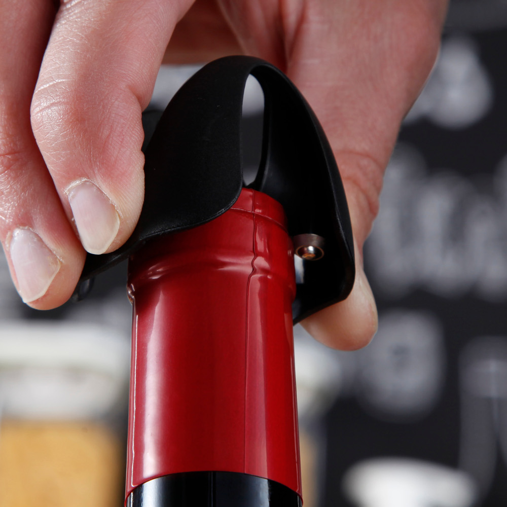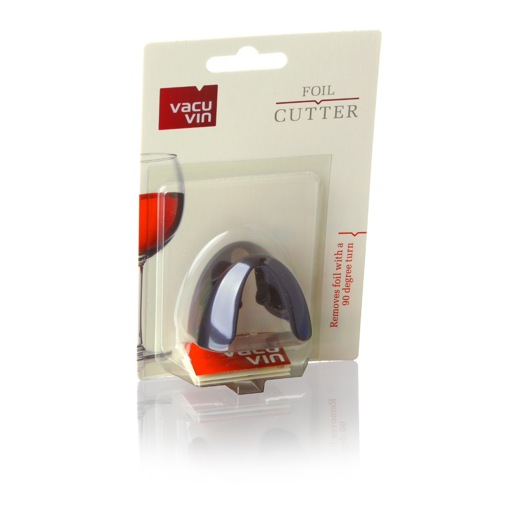 Praktyczny nożyk do folii na butelkach wina. Dzięki czterem ostrzom, wykonanym ze stali nierdzewnej, wystarczy 1/4 obrotu by przeciąć folię.