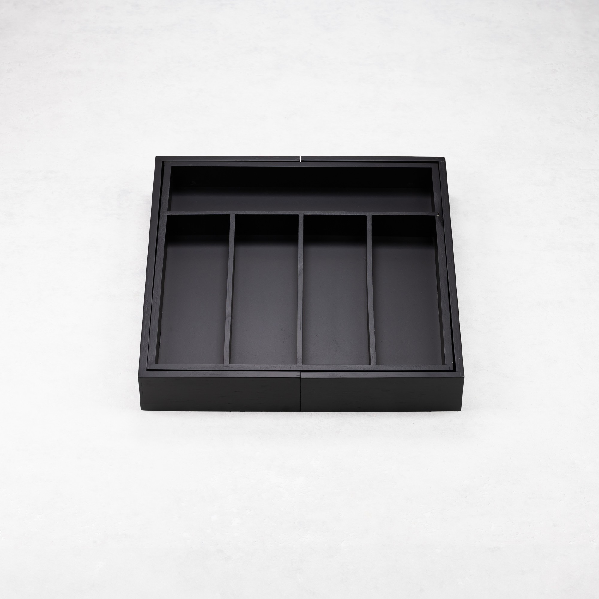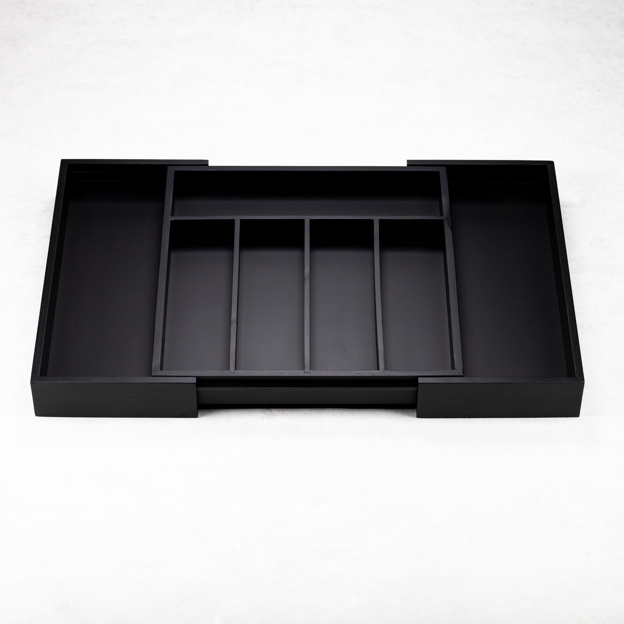 Elegancki i funkcjonalny czarny organizer bambusowy KINGHoff to doskonałe rozwiązanie dla osób ceniących porządek i estetykę w kuchni. Wykonany w 100% z naturalnego drewna bambusowego, łączy trwałość z nowoczesnym designem. Jego rozsuwana konstrukcja pozwala maksymalnie wykorzystać przestrzeń w szufladzie, zapewniając wygodne przechowywanie przyborów kuchennych, narzędzi i sztućców.