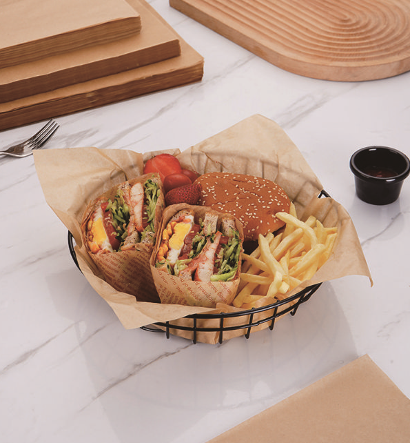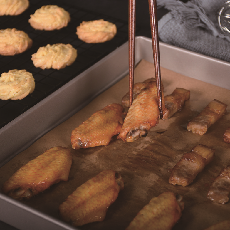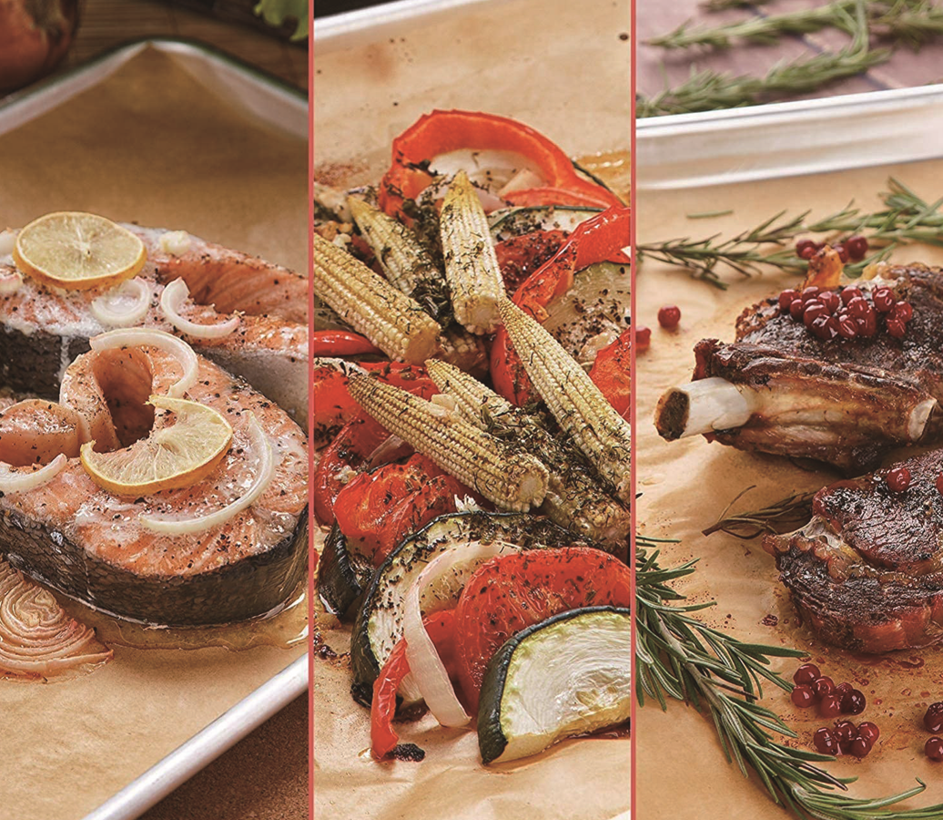 Dzięki odporności na temperatury od -40°C do +230°C (do 428°F), papier sprawdzi się zarówno podczas pieczenia, smażenia, jak i gotowania na parze. Zawsze używaj go razem z jedzeniem – zapobiega przywieraniu potraw, ułatwia utrzymanie urządzeń w czystości i skraca czas sprzątania.