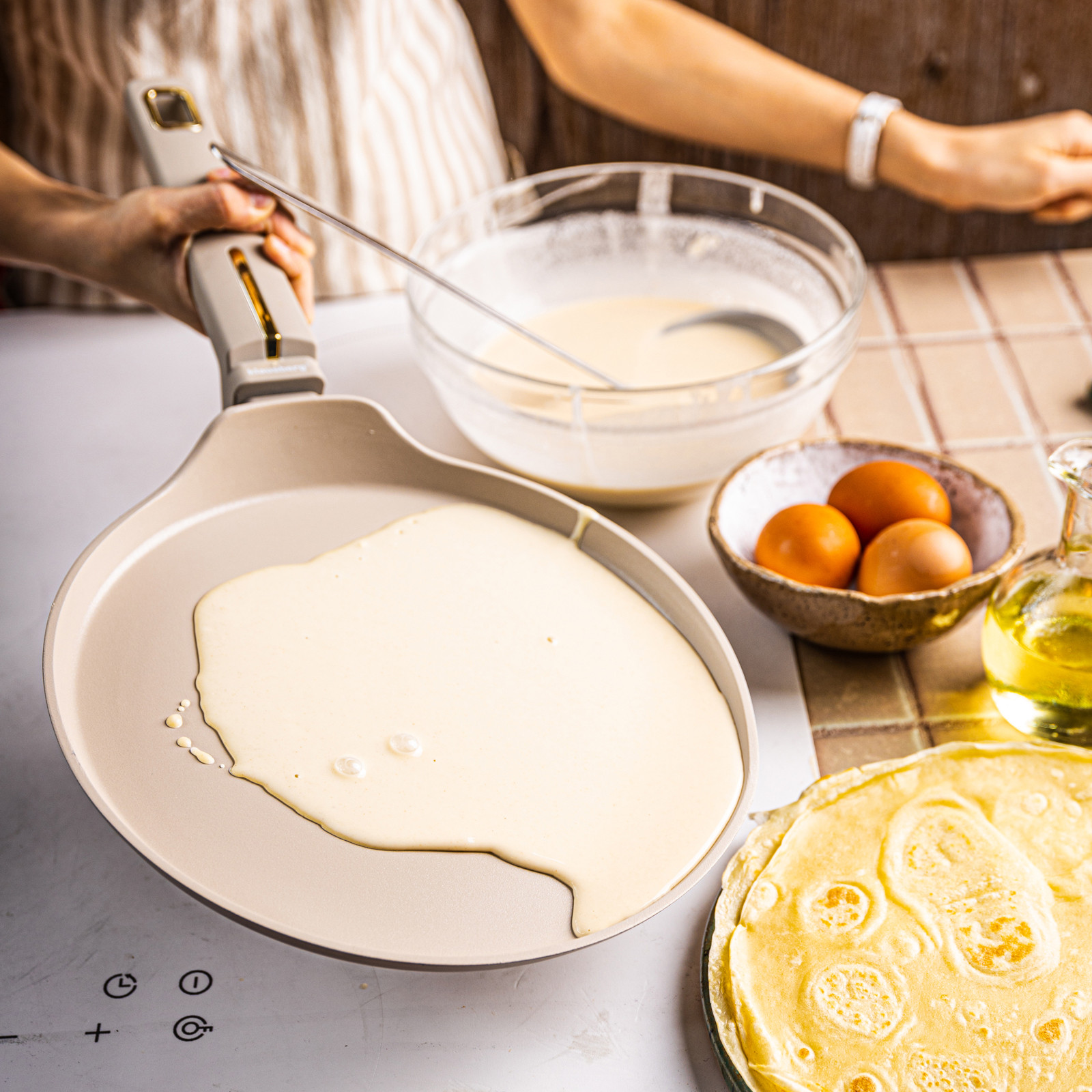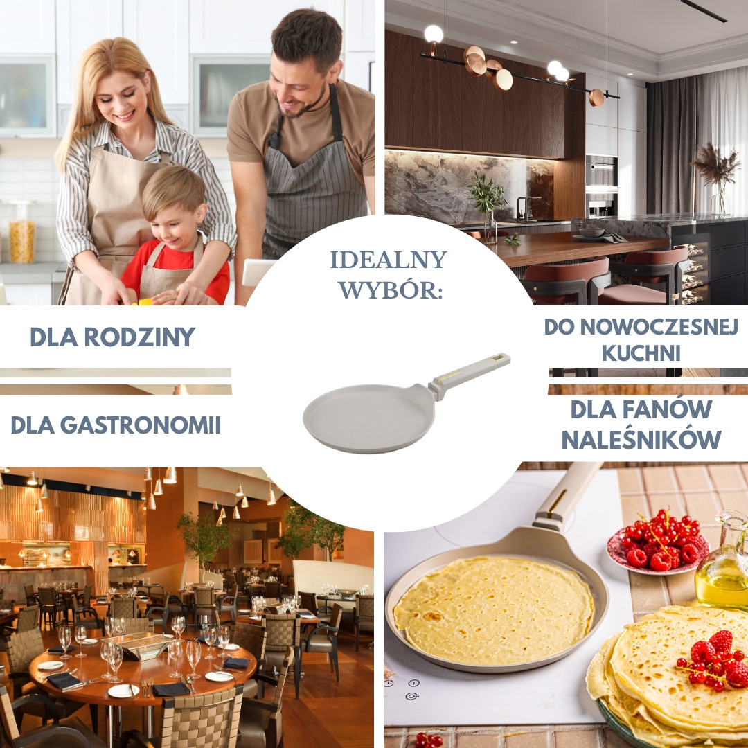 Powłoka nieprzywierająca zapewnia smażenie bez przypaleń, co jest szczególnie ważne przy cienkich naleśnikach. Można ją wykorzystać także do przygotowywania omletów, tortilli, wrapów, jajek sadzonych, a nawet placków ziemniaczanych.