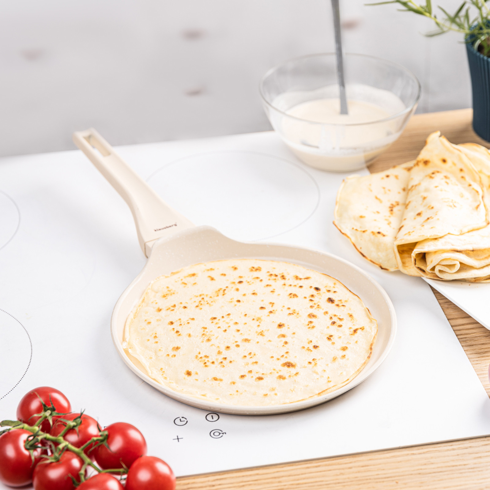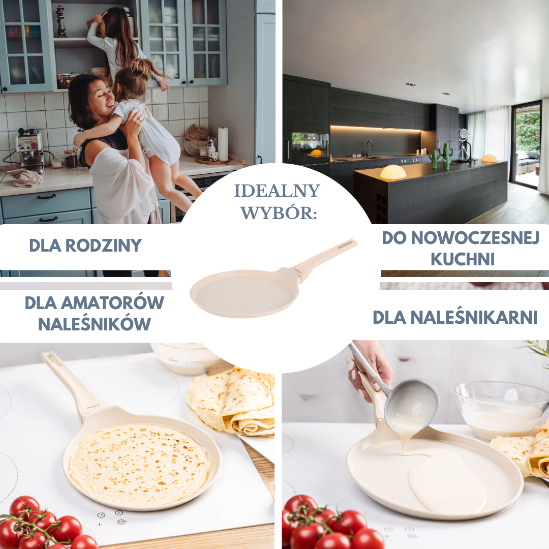 • Niskie ścianki i szeroki rant – wygodne nalewanie i przewracanie naleśników.