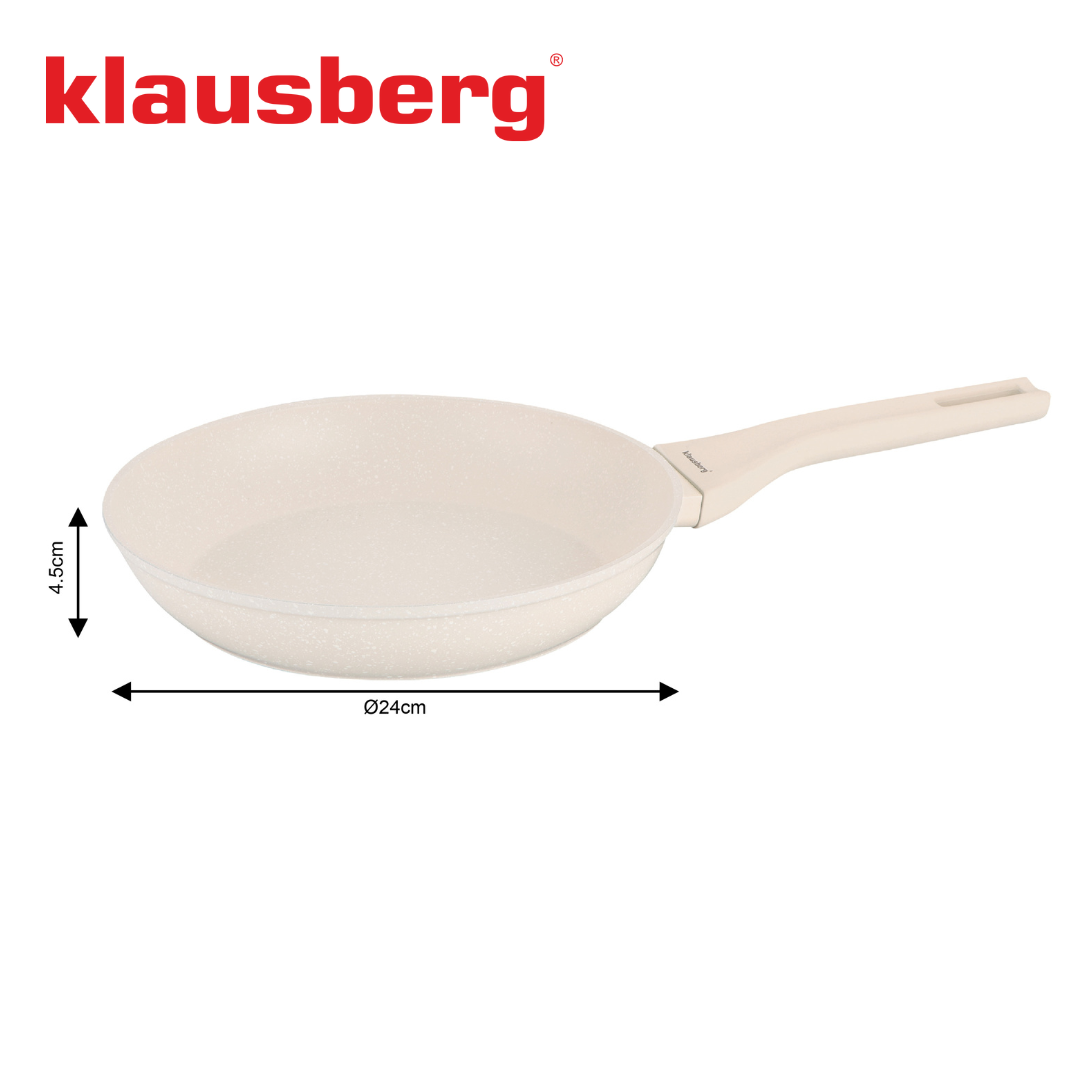 Klausberg KB-7989 to elegancka, kremowa patelnia o średnicy 24 cm, idealna do przygotowywania codziennych potraw — od mięsa i ryb, po warzywa, jajka i naleśniki. Marmurowa powłoka non-stick gwarantuje komfortowe smażenie bez przywierania oraz możliwość ograniczenia ilości tłuszczu. Jasny kolor z delikatnym wzorem sprawia, że patelnia świetnie komponuje się z nowoczesnymi, jasnymi kuchniami. To naczynie, które sprawdzi się zarówno w domu, jak i w kuchniach, gdzie liczy się niezawodność sprzętu.
