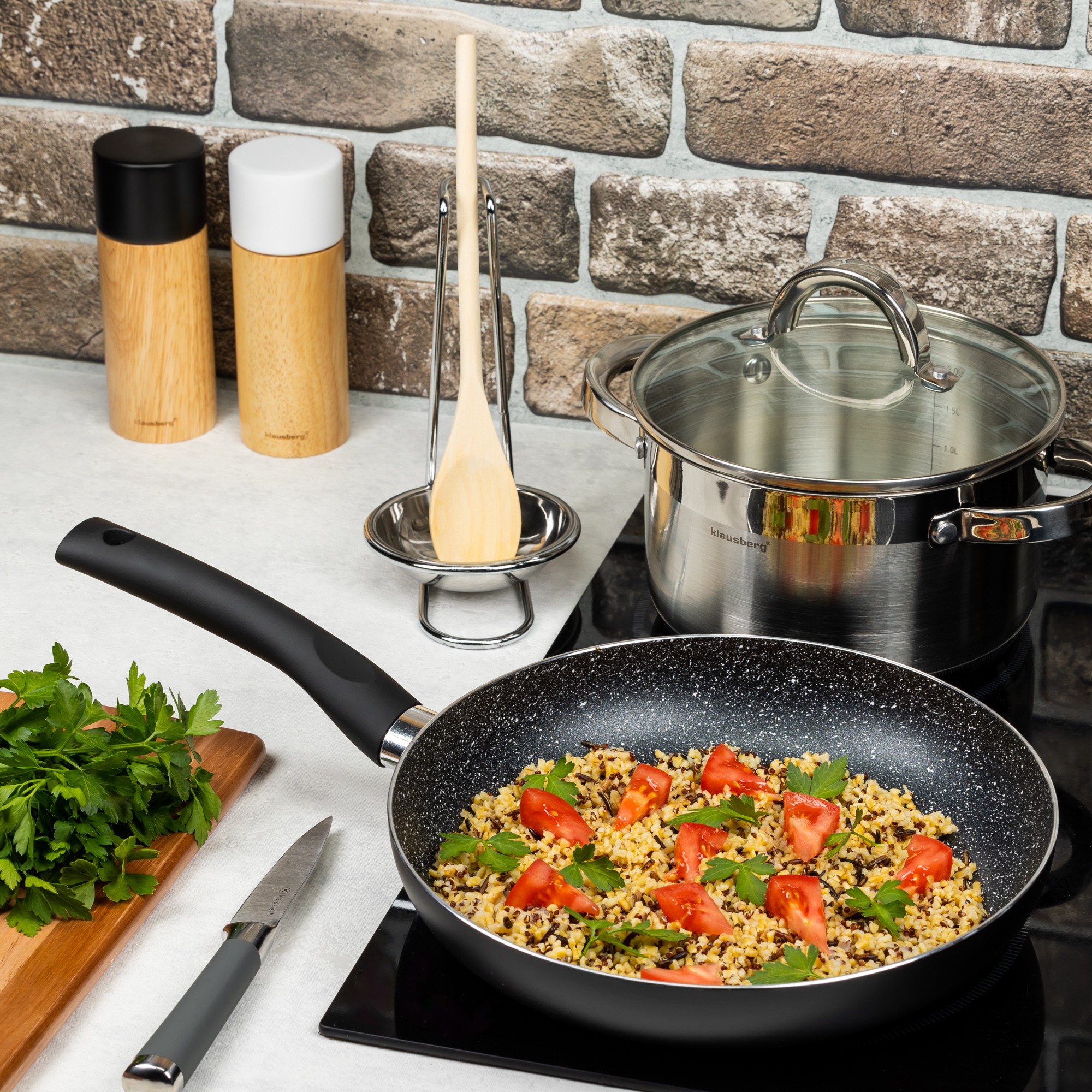 Patelnia pokryta specjalną powłoką ceramiczną-marmurową, która posiada właściwości antyadhezyjne – zapobiega przywieraniu, jest odporna na ścieranie i wysokie temperatury,