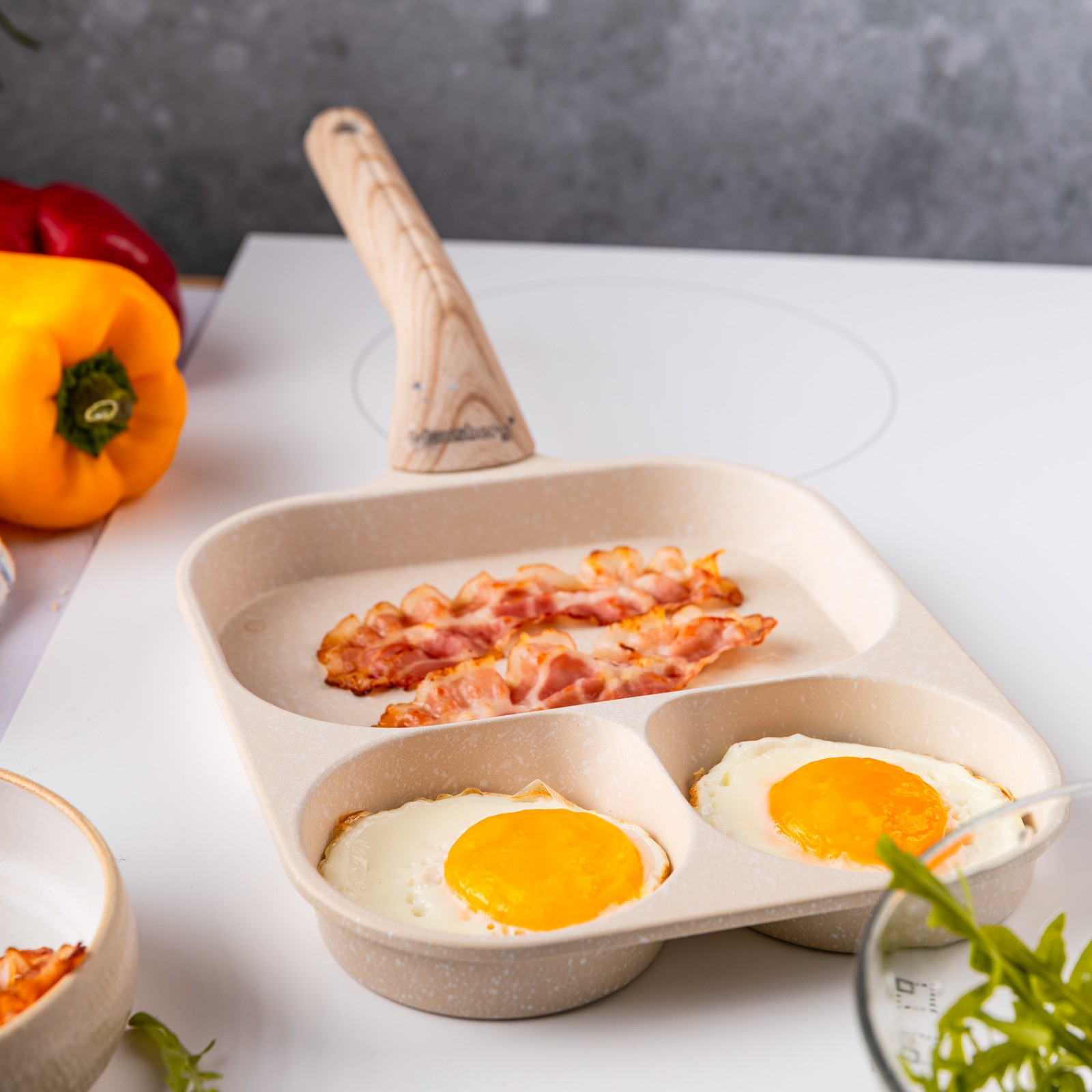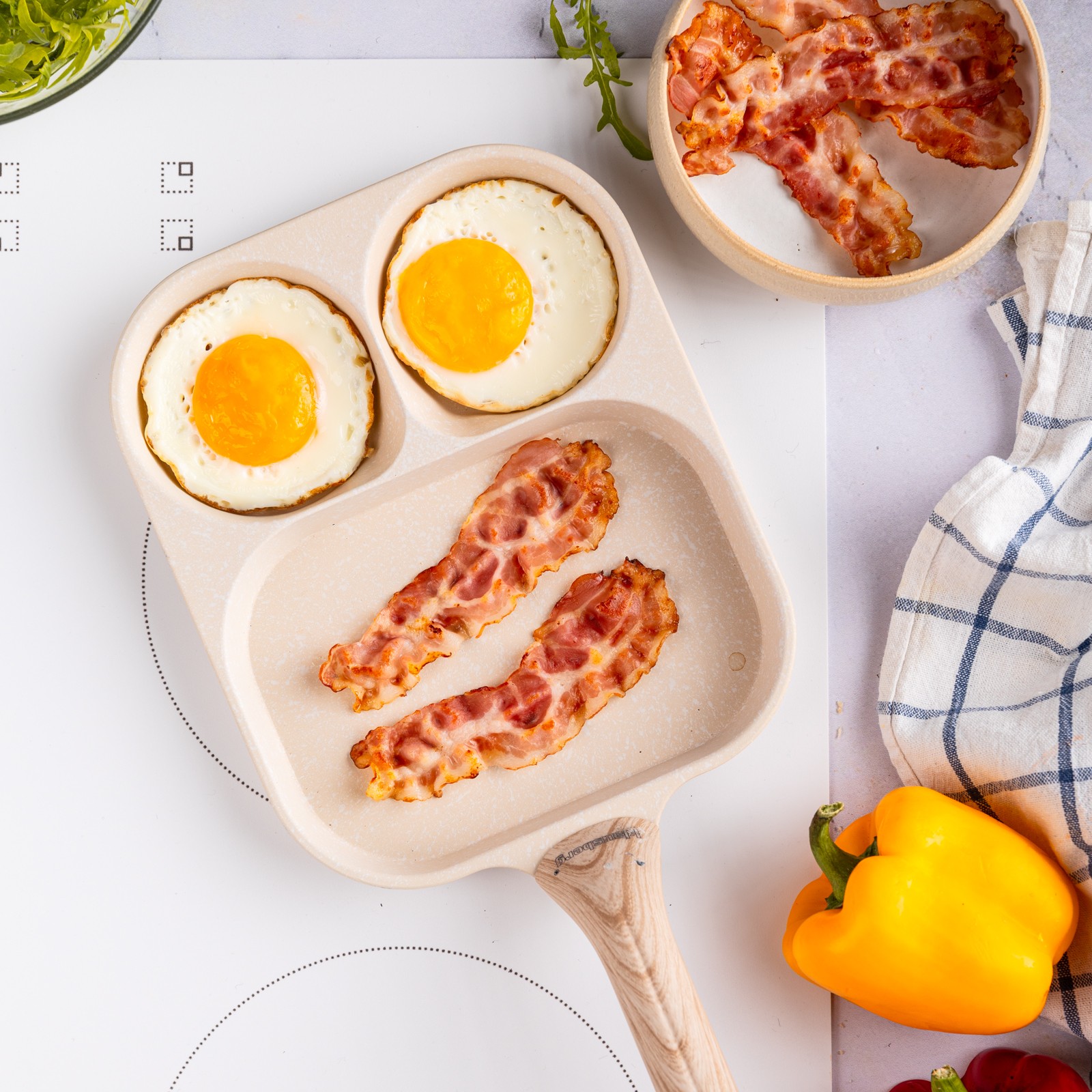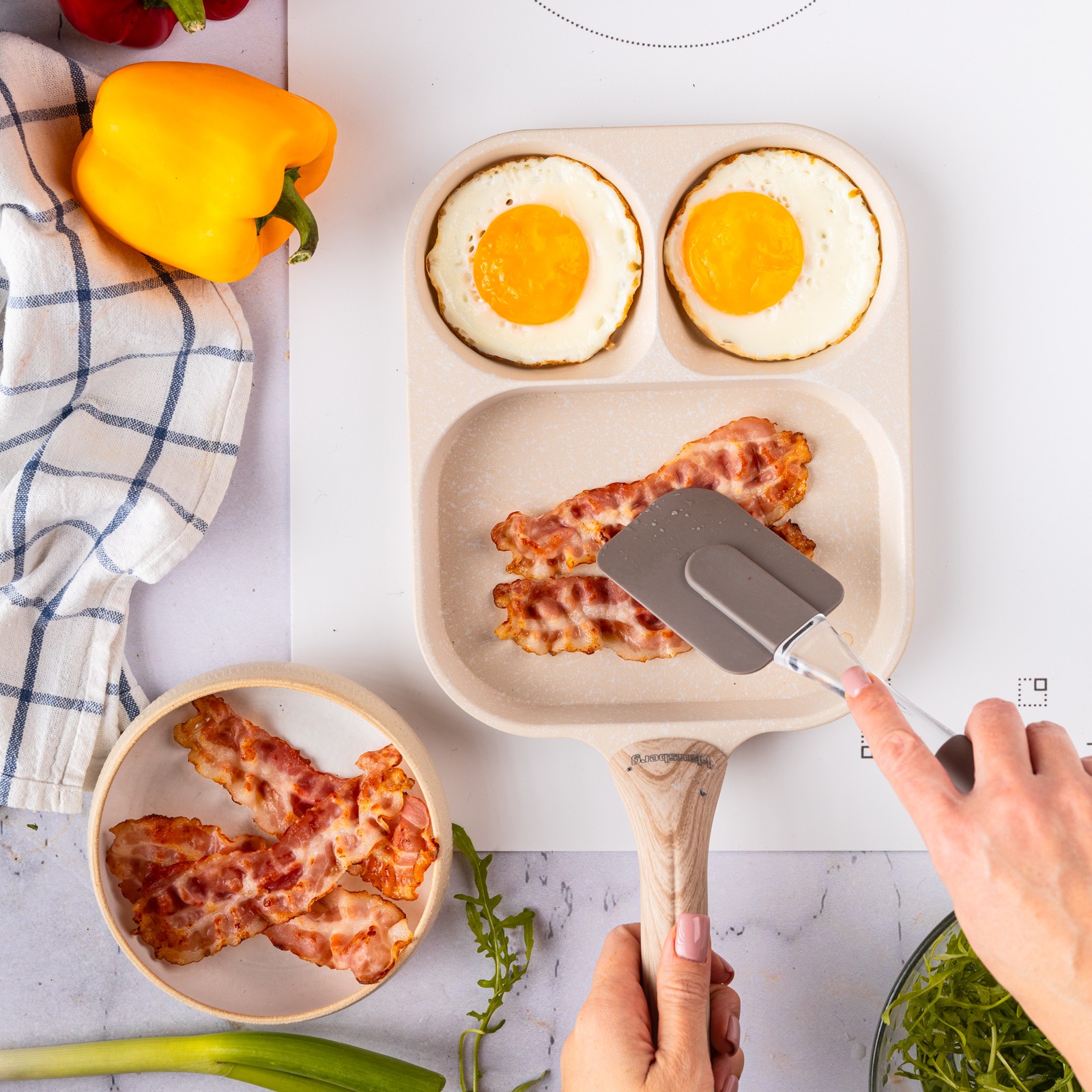 3. Zaprojektowany kształt z 3 formami: 2 do przyrządzania jajek, 1 podłużna do bekonu lub warzyw, mini naleśników, burgerów lub dowolnego innego przepisu, który lubisz podawać na codzienne śniadanie.