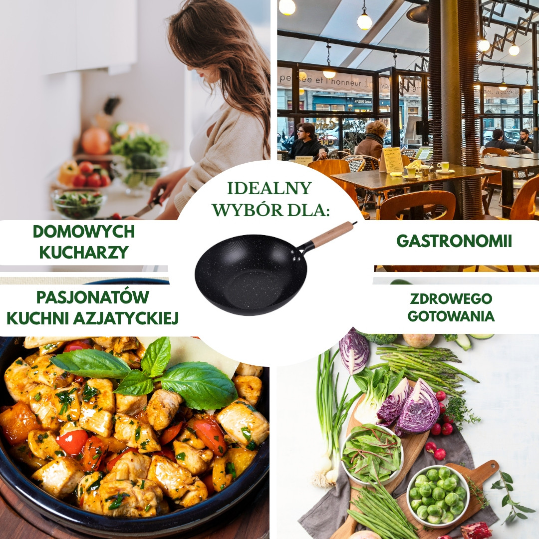 Dzięki płaskiemu dnu WOK zachowuje stabilność na każdej kuchence, a drewniany uchwyt gwarantuje pewny chwyt i bezpieczeństwo podczas gotowania. To uniwersalne naczynie, które sprawdzi się zarówno w kuchni azjatyckiej, jak i w codziennym gotowaniu w domu.