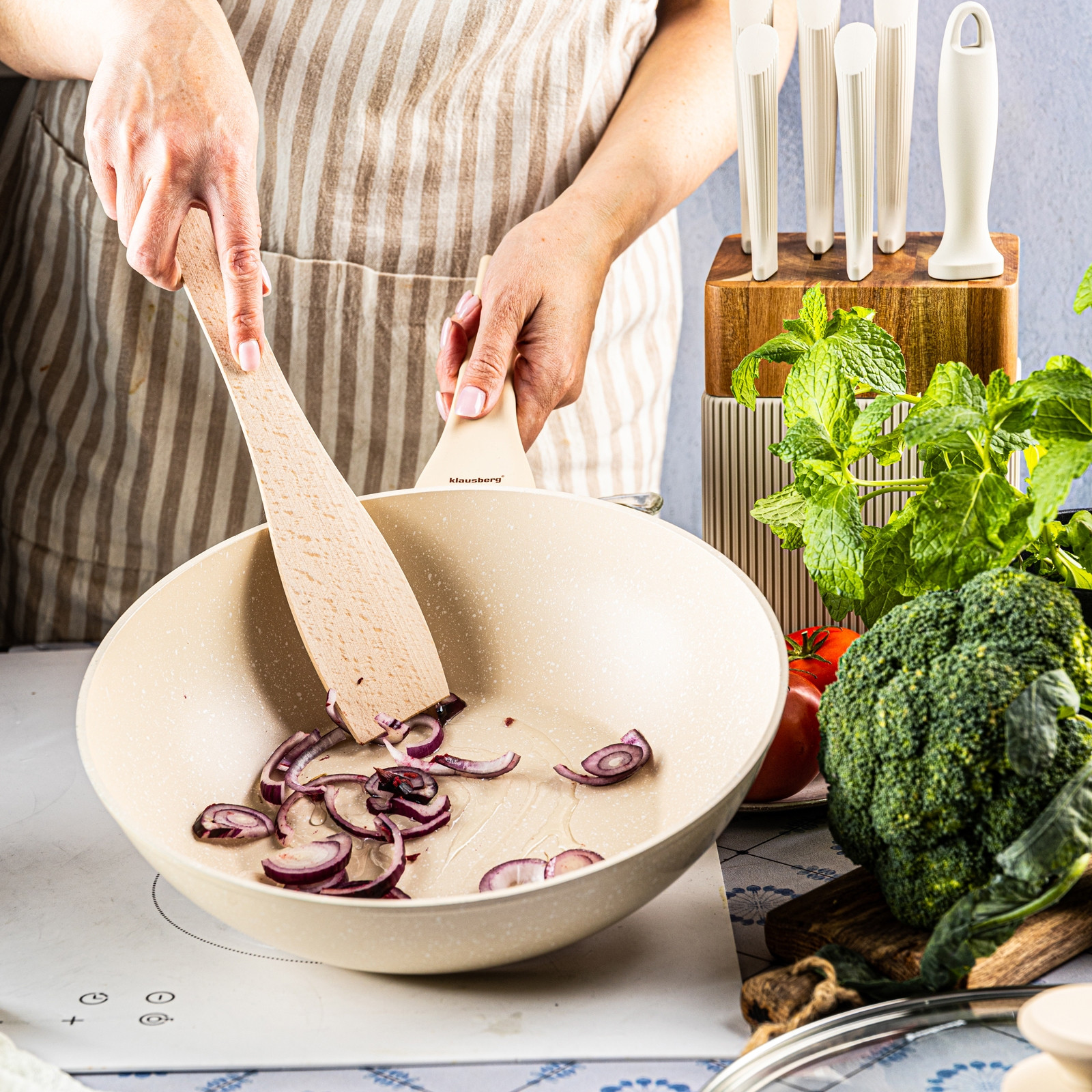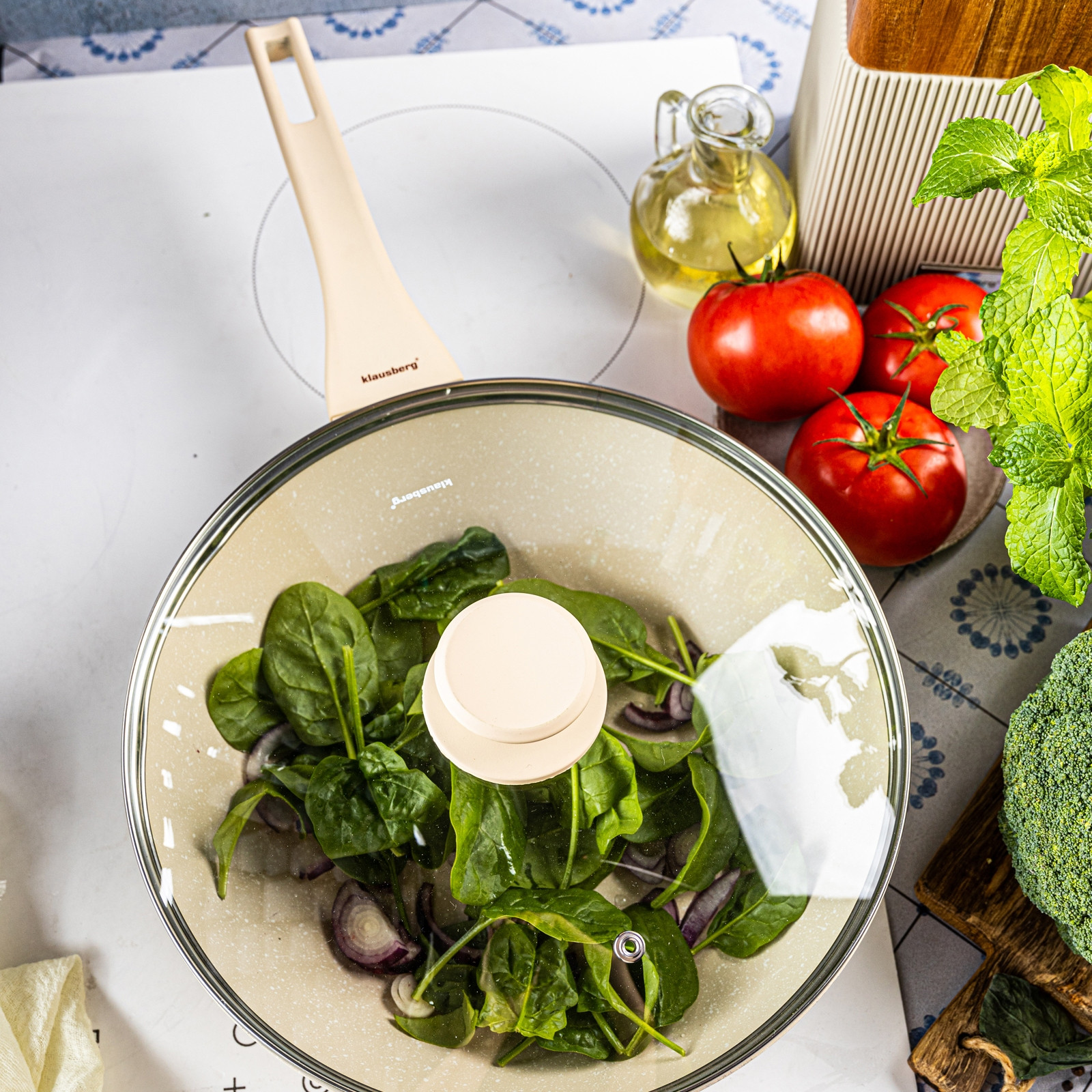 Klausberg KB-7991 to elegancka patelnia WOK o średnicy 28 cm, wyposażona w pokrywkę i zaprojektowana z myślą o wygodnym, zdrowym gotowaniu. Wysokie ścianki oraz pojemność około 3,9 litra sprawiają, że bez trudu przyrządzisz w niej pełne dania: warzywa stir-fry, makarony, mięsa, zupy, a także potrawy jednogarnkowe dla całej rodziny. Marmurowa powłoka nieprzywierająca pozwala ograniczyć ilość tłuszczu, a hartowana pokrywka umożliwia duszenie oraz utrzymanie temperatury.