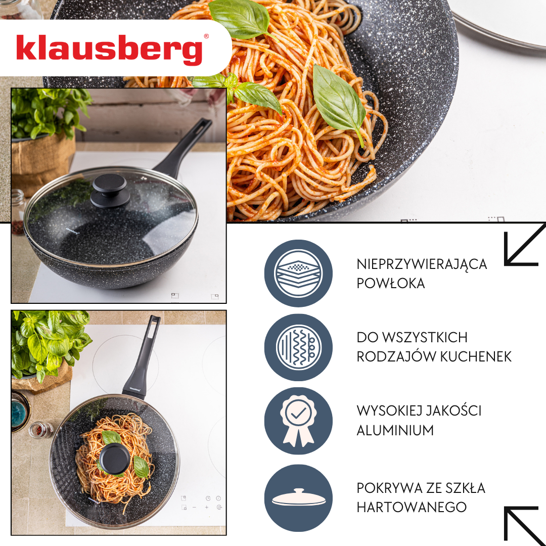 Klausberg to producent akcesoriów kuchennych, który łączy nowoczesne technologie z funkcjonalnym designem. W ofercie marki znajdziesz garnki Klausberg ze stali nierdzewnej, zestawy garnków z powłoką marmurową, patelnie z nieprzywierającą powłoką oraz praktyczne akcesoria kuchenne Klausberg do gotowania, smażenia i pieczenia. Dzięki zastosowaniu wysokiej jakości materiałów – stali szlachetnej i aluminium z powłoką marmurkową – naczynia równomiernie rozprowadzają ciepło i są przystosowane do wszystkich typów kuchenek, w tym płyt indukcyjnych.