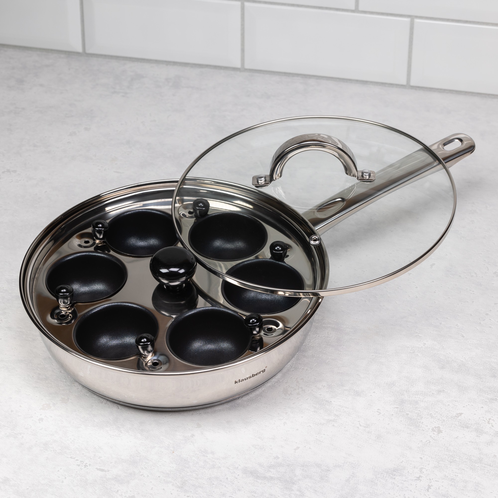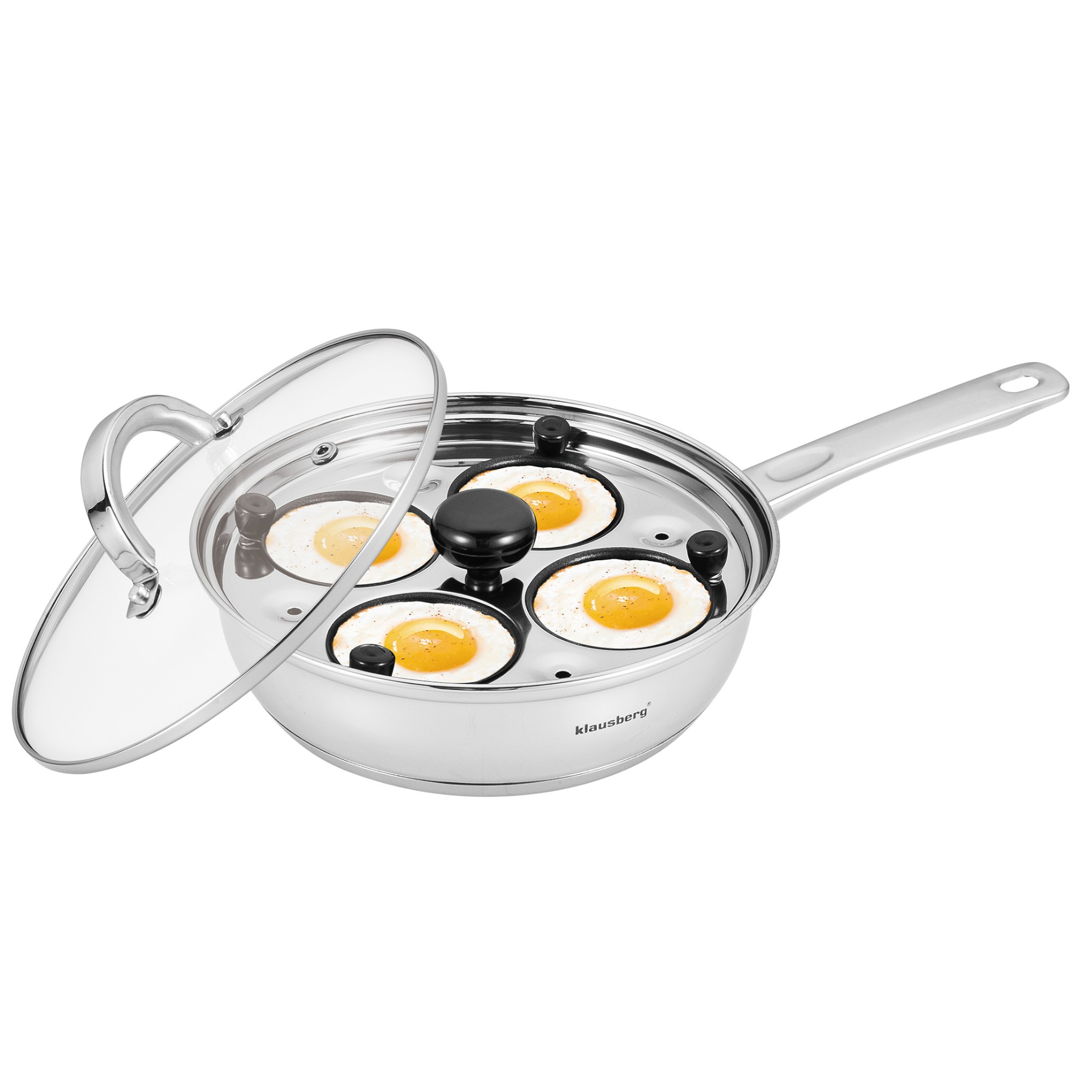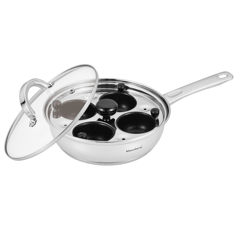 Patelnia wykonana ze stali nierdzewnej. Praktyczne wgłębienia wykończone powłoką nieprzywierającą są łatwe w czyszczeniu i pozwalają w łatwy sposób usmażyć jajka z małą ilością tłuszczu lub ugotować jajka w koszulkach. W wyjmowanych pojemnikach można również przygotować inne przysmak.