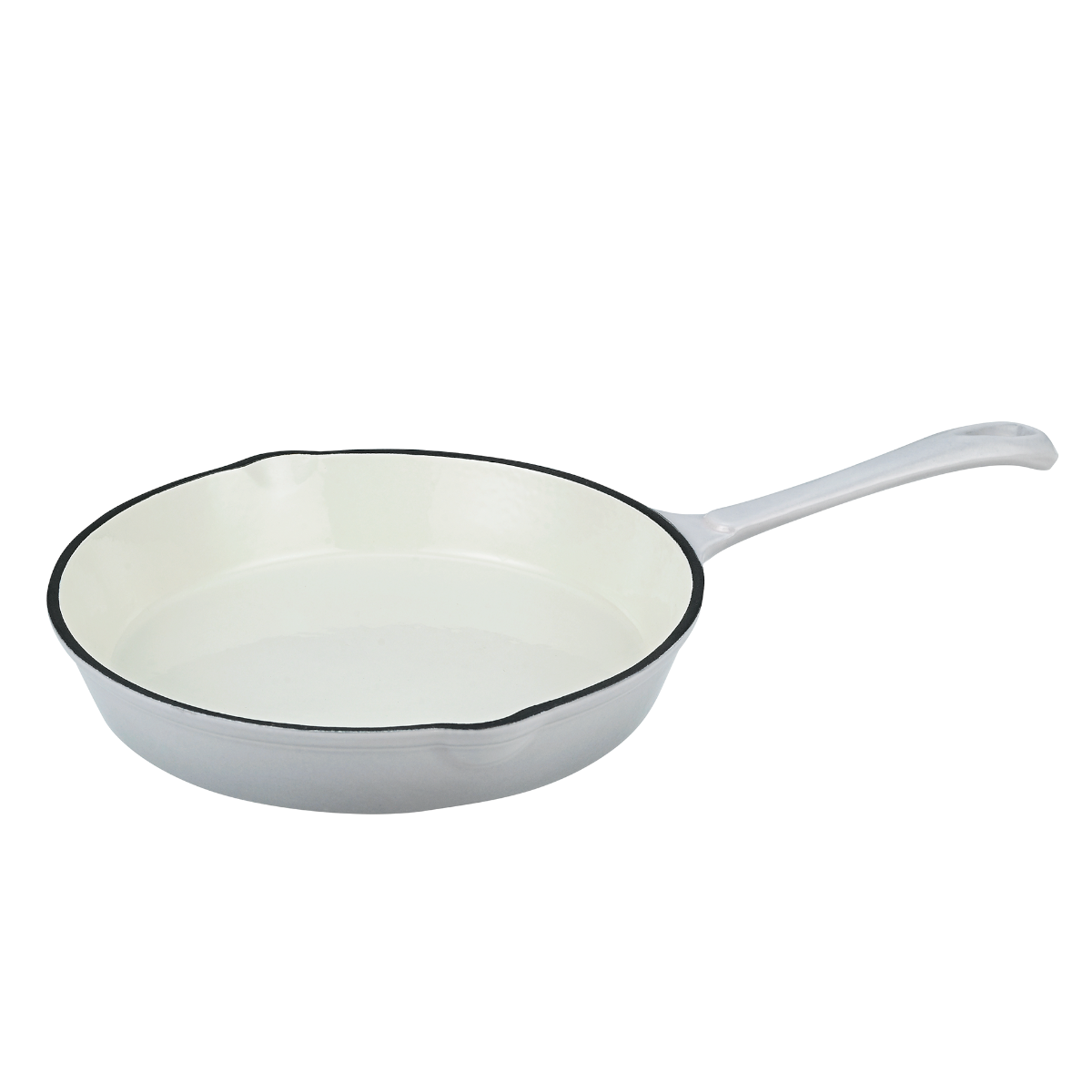 Z zewnątrz patelnia pokryta warstwą białej, żaroodpornej emalii. Od środka warstwa beżowej emalii.