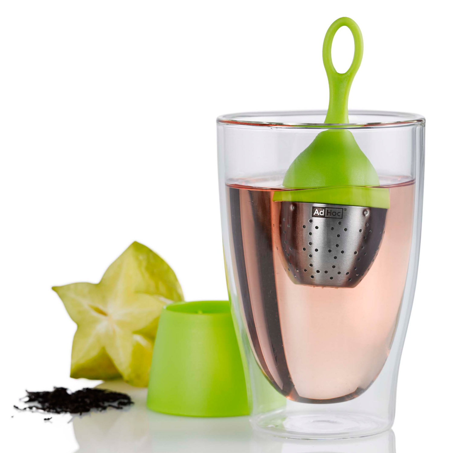 Jedyny w swoim rodzaju zaparzacz do herbaty na świecie. Można go bardzo łatwo otworzyć i napełnić, a zawarta w zestawie podstawka zbierze wszystkie krople po zakończeniu parzenia. Można myć w zmywarce. Produkt został zaprojektowany przez AdHoc Design Team. Materiał: stal nierdzewna, plastik. Wymiary: średnica – 4cm, wysokość – 12,5cm.