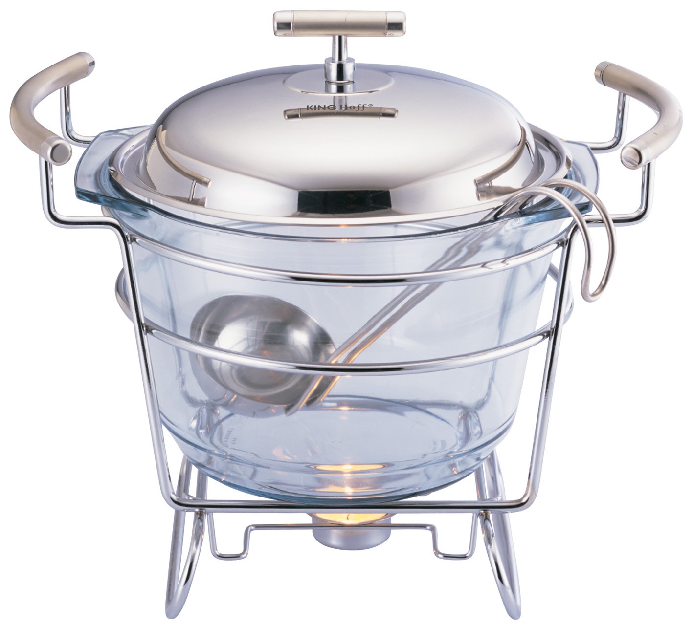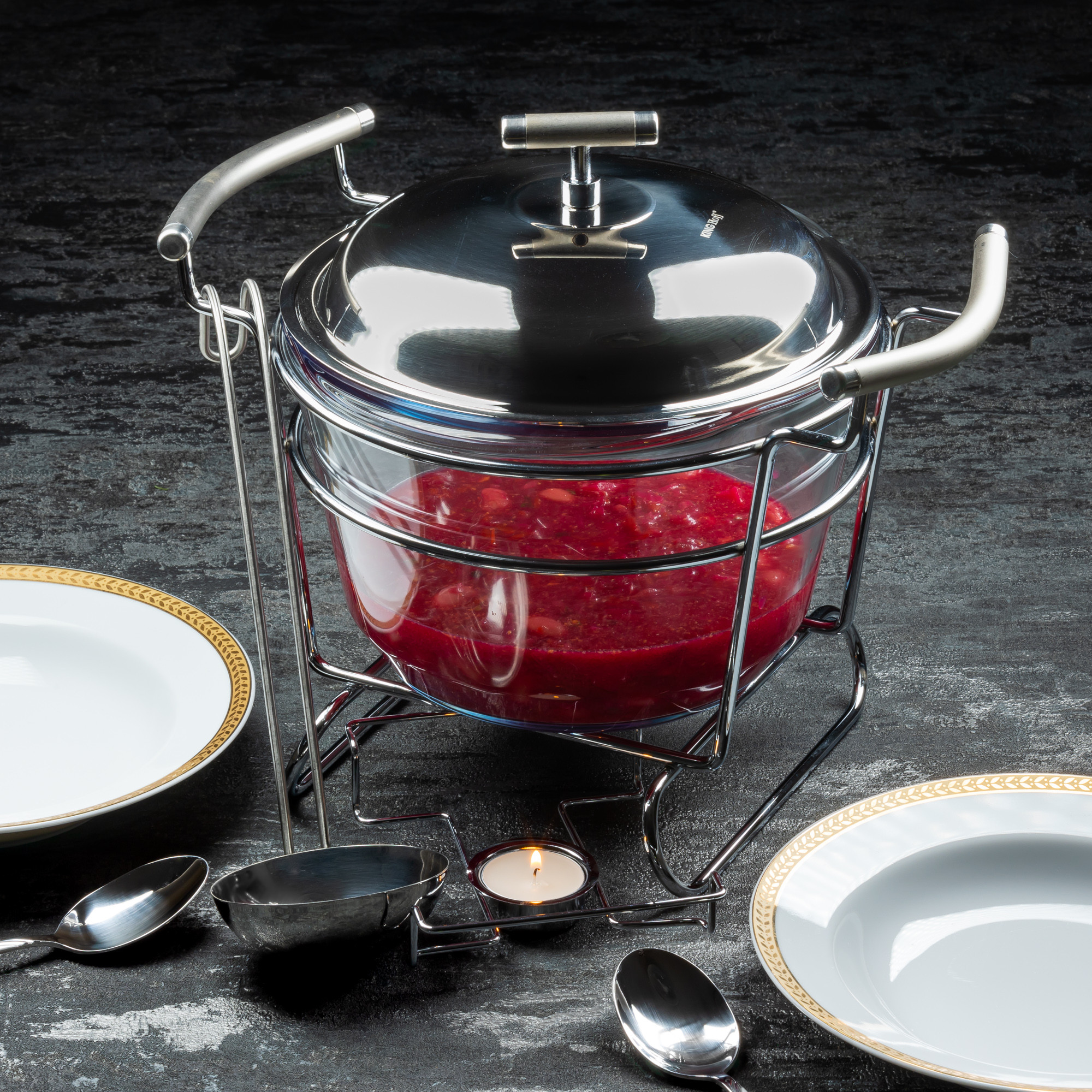 Podgrzewacz stołowy do potraw Kinghoff KH-1417 to idealne rozwiązanie dla tych, którzy cenią elegancję i funkcjonalność podczas serwowania gorących dań. W zestawie znajduje się naczynie ze szkła hartowanego Sabinex – renomowanego producenta z Francji – które skutecznie utrzymuje temperaturę potraw za pomocą płomienia świecy. Całość osadzona jest w solidnym stalowym stojaku z praktycznymi uchwytami, a komplet uzupełnia pokrywka i chochla wykonane ze stali nierdzewnej.
