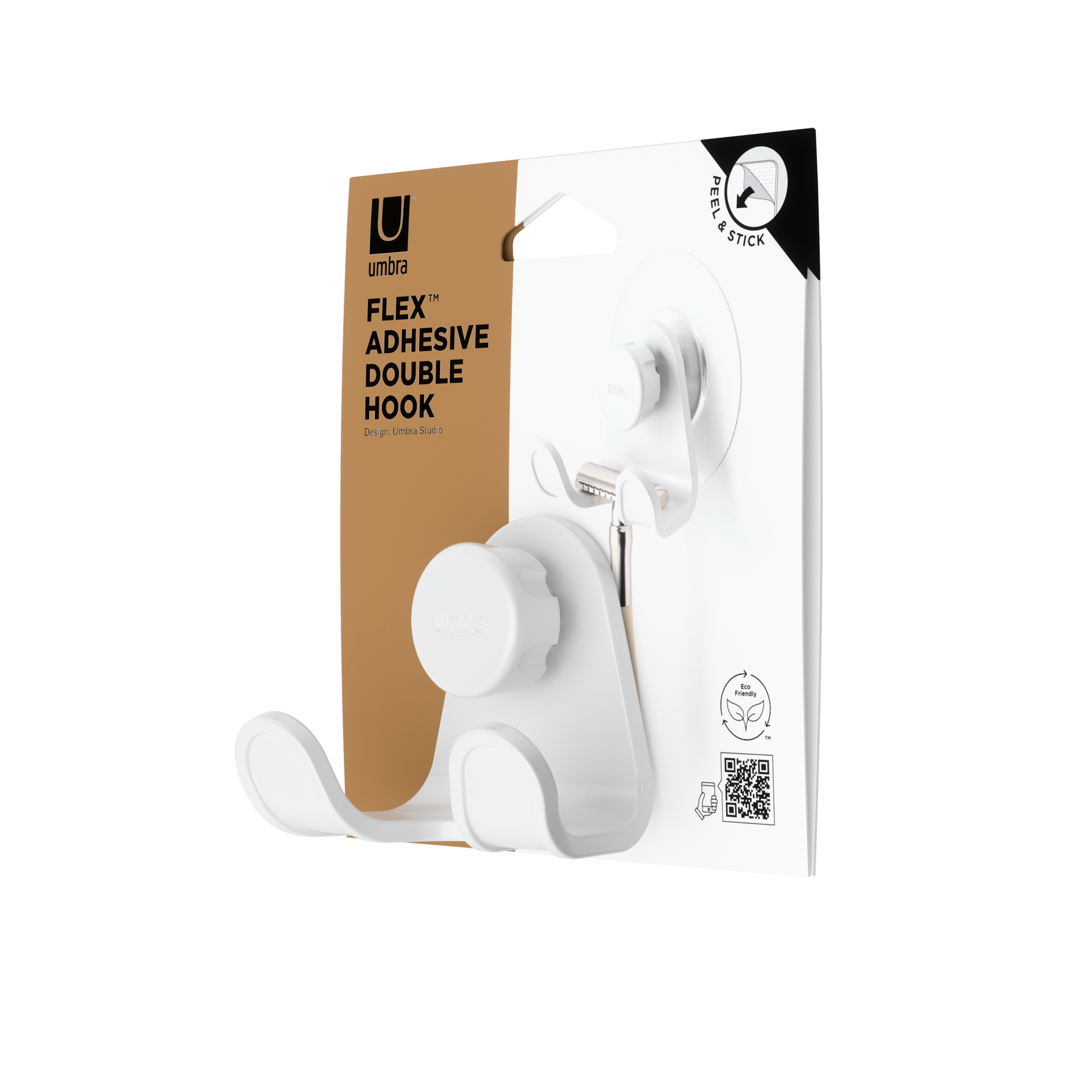 Łatwy w montażu, podwójny haczyk samoprzylepny Flex Adhesive Double Hook zawiera nieuszkadzające, wodoodporne paski klejące, które można stosować na różnych powierzchniach, takich jak płytki, płyty gipsowo-kartonowe, beton itp. (nie działa na powierzchniach porowatych).