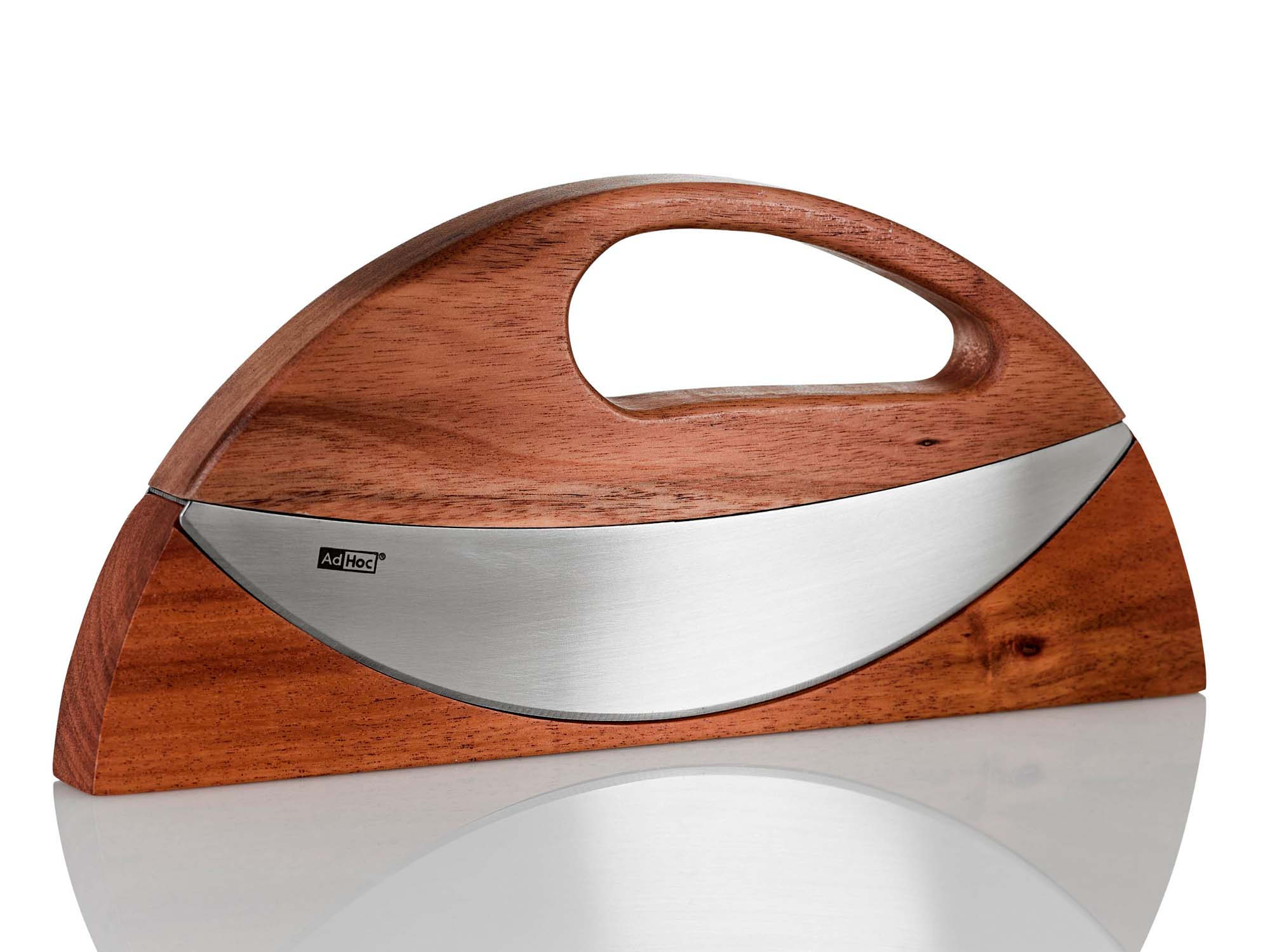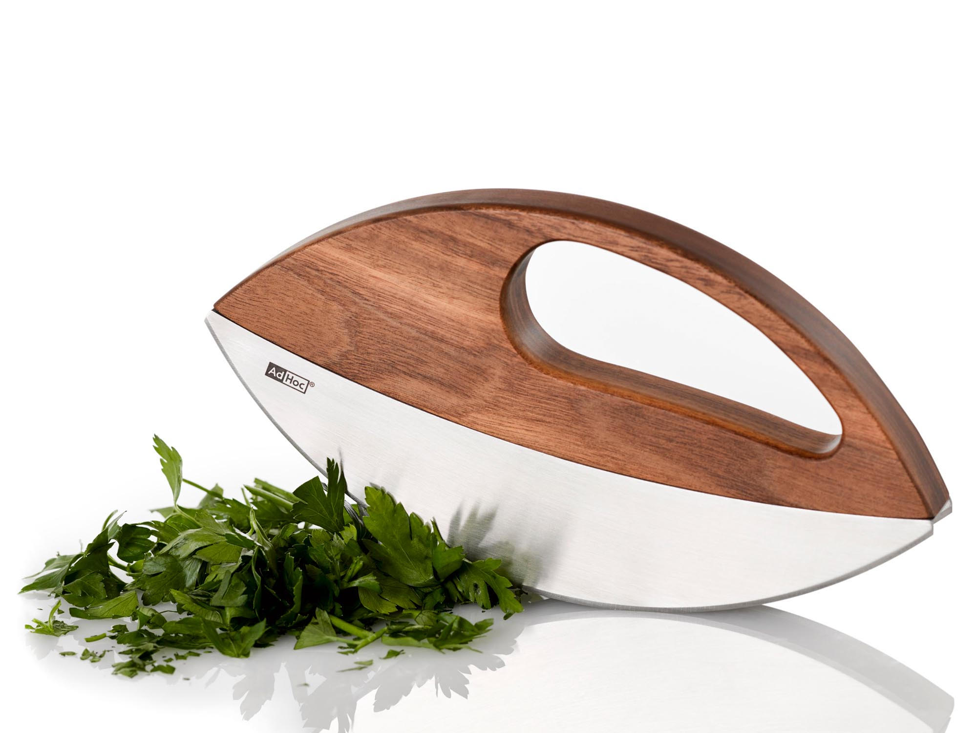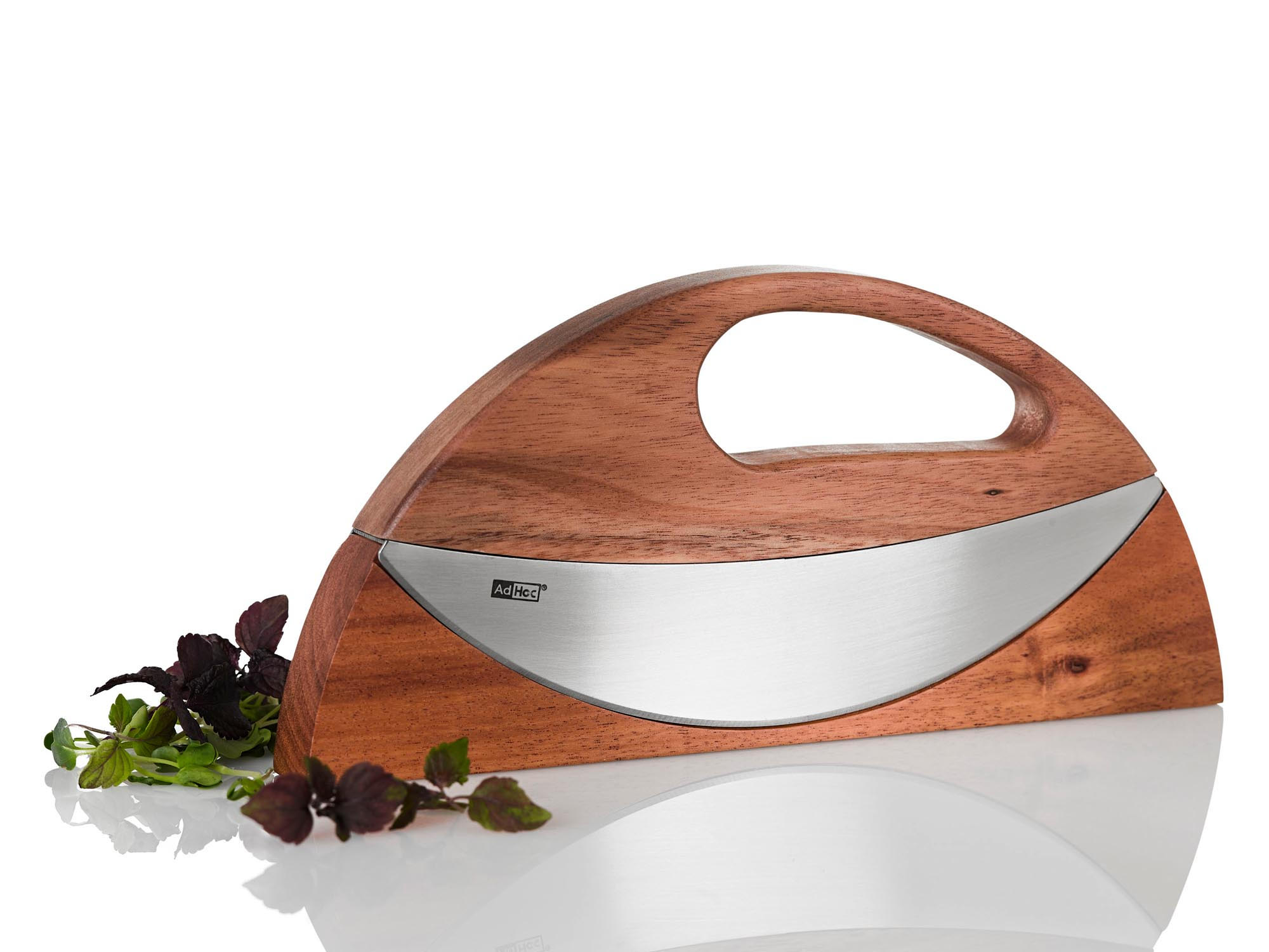 Stworzony do siekania ziół, krojenia pizzy i nie tylko! Jego efektywność została zwiększona przez dodanie jednego ostrza, co umożliwia szybsze siekanie. Wygodny i prosty w użyciu dzięki dopasowanemu do dłoni uchwytowi. W zestawie znajduje się podstawka do przechowywania. Nie należy myć w zmywarce. Produkt został zaprojektowany przez Gabriele Kaltenbach. Materiał: drewno akacjowe, stal nierdzewna. Wymiary noża: długość – 19,8cm, szerokość – 2,2cm, wysokość – 10,2cm. Wymiary z podstawą: długość – 23,2cm, szerokość – 2,2cm, wysokość – 10,9cm.