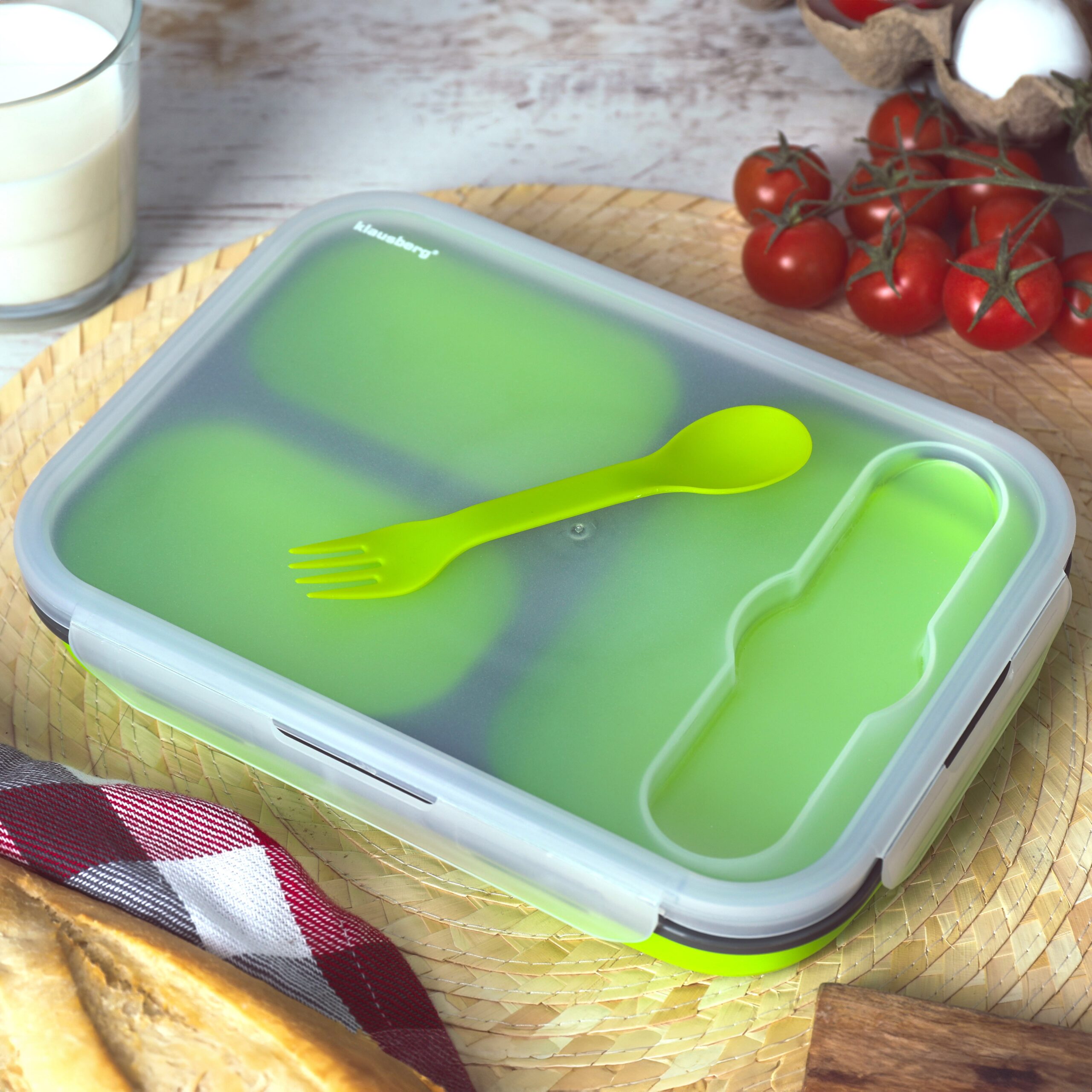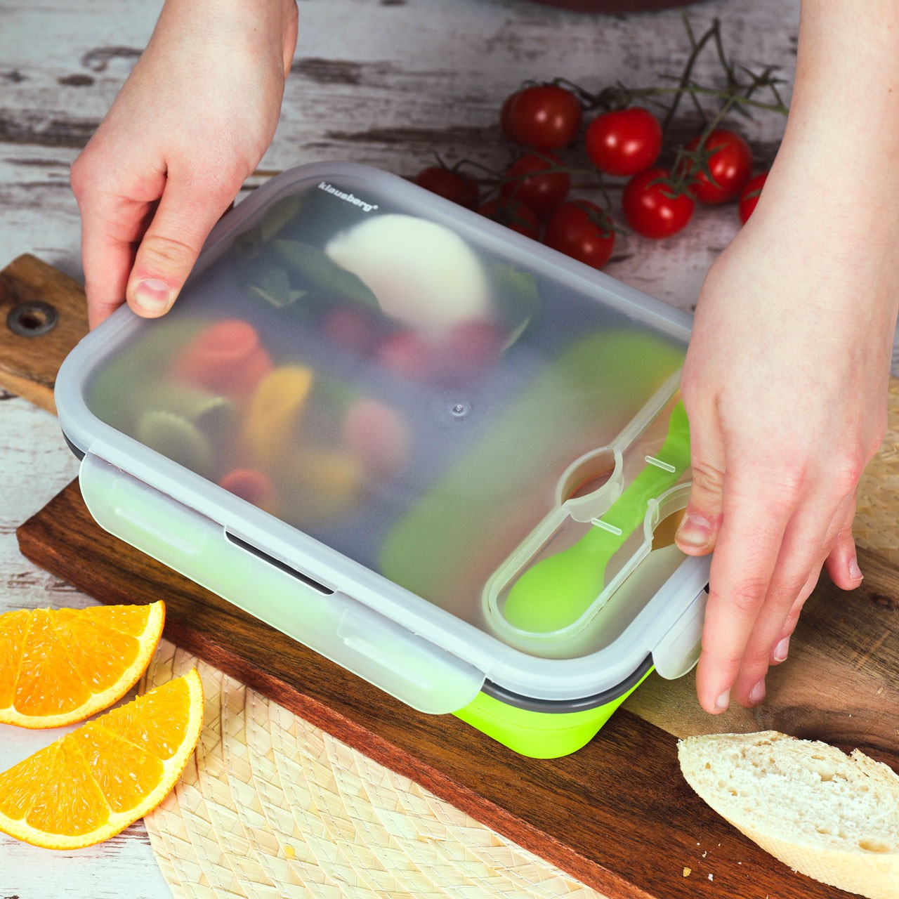 Funkcjonalny, trzykomorowy lunchbox silikonowy o pojemności 1100 ml to świetne rozwiązanie dla osób, które cenią wygodę i nowoczesne rozwiązania w przechowywaniu jedzenia. Elastyczna, składana konstrukcja sprawia, że pojemnik po użyciu zajmuje minimalną ilość miejsca, dzięki czemu bez problemu zmieścisz go w torbie, plecaku czy szufladzie. Pokrywka zapewnia pełną szczelność, umożliwiając bezpieczny transport także zup czy dań półpłynnych. Dołączony łyżko-widelec sprawia, że wszystko, czego potrzebujesz do posiłku, masz zawsze pod ręką. Pojemnik wykonano z wysokiej jakości silikonu LFGB, wolnego od toksyn i w pełni bezpiecznego dla żywności.