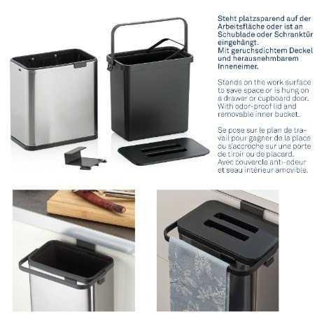 Pojemni na odpady organiczne w kuchni z kolekcji Plata marki Kela. Niezastąpiony pomocnik kuchenny w codziennej pracy przy przygotowywaniu posiłków. Posiada haczyk umożliwiający zawwieszenie go tuż pod zlewem na drzwiczkach kucjennych. Wykonany z wytrzymałego stworzywa sztucznegi i stali nierdzewnej w kolorze srebrnym matowym.