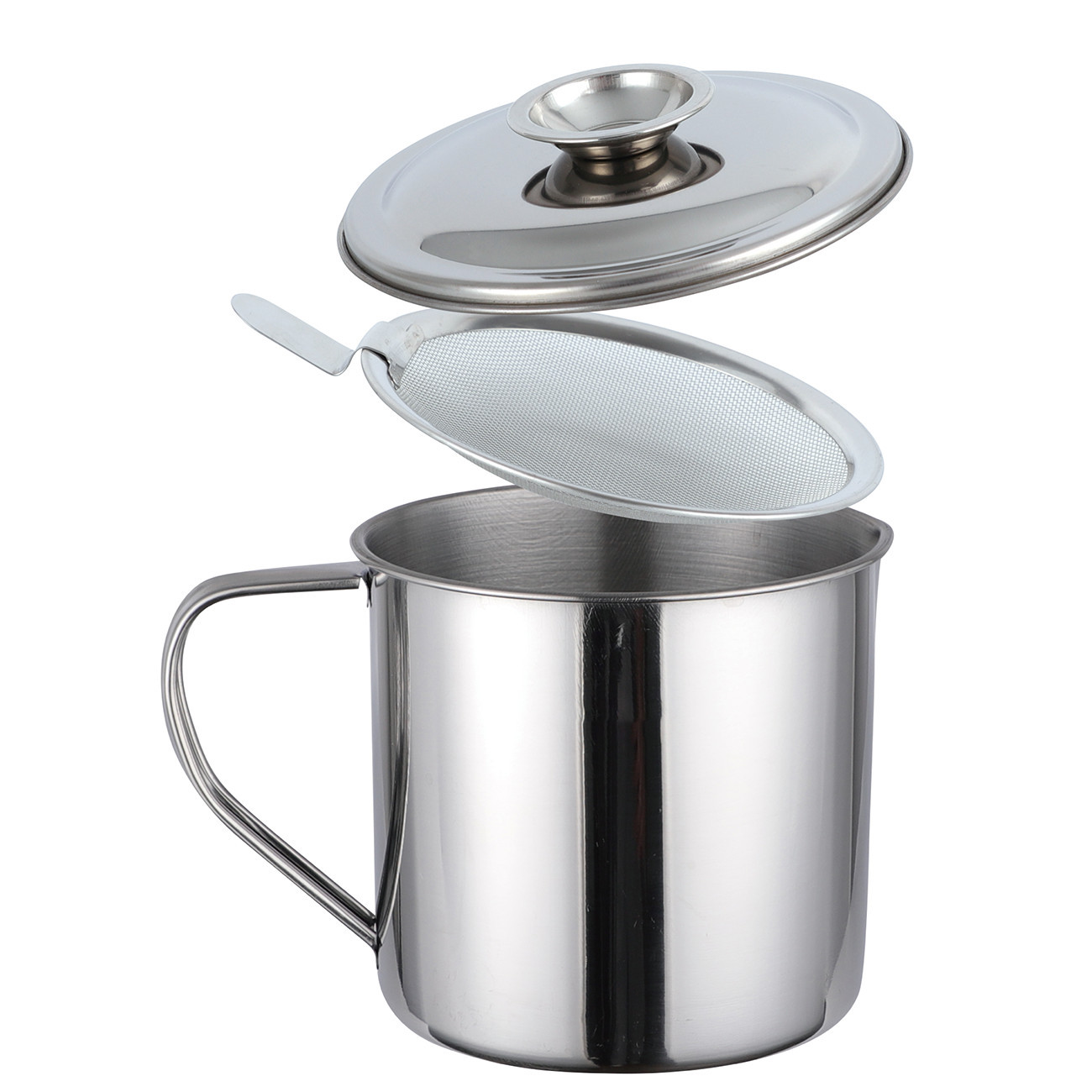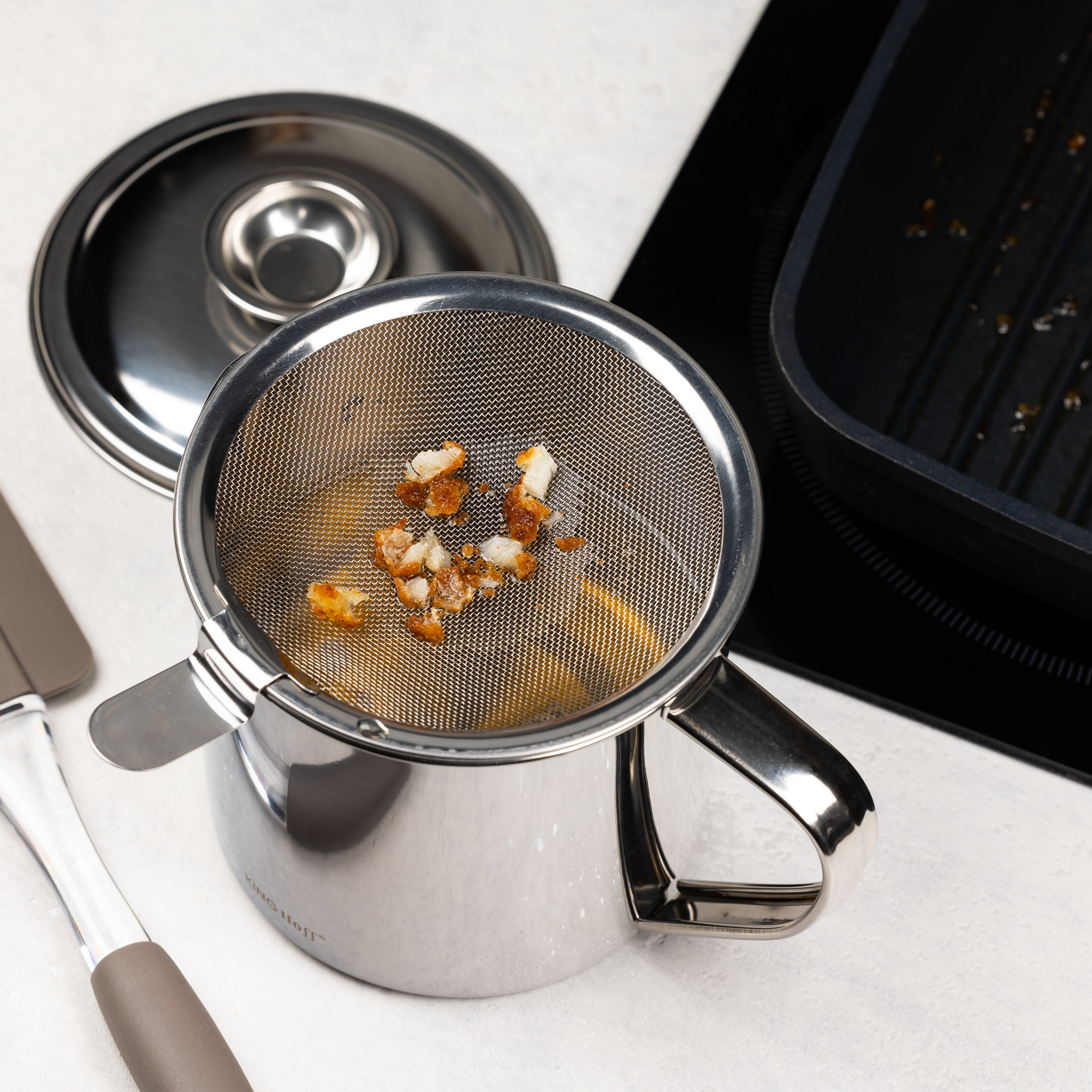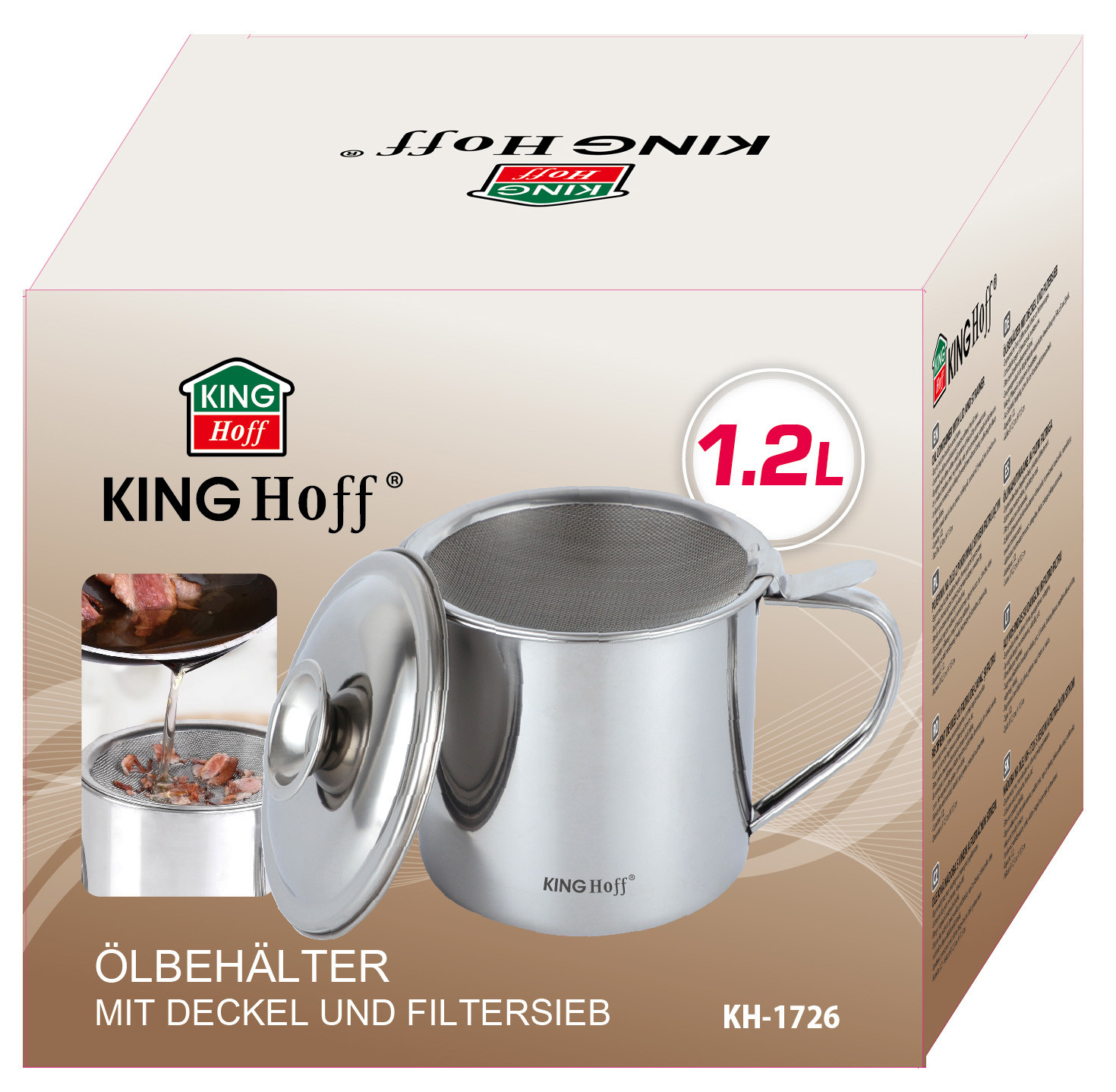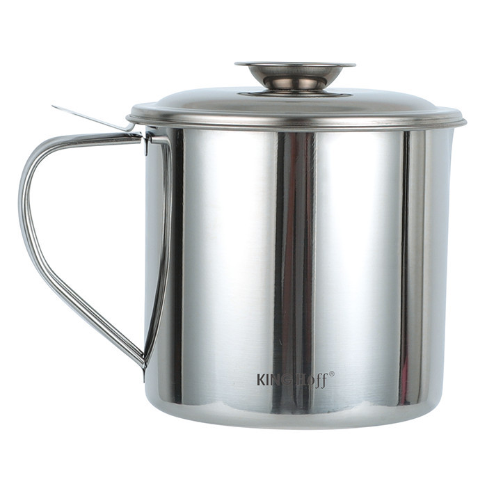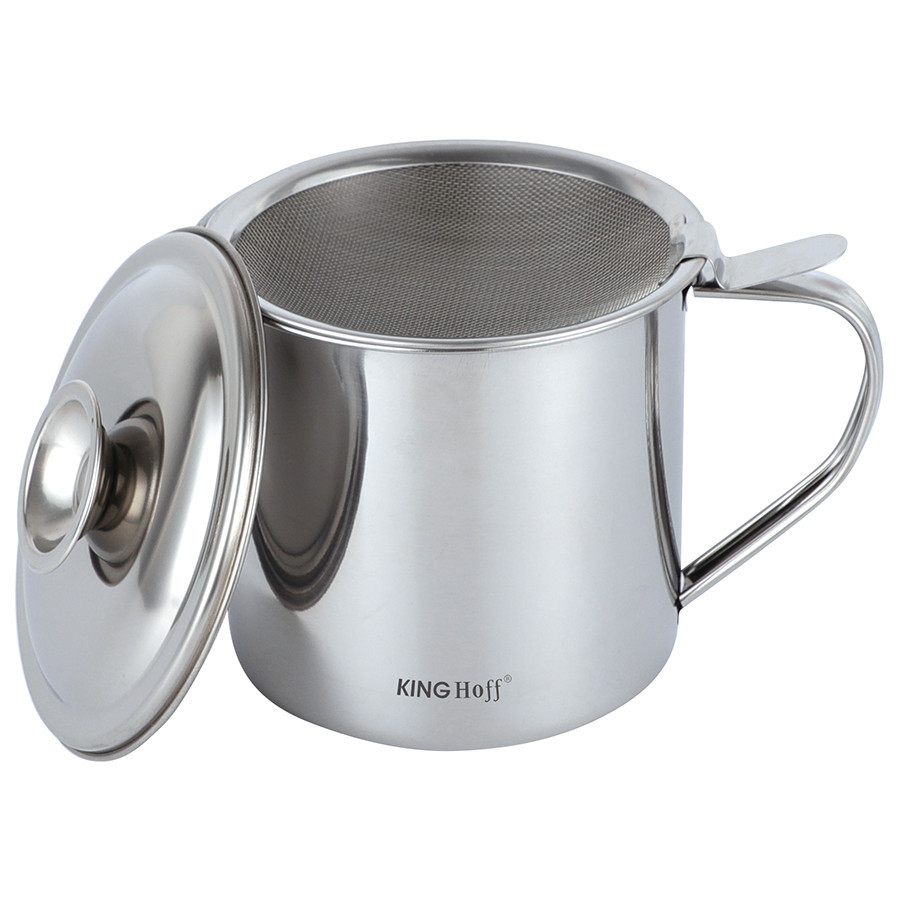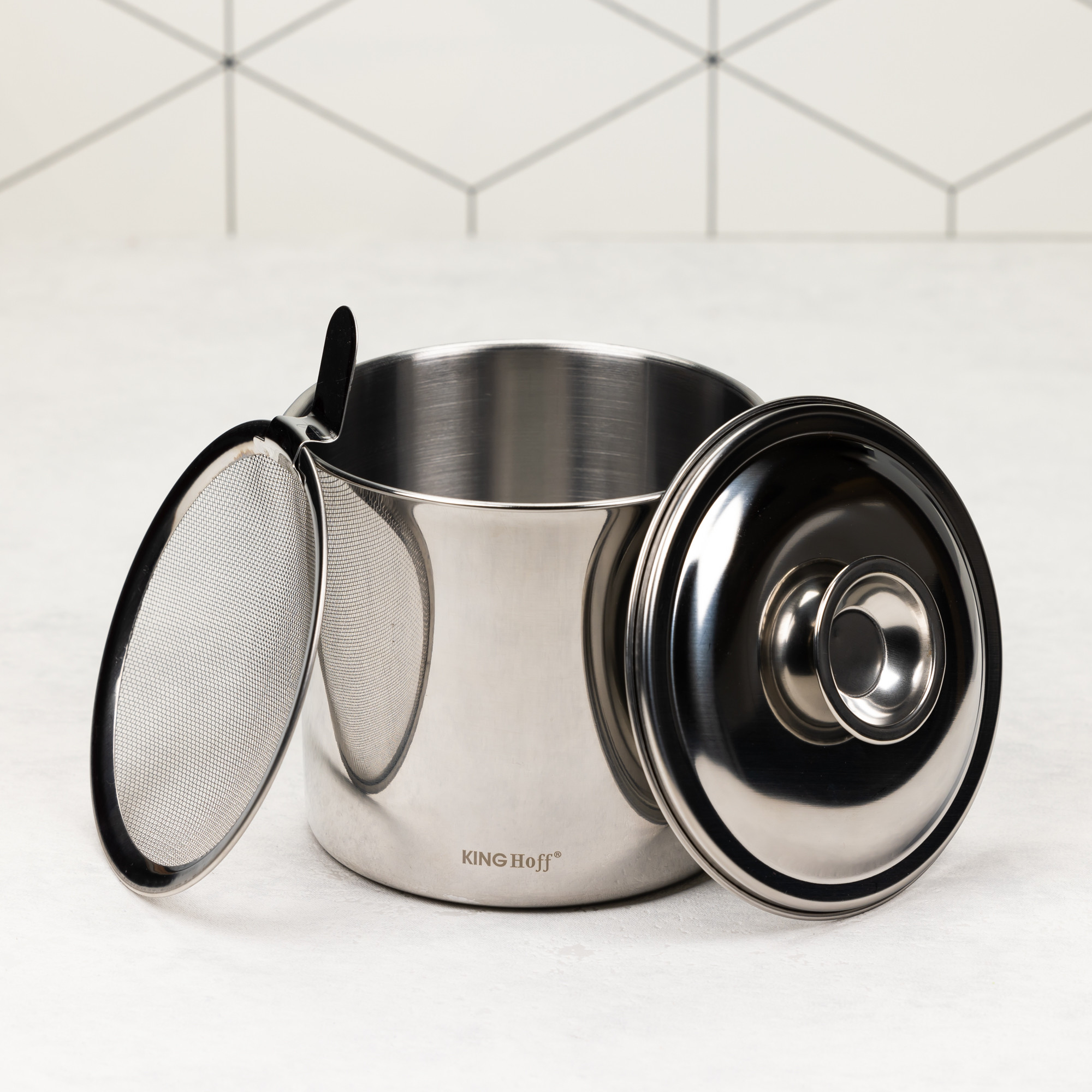 Pojemnik na olej ze stali nierdzewnej z pokrywką i sitkiem KINGHoff – praktyczne i higieniczne przechowywanie tłuszczu