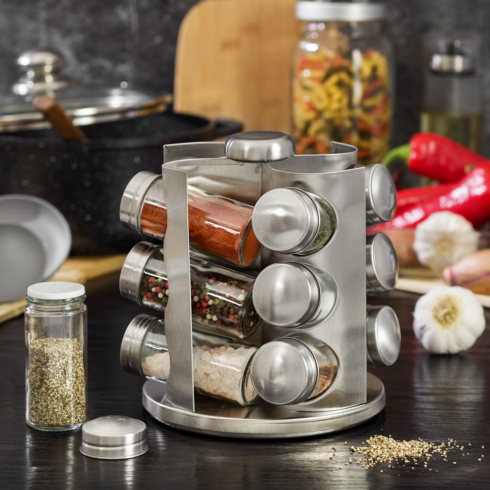 Elegancki i praktyczny organizer do przypraw to zestaw 12 szklanych pojemniczków ze stalową zakrętką. Obrotowy stojak ze stali nierdzewnej zapewnia porządek w Twojej kuchni i to, że odpowiednią przyprawę znajdziesz błyskawicznie, gdy będziesz jej potrzebować. Do organizera dołączony jest gratis zestaw naklejek z nazwami przypraw do umieszczenia w widocznym miejscu na wieczkach pojemników.