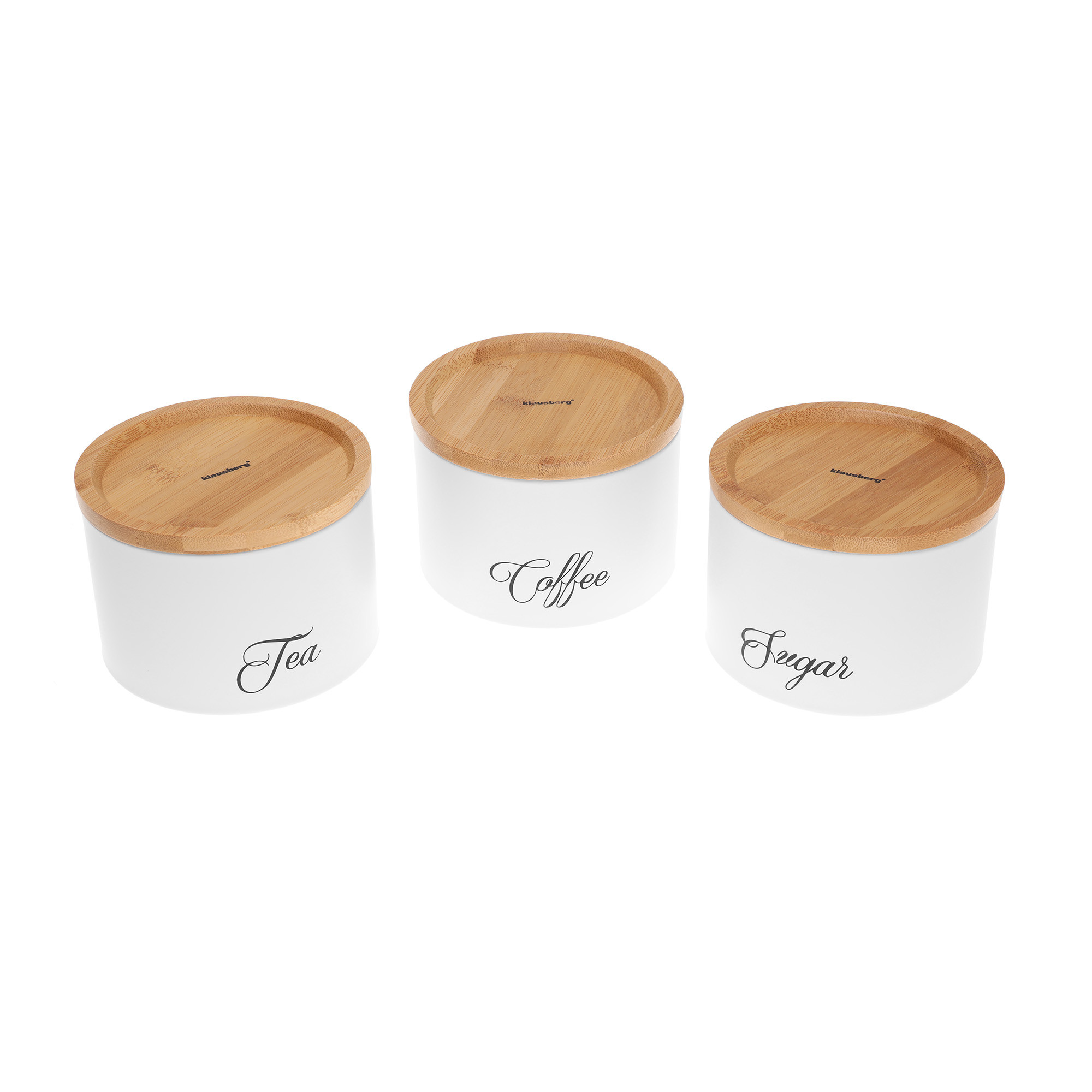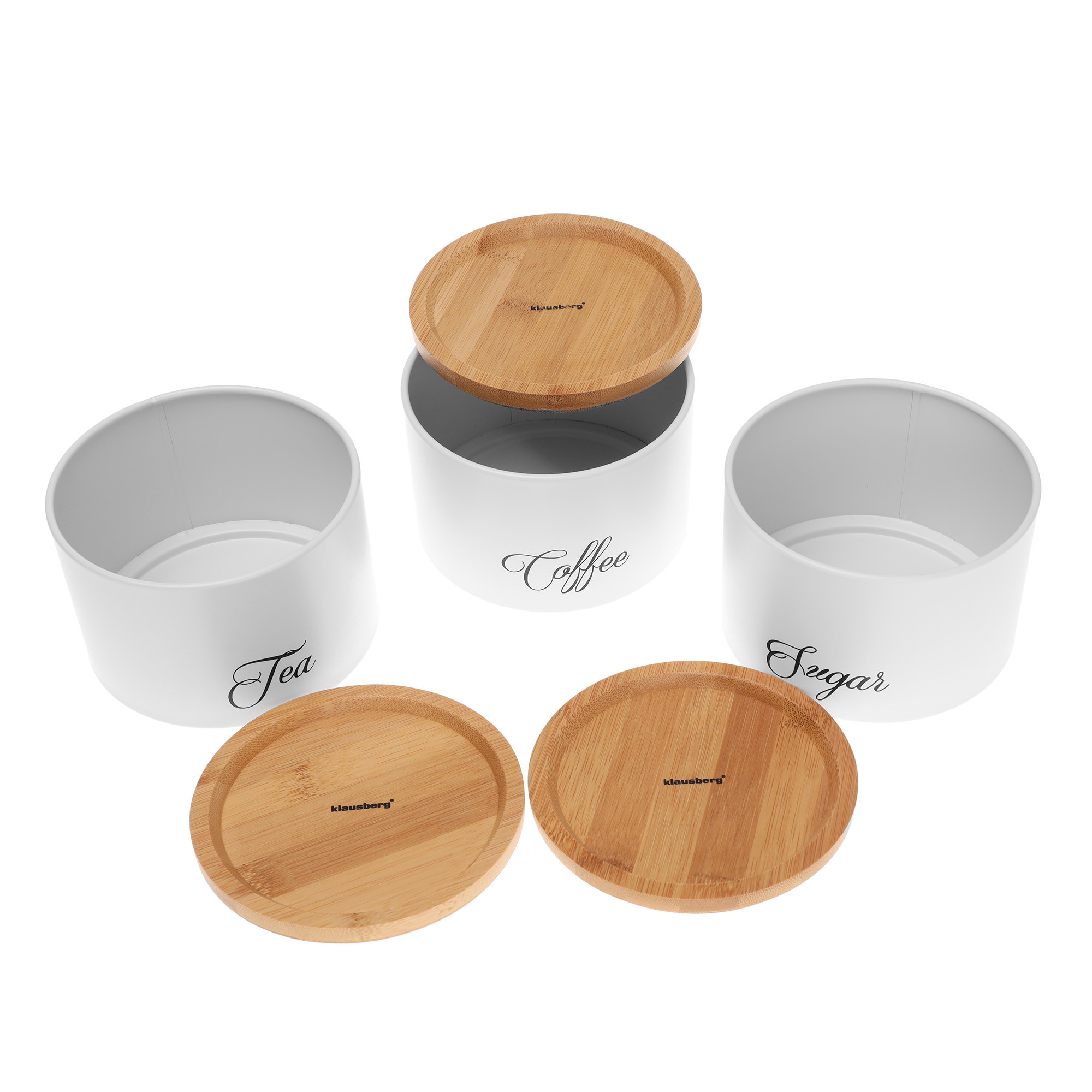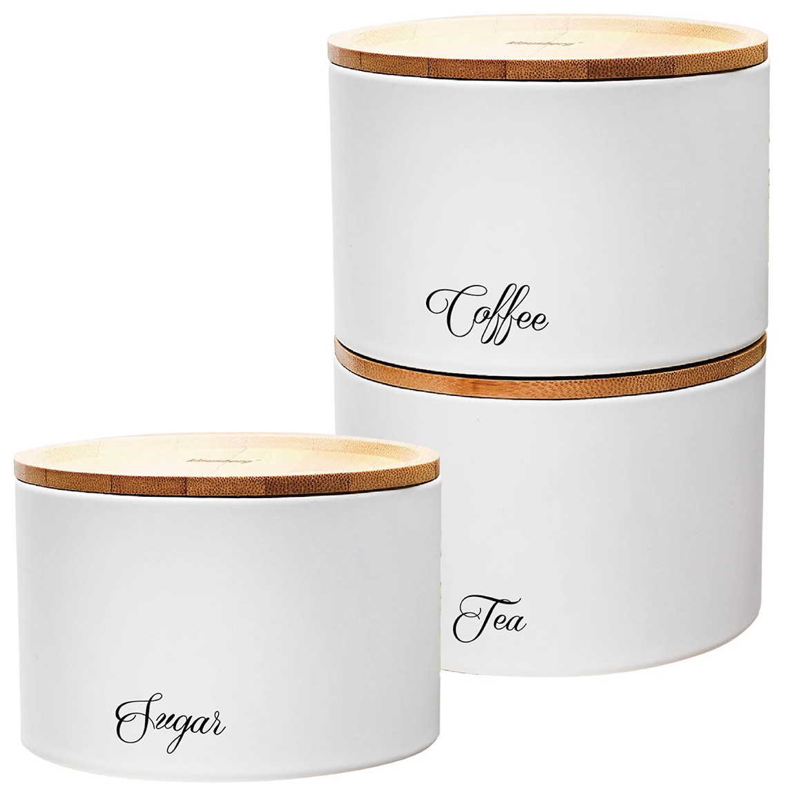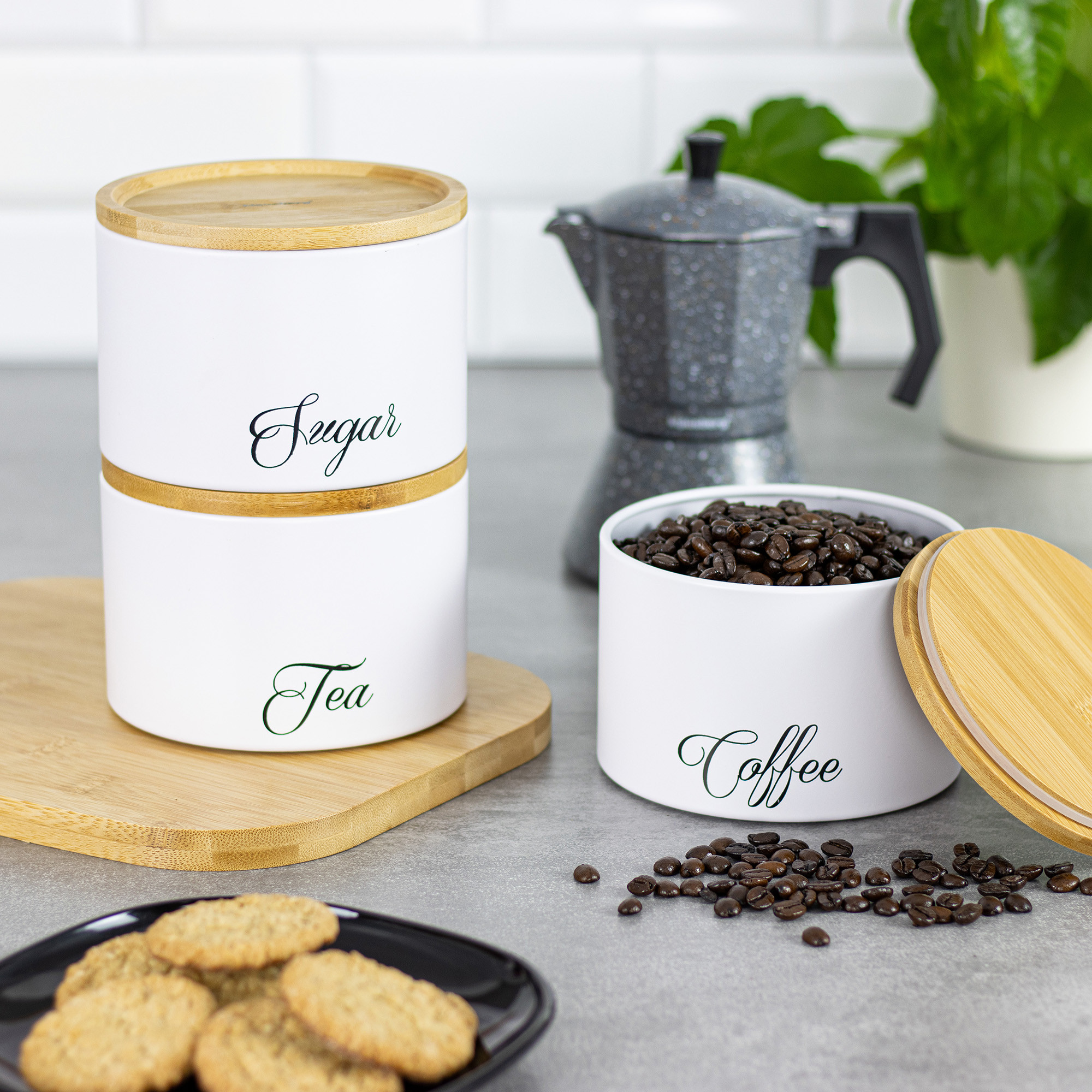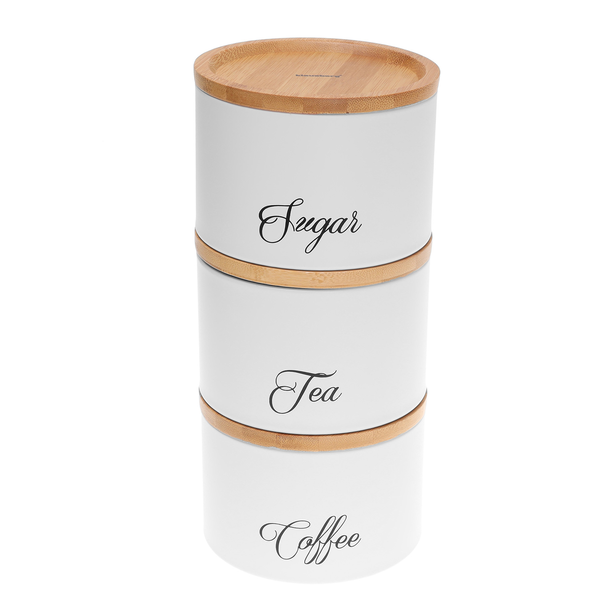– Na pojemnikach czarny napisy Sugar, Coffee, Tea.