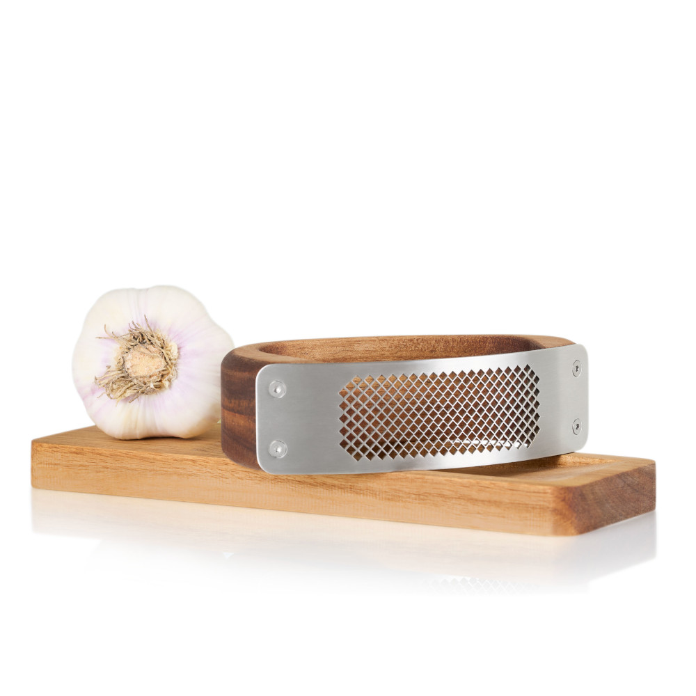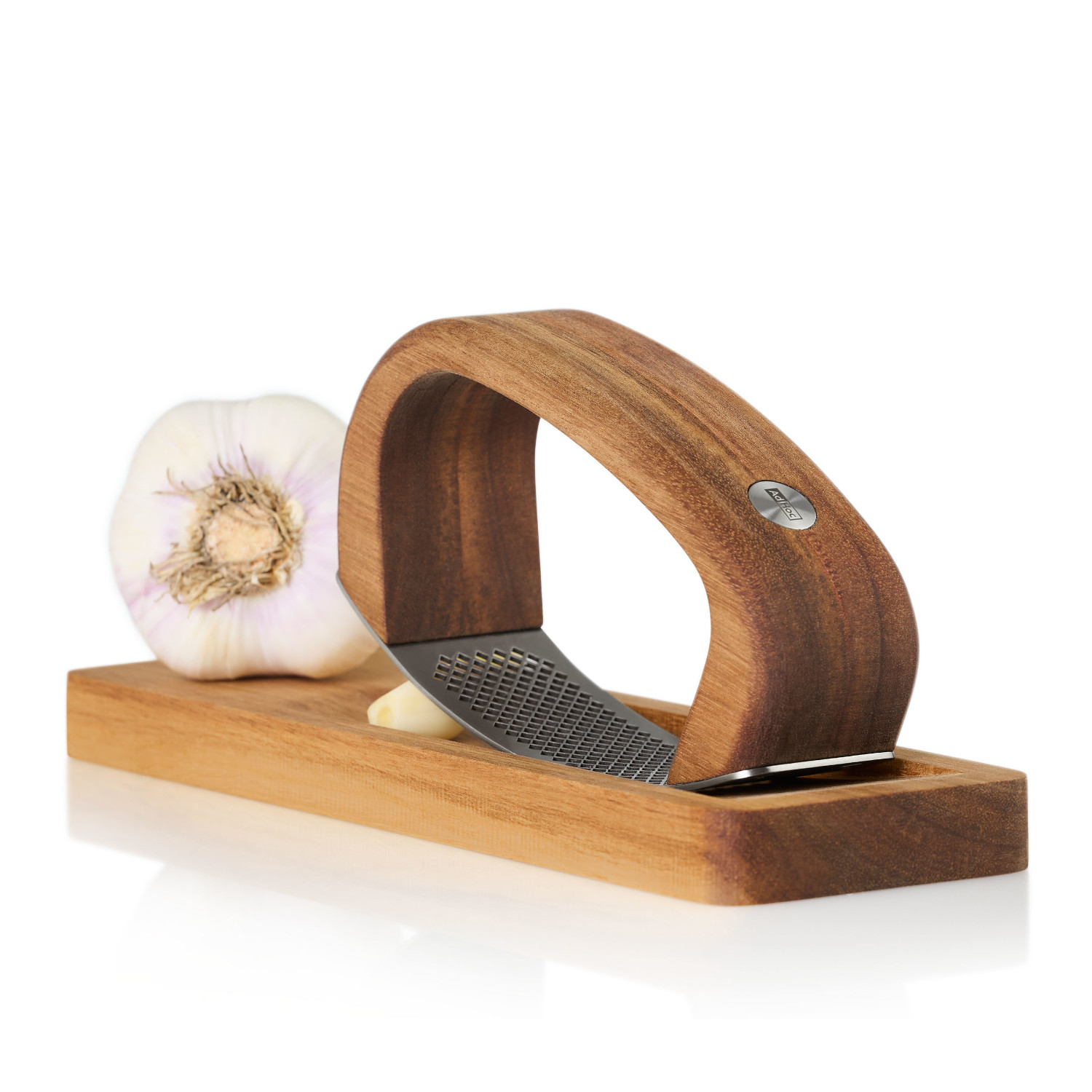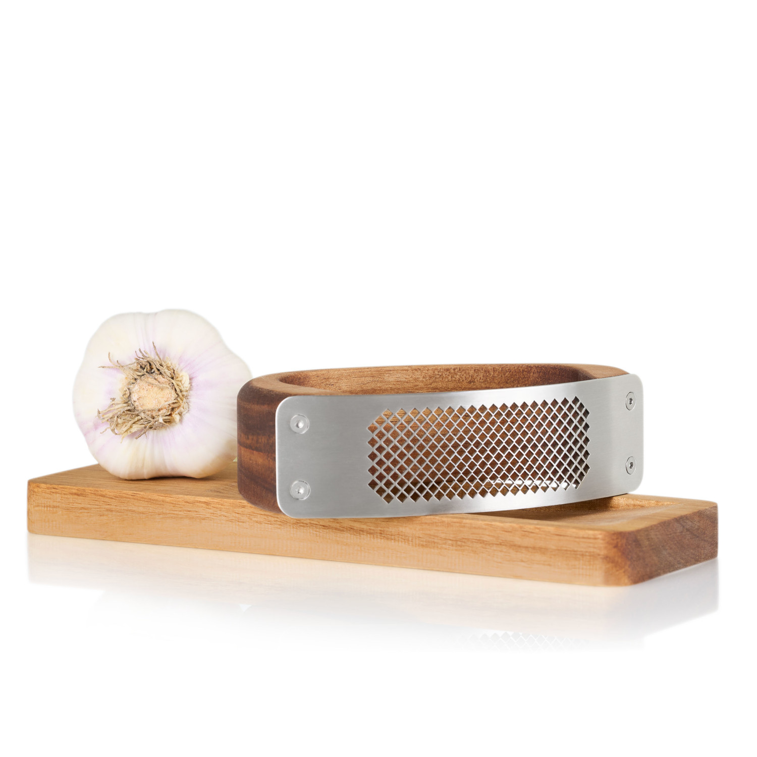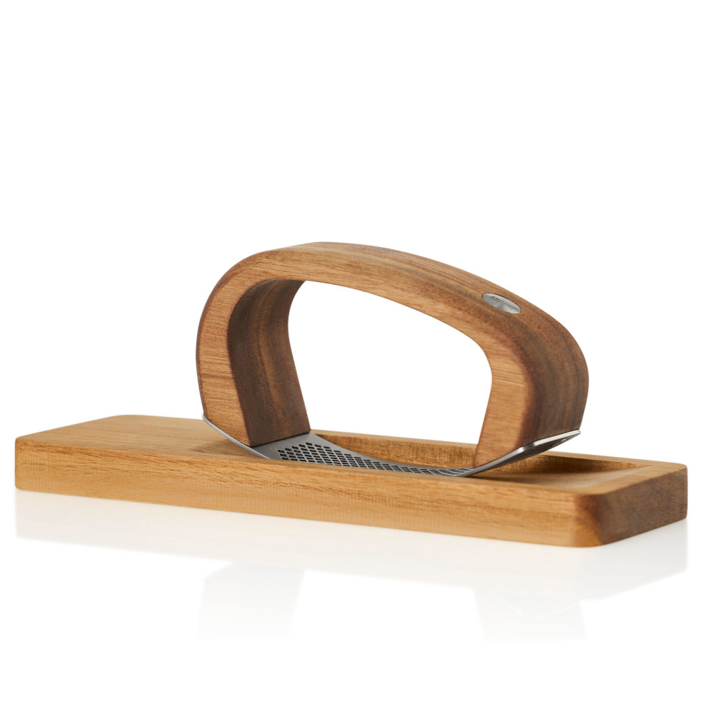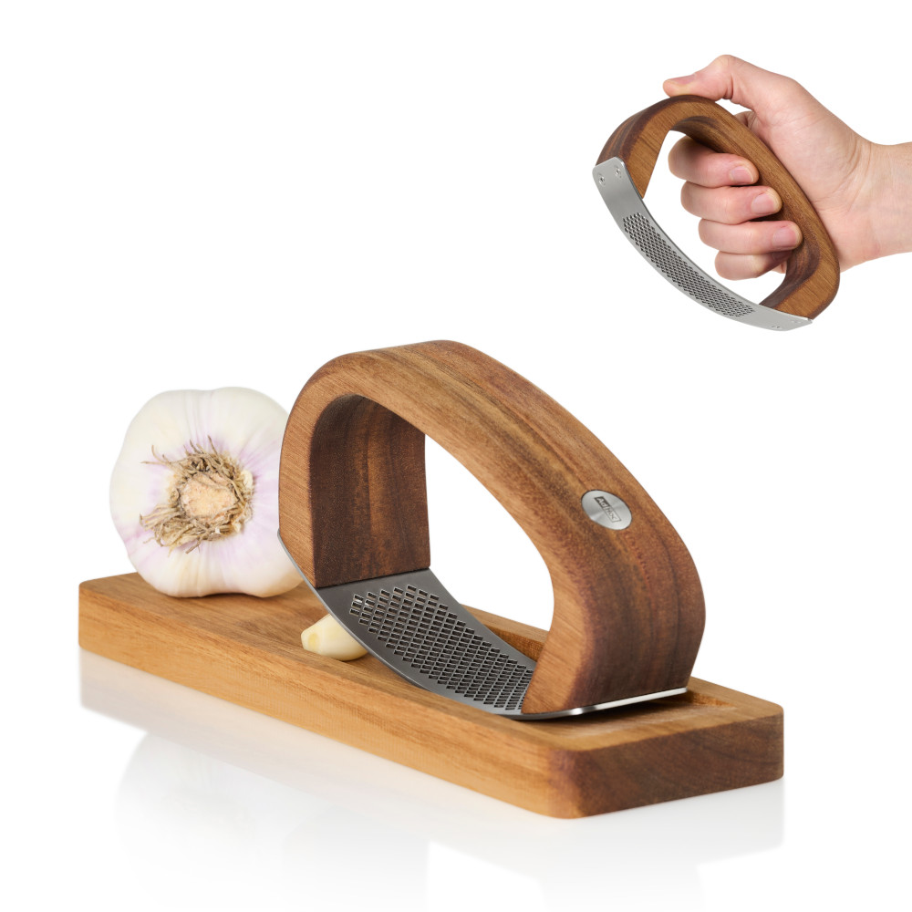 RoccaAlio to nowa propozycja rozdrabniania czosnku. Narzędzie składa się z szerokiego ostrza z ergonomicznym uchwytem oraz solidnej akacjowej deski z wgłębieniem ułatwiającym przeciskanie ząbków czosnku. Ostrze zostało laserowo wycięte i pozwala na równomierne rozdrobnienie czosnku, uwalniając pełnię smaku. Antybakteryjność drewna akacjowego czyni je szczególnie odpowiednim do kontaktu z jedzeniem. Produkt został zaprojektowany przez Roberta Franzhelda. Nie należy myć w zmywarce. Materiał: drewno akacjowe, stal nierdzewna. Przybliżone wymiary całości: wysokość – 9cm, długość – 24cm, szerokość – 7,6cm. Przybliżone wymiary ostrza z uchwytem: wysokość – 7,5cm, długość – 14,2cm, szerokość – 4cm, wymiary powierzchni do przeciskania: 8,5cm x 3,5cm. Przybliżone wymiary podstawki: wysokość – 1,8cm, długość – 24cm, szerokość – 7,6cm. Przybliżone wymiary brutto: wysokość – 24,5cm, długość – 10cm, szerokość – 8,3cm. Przybliżona waga brutto: 0,348kg. Opakowanie: kartonowe pudełko prezentowe.
