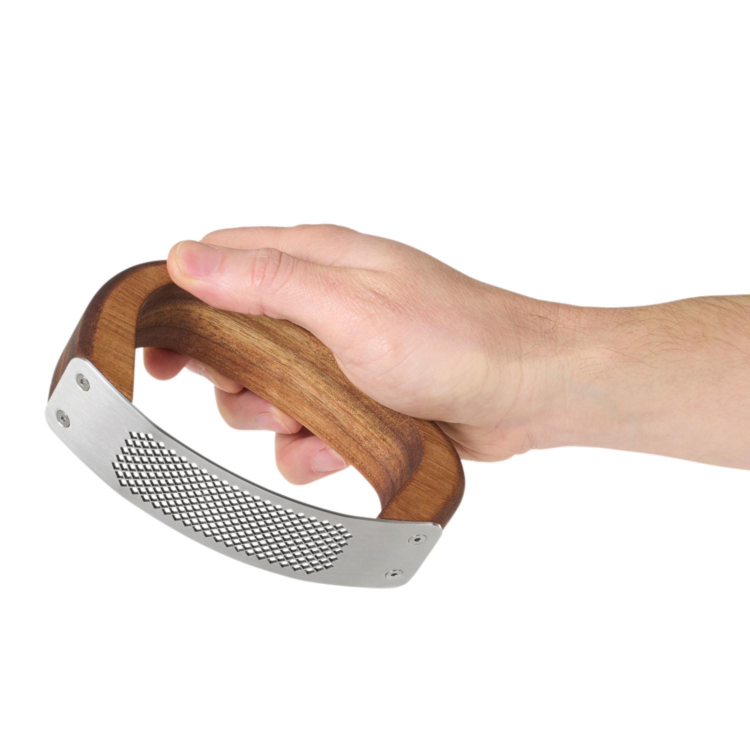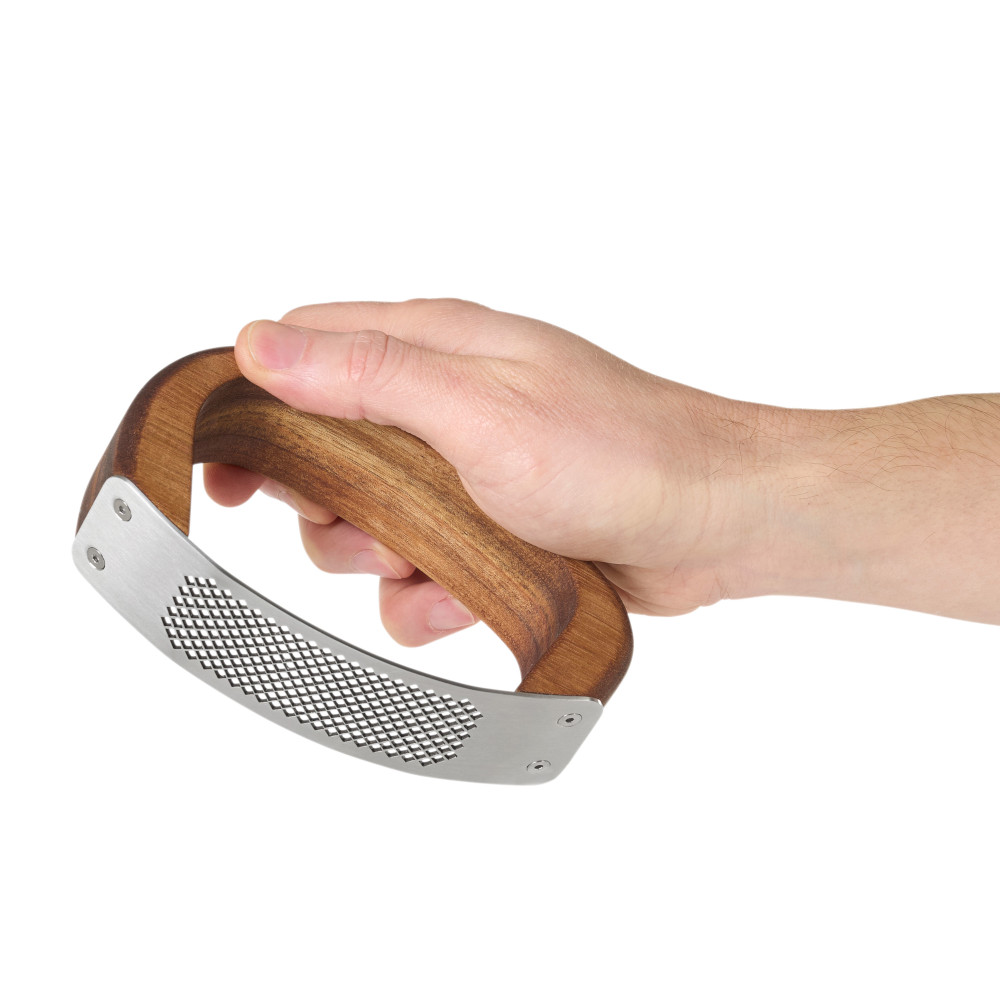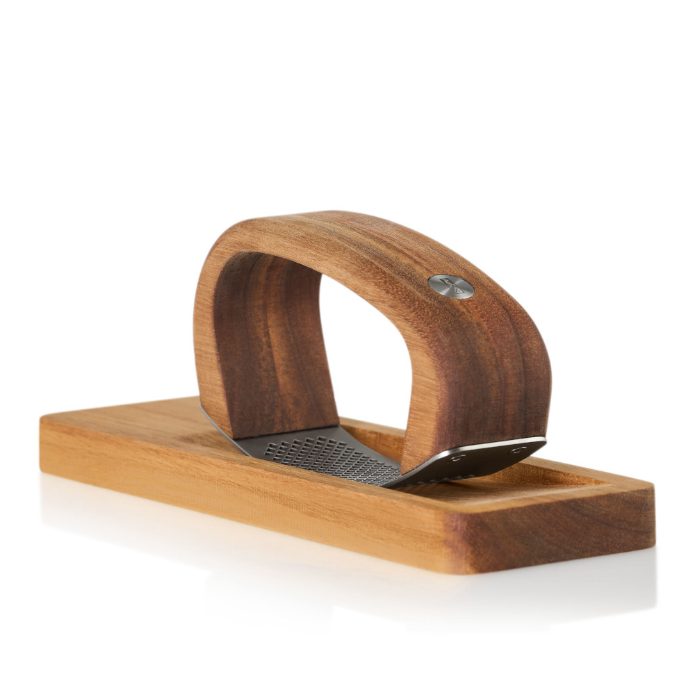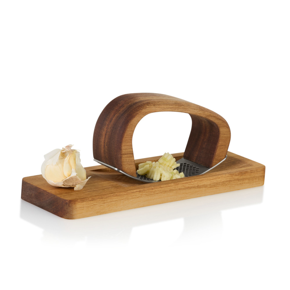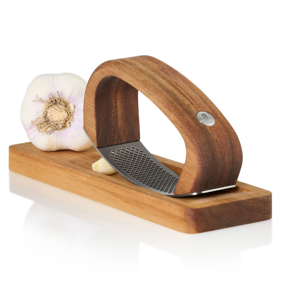RoccaAlio to nowa propozycja rozdrabniania czosnku. Narzędzie składa się z szerokiego ostrza z ergonomicznym uchwytem oraz solidnej akacjowej deski z wgłębieniem ułatwiającym przeciskanie ząbków czosnku. Ostrze zostało laserowo wycięte i pozwala na równomierne rozdrobnienie czosnku, uwalniając pełnię smaku. Antybakteryjność drewna akacjowego czyni je szczególnie odpowiednim do kontaktu z jedzeniem. Produkt został zaprojektowany przez Roberta Franzhelda. Nie należy myć w zmywarce. Materiał: drewno akacjowe, stal nierdzewna. Przybliżone wymiary całości: wysokość – 9cm, długość – 24cm, szerokość – 7,6cm. Przybliżone wymiary ostrza z uchwytem: wysokość – 7,5cm, długość – 14,2cm, szerokość – 4cm, wymiary powierzchni do przeciskania: 8,5cm x 3,5cm. Przybliżone wymiary podstawki: wysokość – 1,8cm, długość – 24cm, szerokość – 7,6cm. Przybliżone wymiary brutto: wysokość – 24,5cm, długość – 10cm, szerokość – 8,3cm. Przybliżona waga brutto: 0,348kg. Opakowanie: kartonowe pudełko prezentowe.