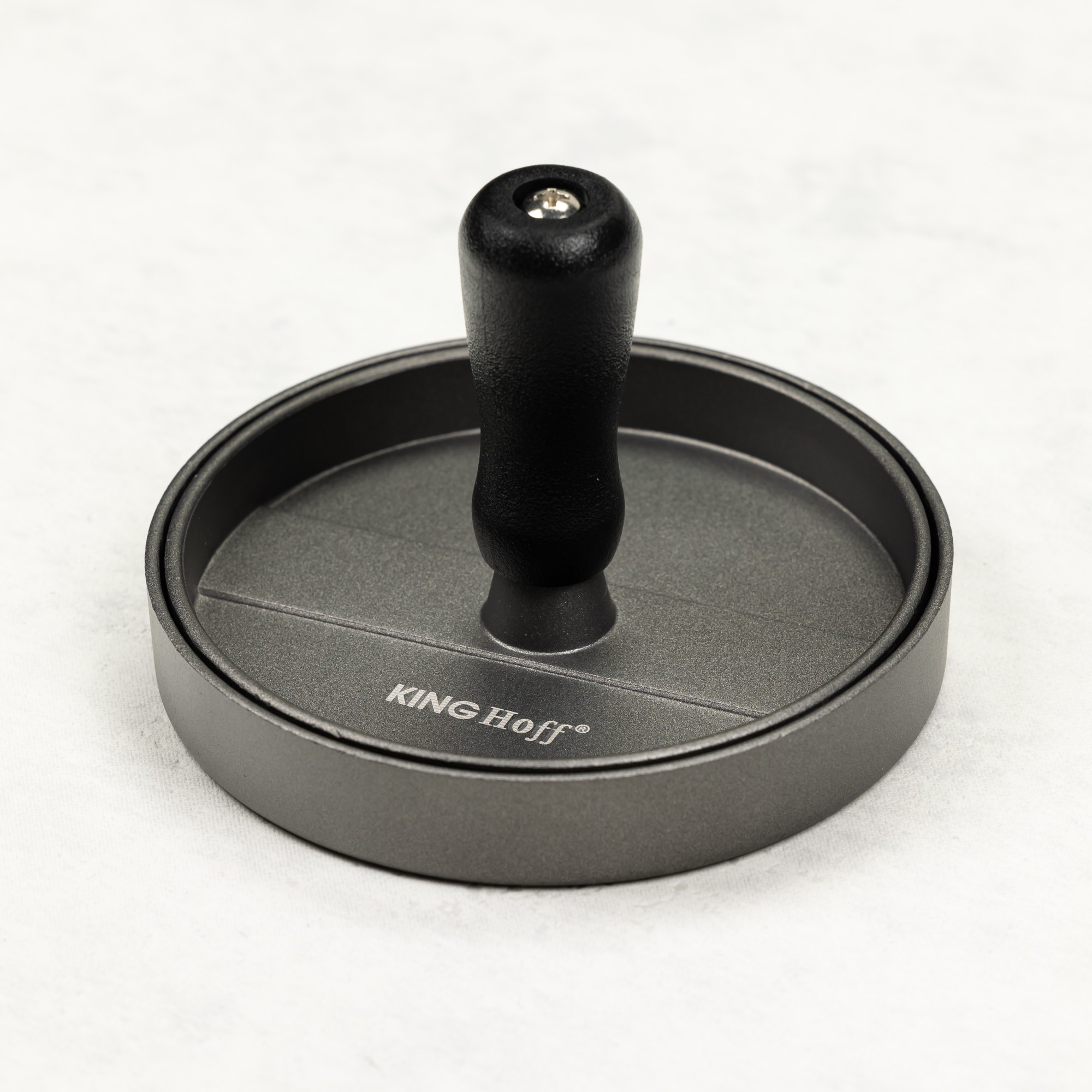 Aluminiowa praska do hamburgerów z nieprzywieralną powłoką i praktyczną plastikową rączką.