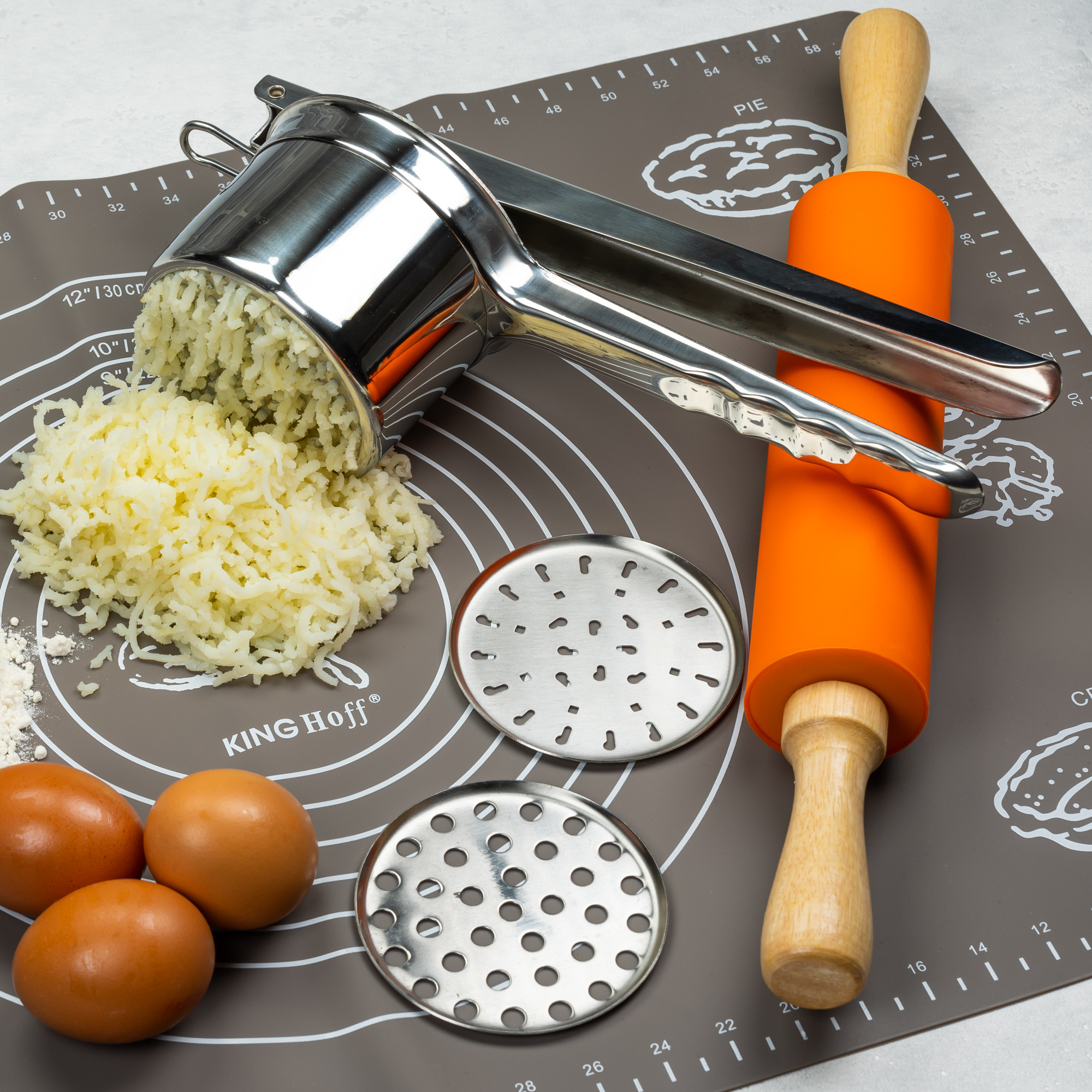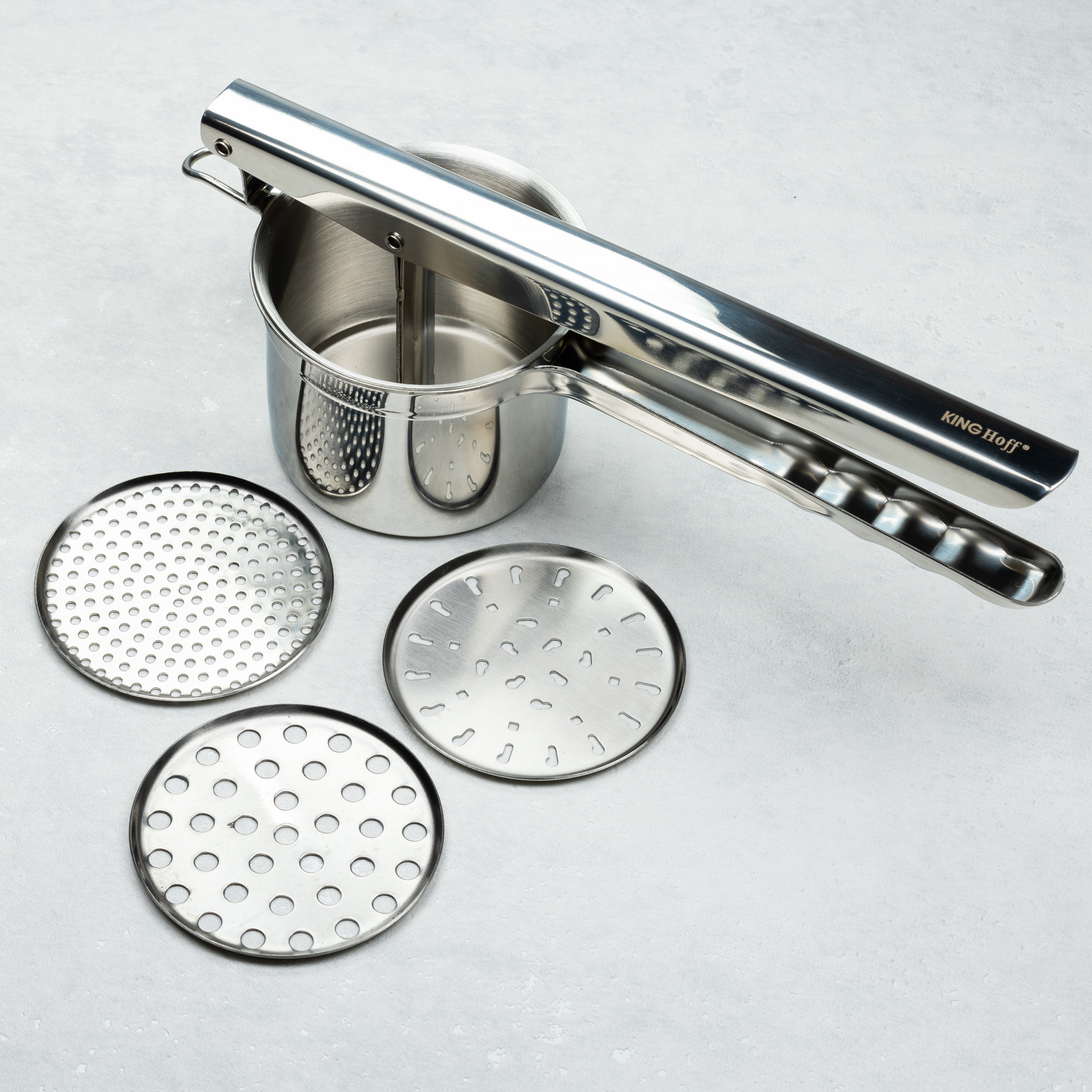 Stalowa praska do ziemniaków, sera. Pozwoli w szybki sposób przygotować ziemniaki na puree, kopytka czy ruskie pierogi. Trzy wymienne sita umożliwiają wybór stopnia maserowania.