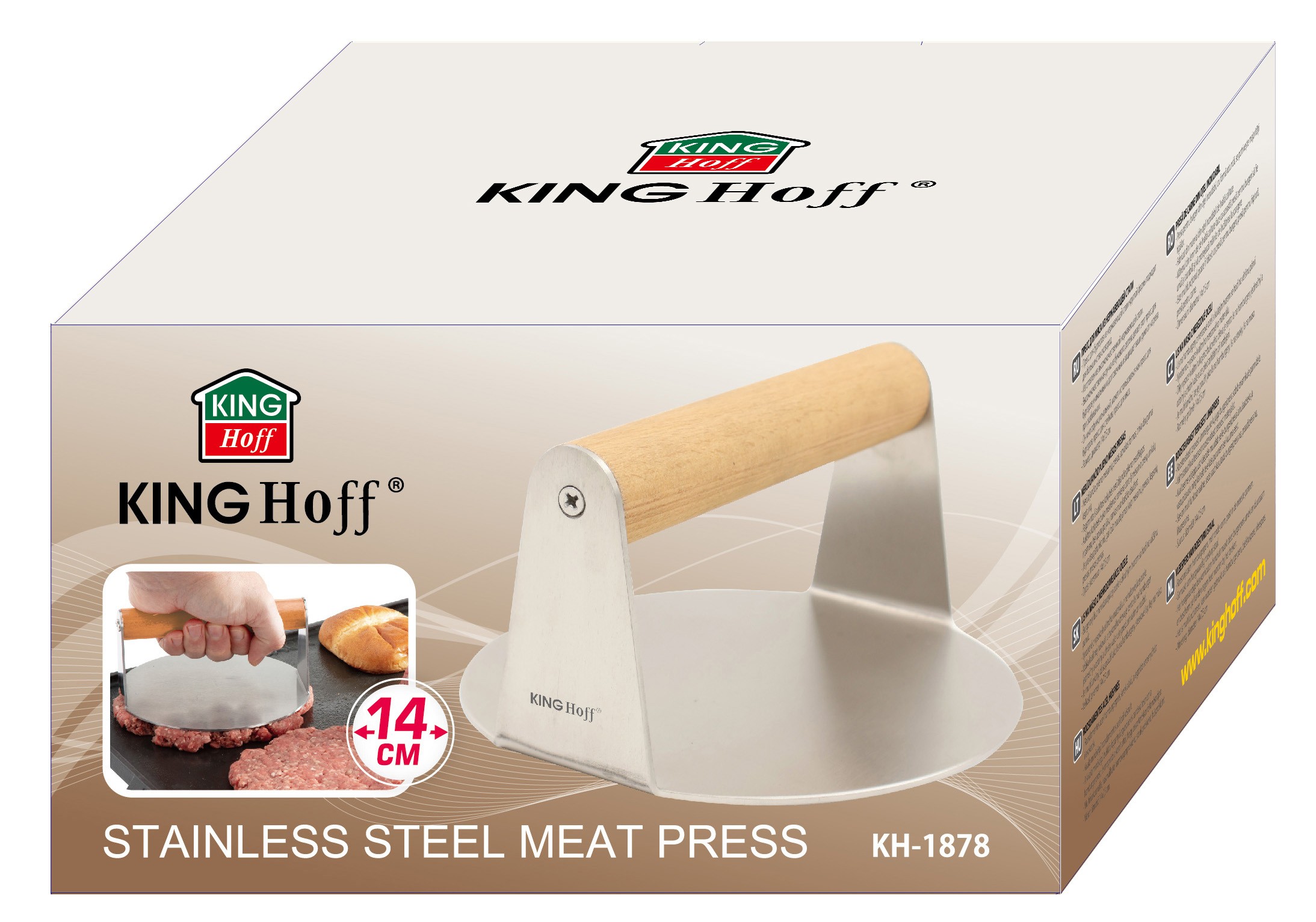 Praska dociskowa do mięsa KINGHoff KH-1878 to solidne i funkcjonalne narzędzie, które sprawdzi się zarówno w domowej kuchni, jak i podczas grillowania. Wykonana ze stali nierdzewnej o średnicy 14 cm, idealnie dopasowuje się do większości patelni, umożliwiając szybkie i równomierne formowanie burgerów, steków i innych mięsnych przysmaków. Ergonomiczny uchwyt z naturalnego drewna bukowego zapewnia wygodny i bezpieczny chwyt, chroniąc dłonie przed nagrzaniem. Klasyczna forma i wysoka jakość wykonania sprawiają, że praska będzie niezawodnym wsparciem w przygotowywaniu idealnych kotletów.