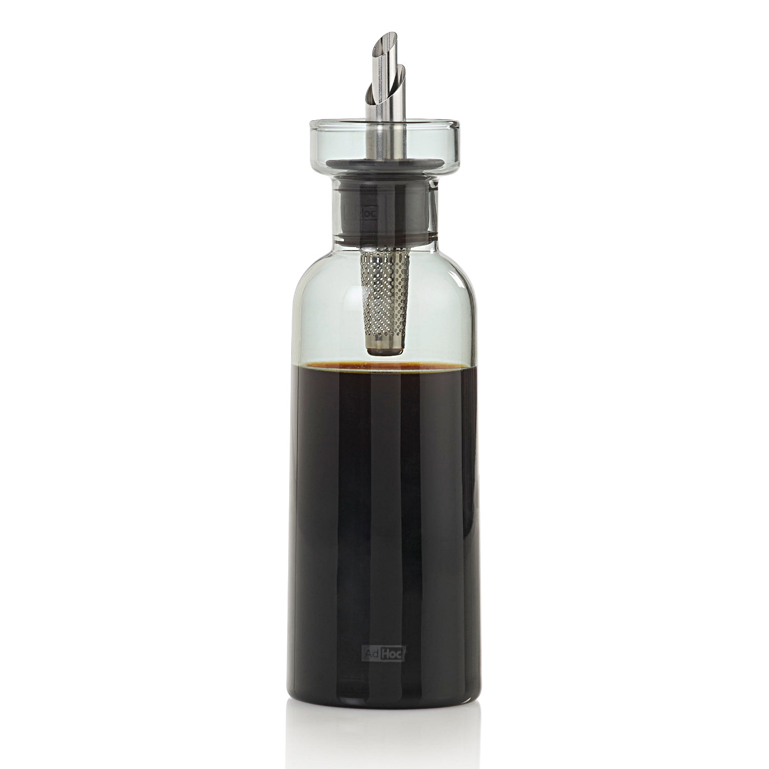 Dyspenser do oliwy lub octu AROMA POUR o pojemności 300ml z przyciemnianego szkła borokrzemowego z nalewakiem grawitacyjnym ze stali nierdzewnej wykończonym silikonowym kołnierzem uszczelniającym. Dozownik do oleju lub octu AROMAPOUR marki Ad Hoc jest wykonany z przyciemnianego szkła borokrzemowego i wyposażony w sprytny nalewak, który nie tylko zapobiega kapaniu, ale odprowadza krople z powrotem do butelki. Filtr ze stali nierdzewnej zatrzymuje zioła i przyprawy podczas nalewania. Rozwiązanie typu GravitySeal zapewnia hermetyczne zamknięcie. Dodatkowo nalewak dla lepszej higieny można osłonić kapturkiem z przyciemnionego tworzywa. Pojemniki są dostępne o różnych pojemnościach :120ml, 300ml , 500ml oraz w zestawie 2 sztuk. Wszystkie elementy można myć w zmywarce. Należy jednak przy tym przestrzegać zasad mycia metalu i tworzyw w zmywarce, elementy metalowe powinny być wyjęte ze zmywarki natychmiast po zakończeniu cyklu mycia i dokładnie wytarte do sucha a temperatura mycia nie powinna przekraczać 40oC w związku z kołnierzem uszczelniającym wykonanym z silikonu. Brak przestrzegania powyższych zaleceń oraz stosowanie agresywnych środków do mycia może przyczynić się do uszkodzenia tworzywa i powstania ognisk rdzy. Materiał: szkło borokrzemowe, stal nierdzewna, silikon, tworzywo. Przybliżone wymiary: – pojemność: 300ml, – wysokość: 22cm, – średnica dół: 5,8cm. Przybliżone wymiary brutto: – wysokość: 23.8cm, – długość: 8,9cm, – szerokość: 8,9cm. Przybliżona waga brutto: 0,278kg. Opakowanie: kartonowe pudełko prezentowe.