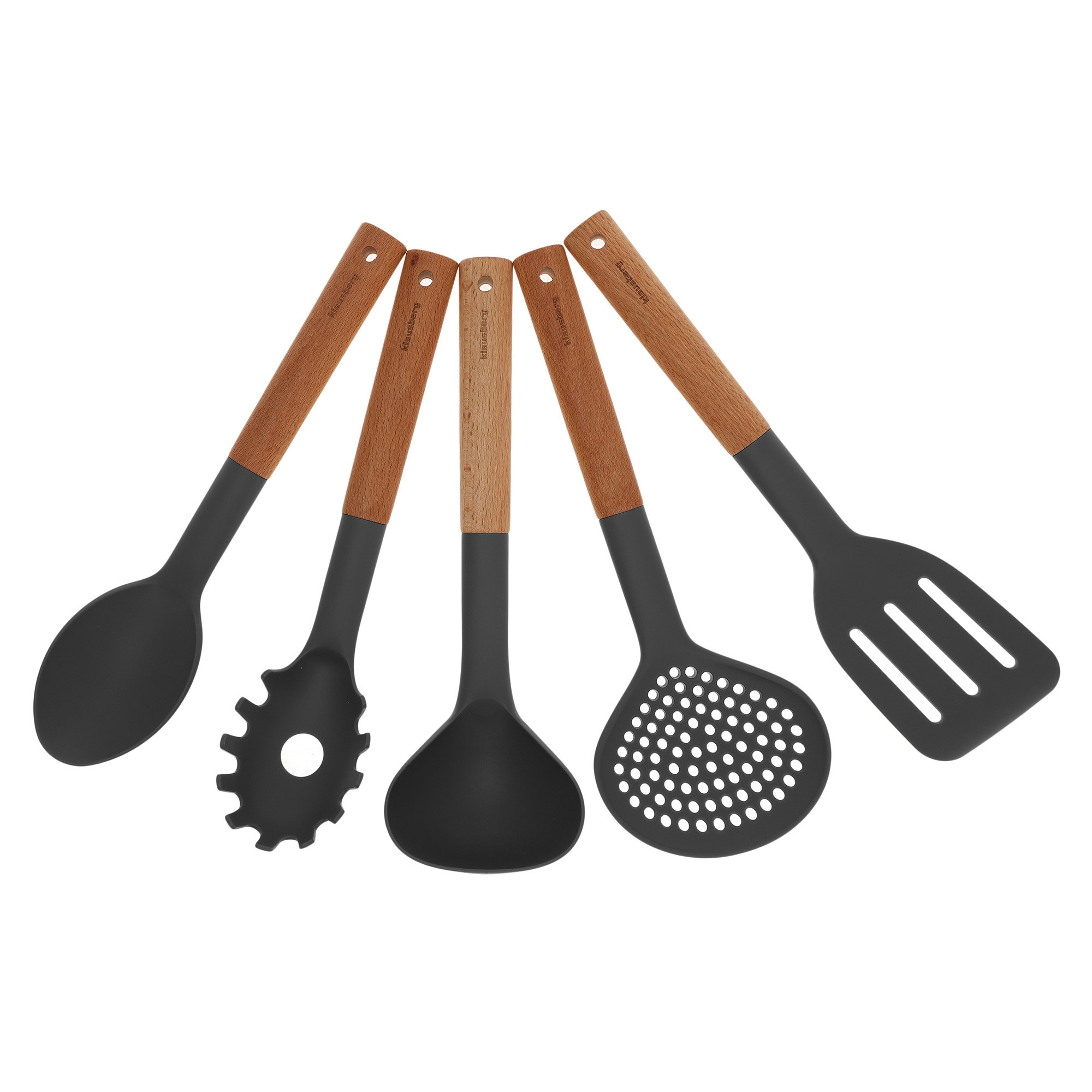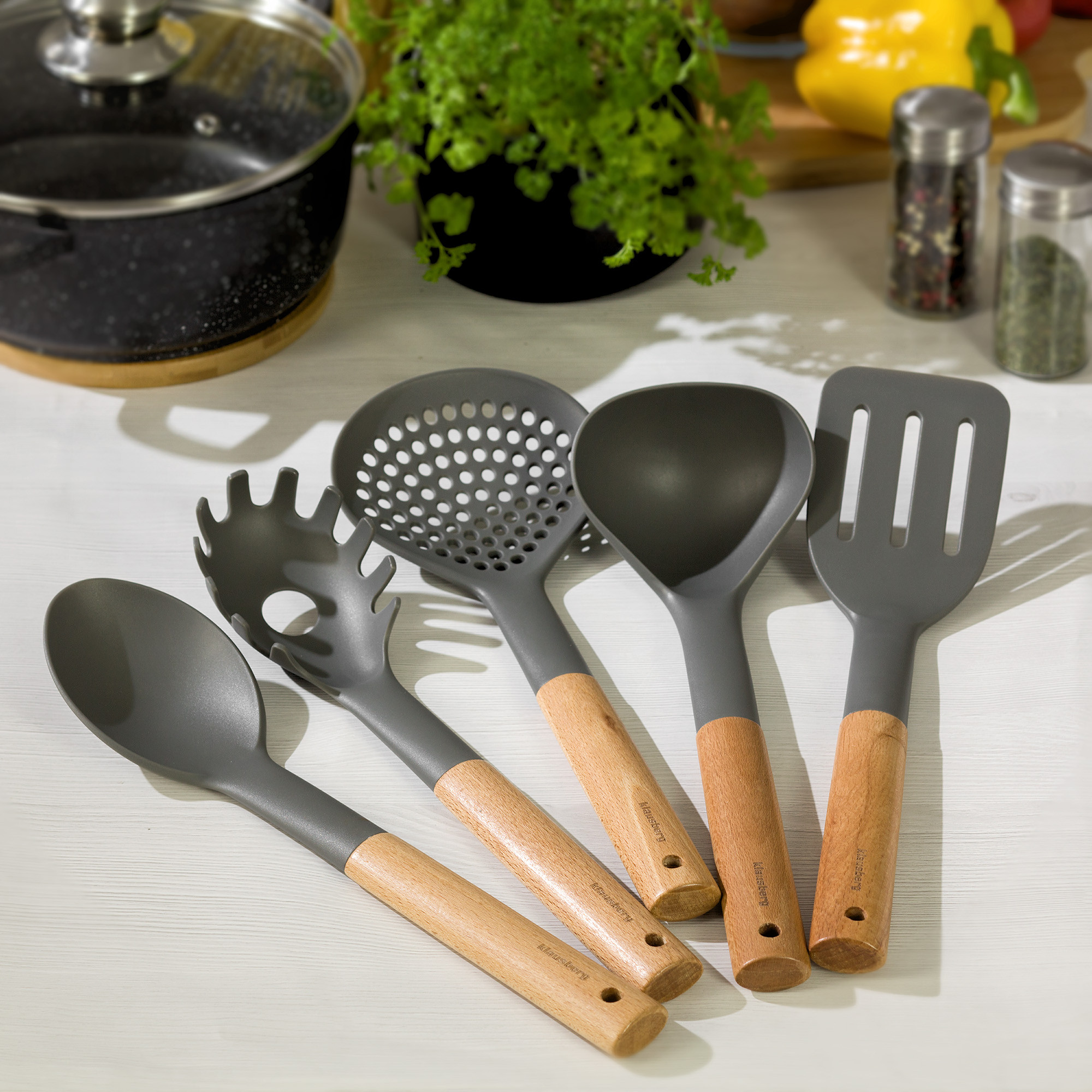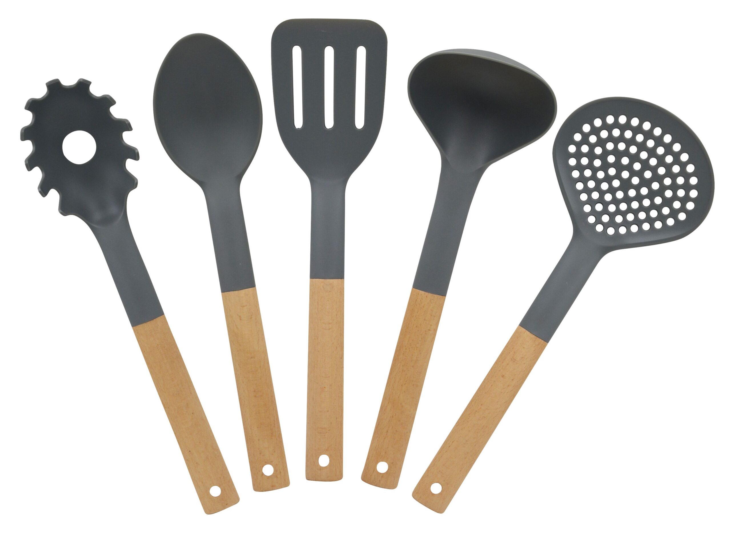 Zestaw przyborów kuchennych wykonanych z drewna i nylonu termoplastycznego.