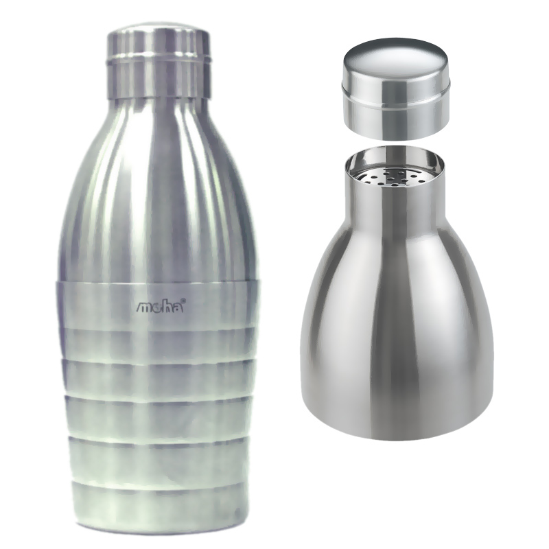 Shaker ma wygodną pokrywkę, która ma specjalne sitko do zatrzymywania lodu i innych dodatków, które nie powinny znaleźć się w drinku. Na wewnętrznej ściance stalowego pojemnika została rozrysowana miarka, która ułatwia odmierzanie składników, poczynając od 100 ml.