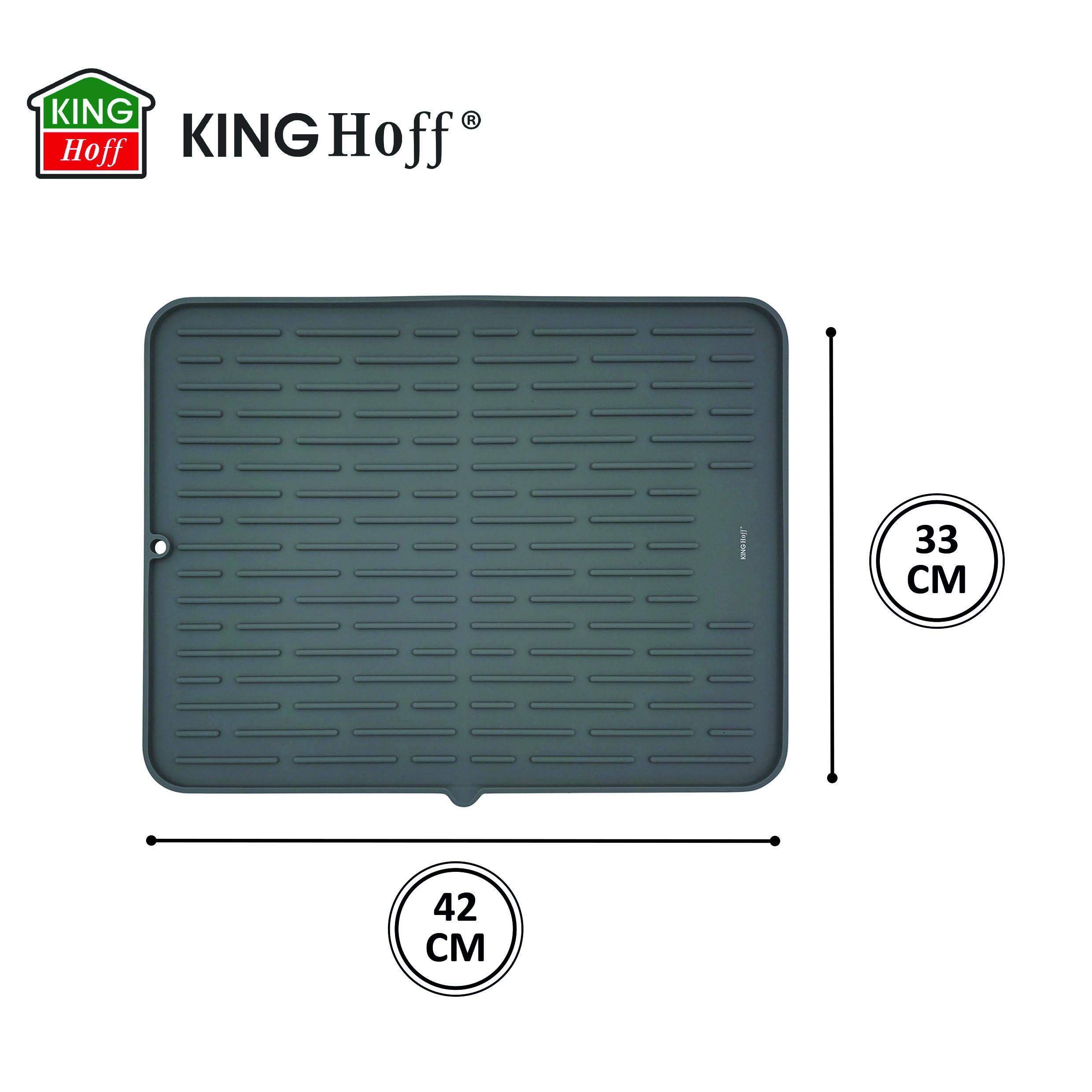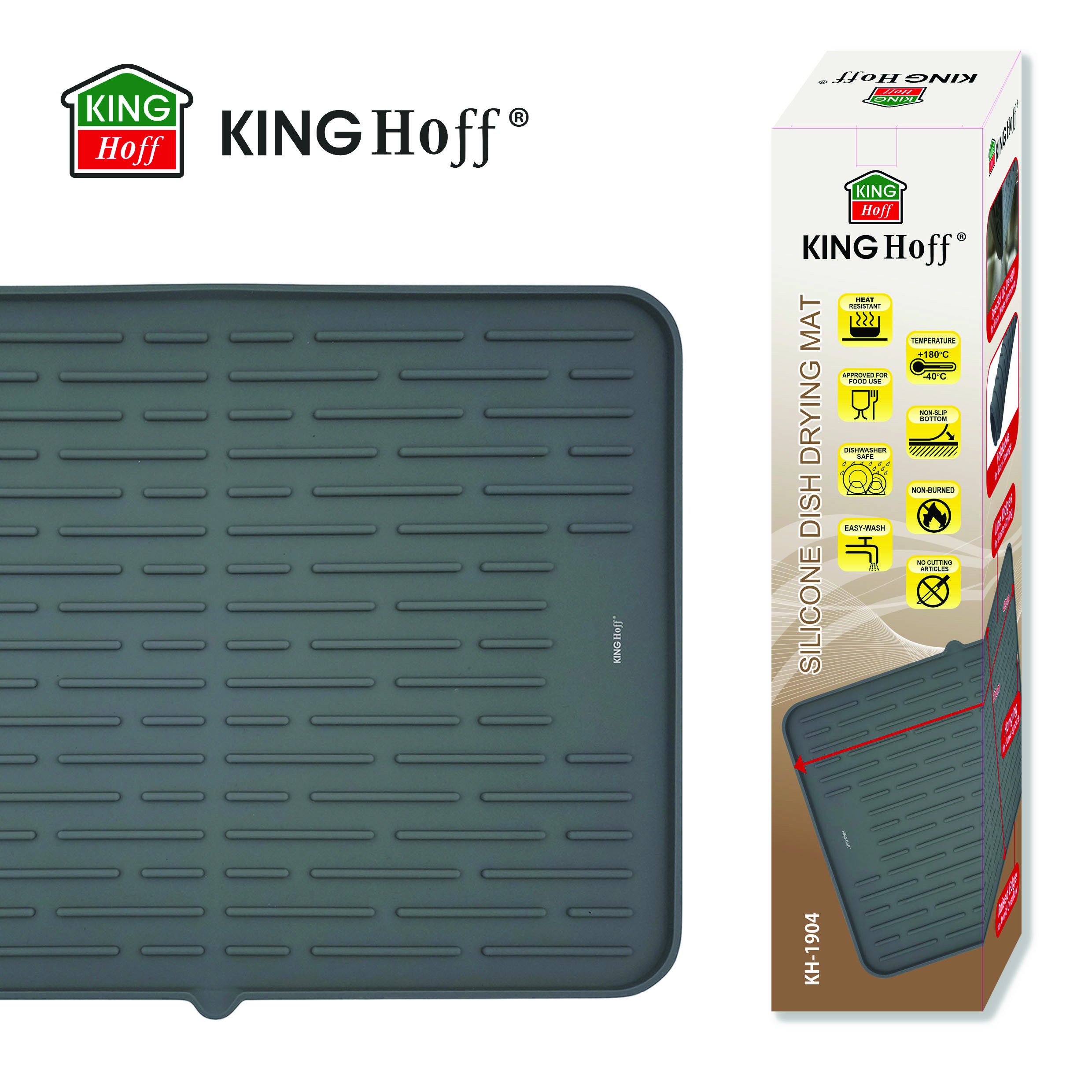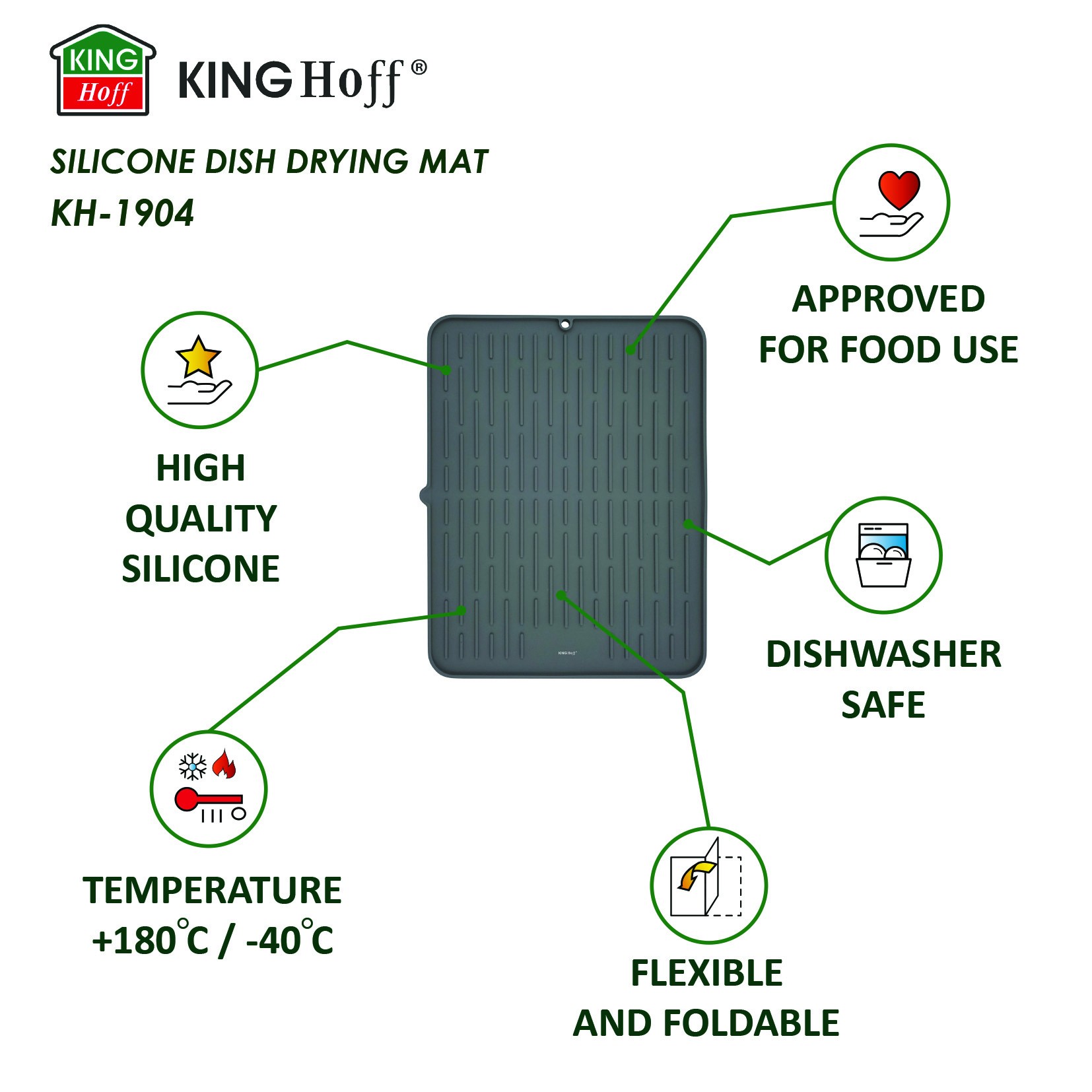 KINGHoff KH-1904 to trwała i odporna na wysoką temperaturę mata do suszenia naczyń, wykonana z wysokiej jakości, bezpiecznego silikonu. Dzięki wymiarom 42 x 33 cm idealnie sprawdza się do codziennego suszenia naczyń, garnków, patelni, sztućców, a także świeżych owoców i warzyw.