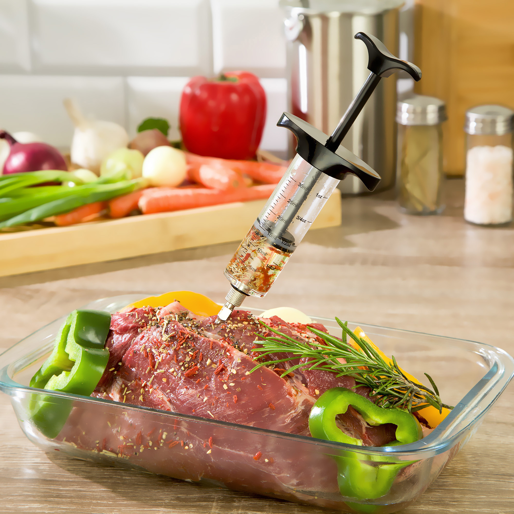 Zadbaj o pełnię smaku swoich potraw dzięki strzykawce do marynowania Kinghoff. To kompaktowe, ale niezwykle praktyczne narzędzie pozwala na dokładne wstrzykiwanie marynat i przypraw bezpośrednio do wnętrza mięsa, drobiu czy nawet owoców. Sprawdzi się zarówno w kuchni domowej, jak i podczas grillowania.