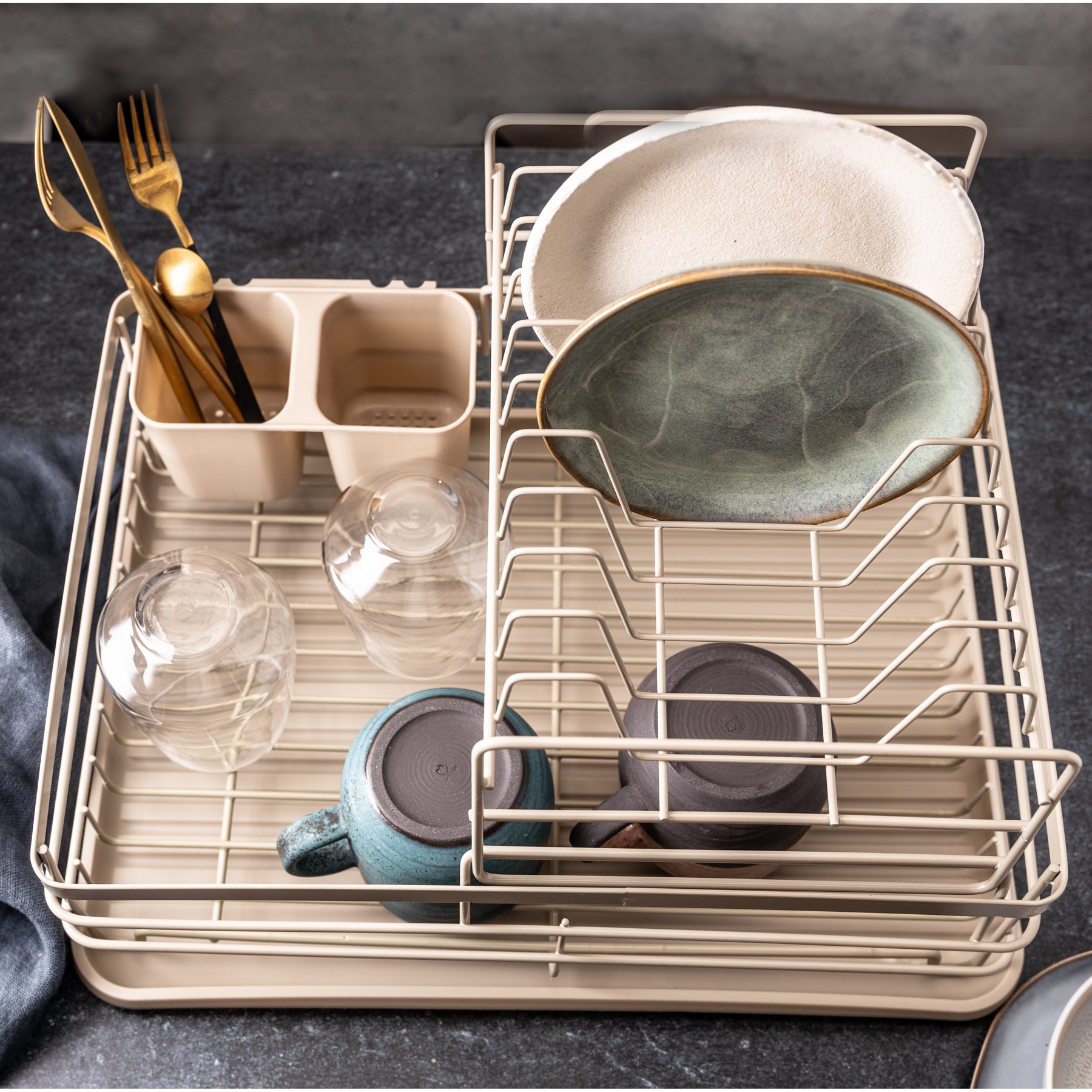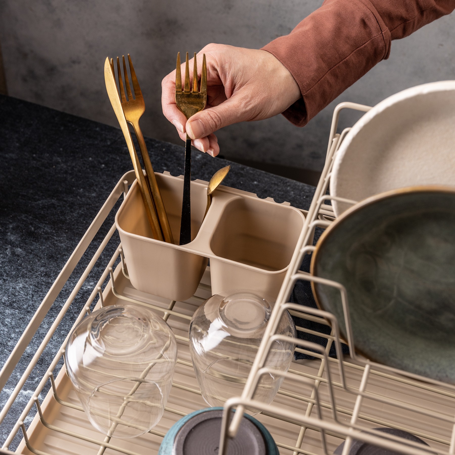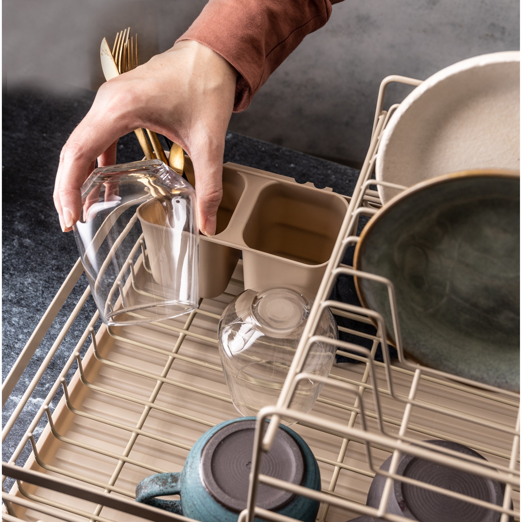 Wbudowany ociekacz z rowkami – stabilnie utrzymuje talerze i szkło.