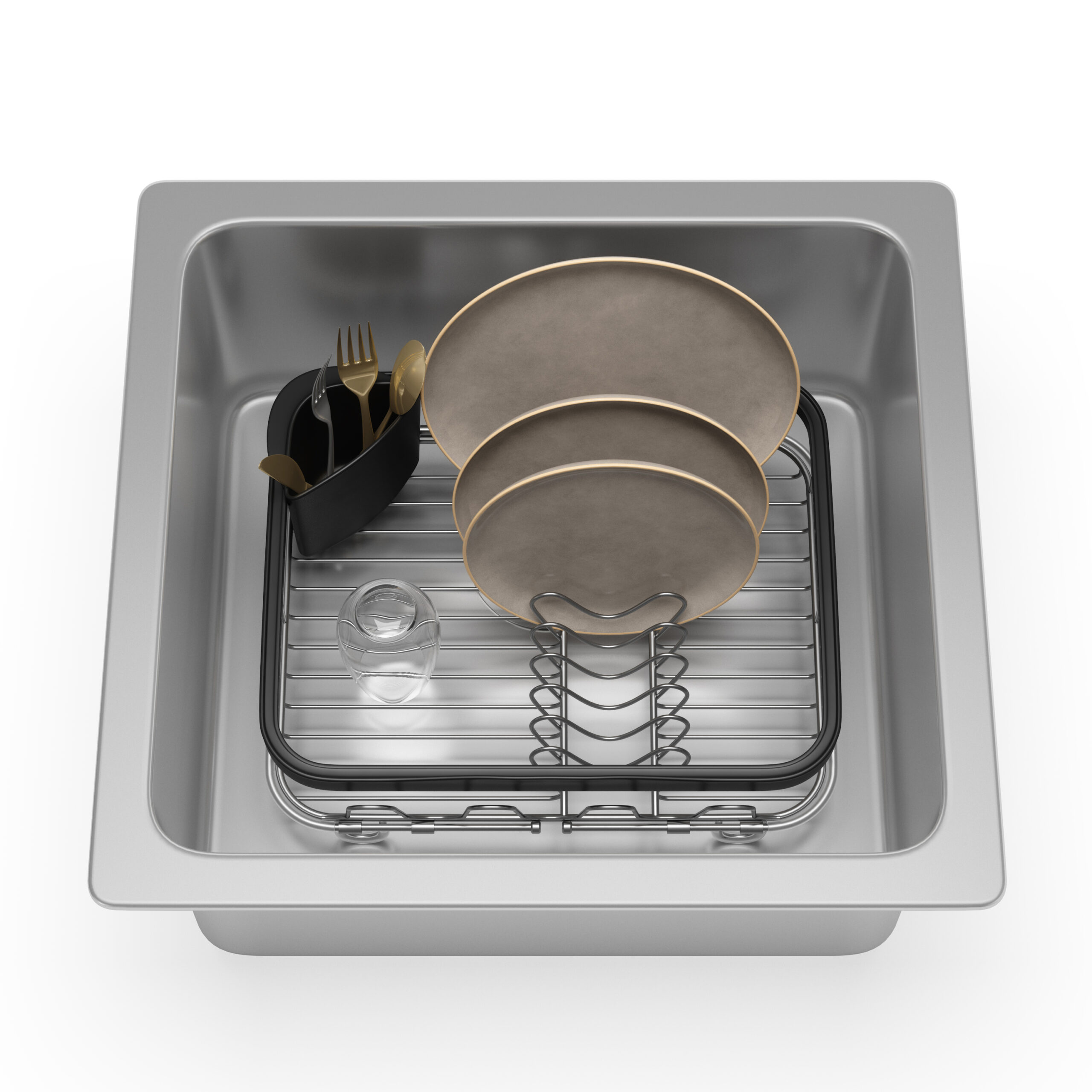 Sinkin to suszarka do naczyń do zlewu firmy Umbra, która umieszczana jest na dnie zlewu, zapewniając schludne i wygodne miejsce do osuszania naczyń i szklanek.