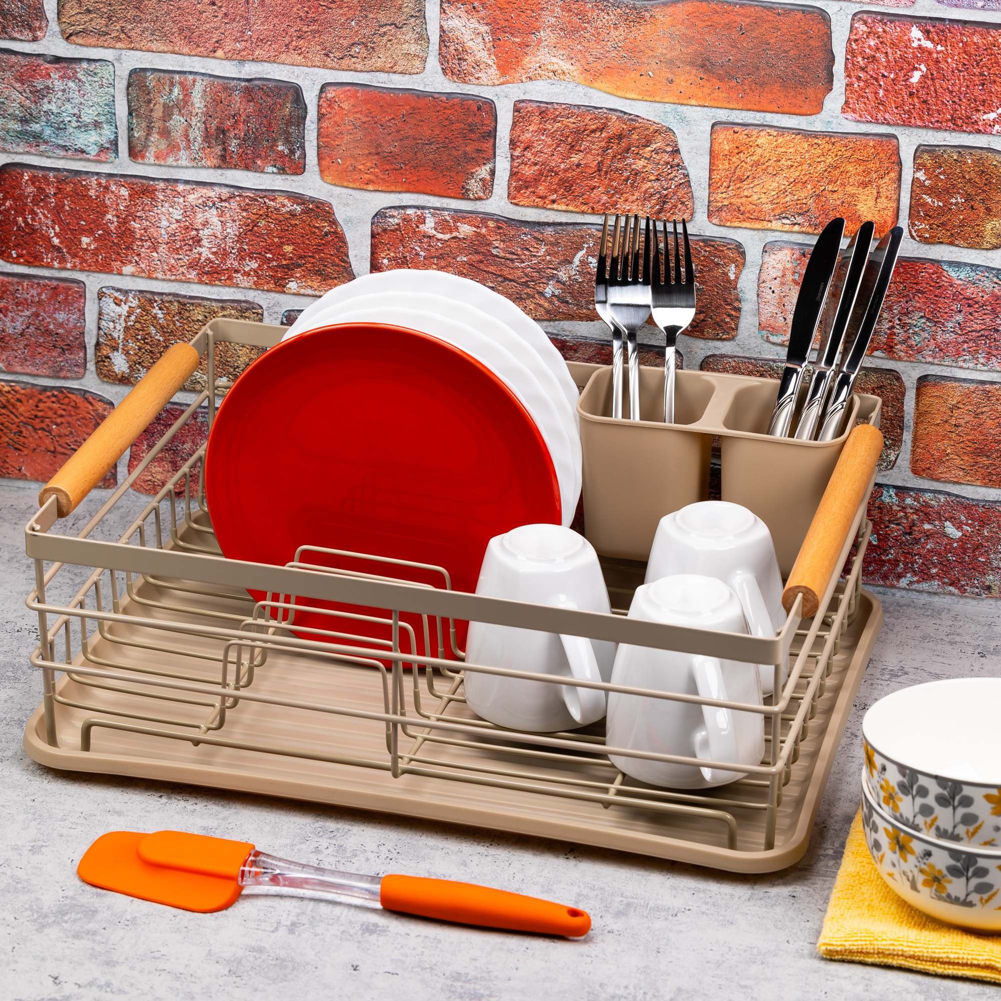 Minimalistyczny design beżowego ociekacza KINGHoff to doskonałe połączenie funkcjonalności i estetyki, które wpasuje się w każde wnętrze kuchenne. Dzięki praktycznym rozwiązaniom umożliwia wygodne suszenie naczyń, kubków, talerzy oraz sztućców. Zdejmowany, podzielony na dwie części ociekacz na sztućce oraz wygodne uchwyty z drewna bambusowego ułatwiają użytkowanie i przenoszenie.