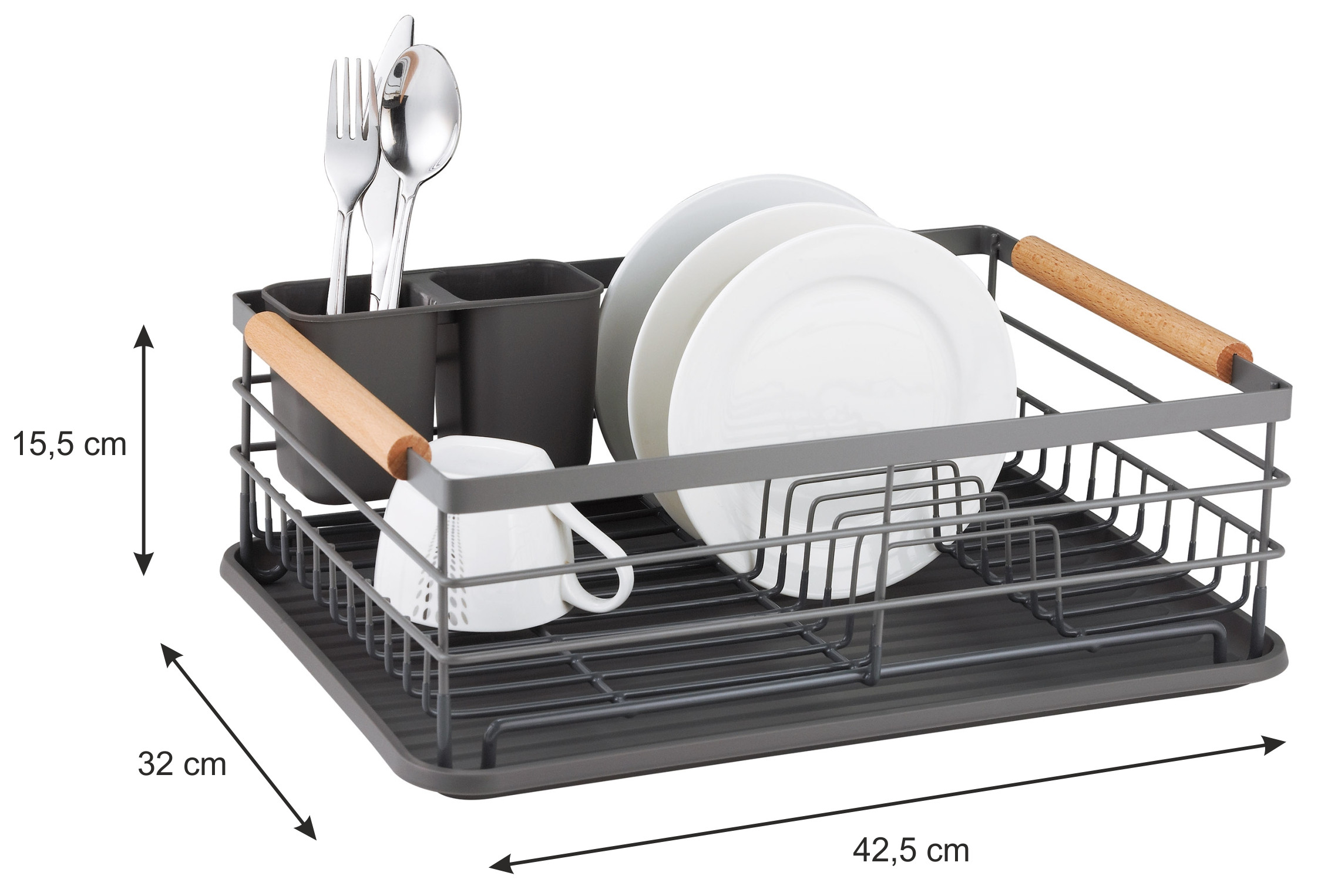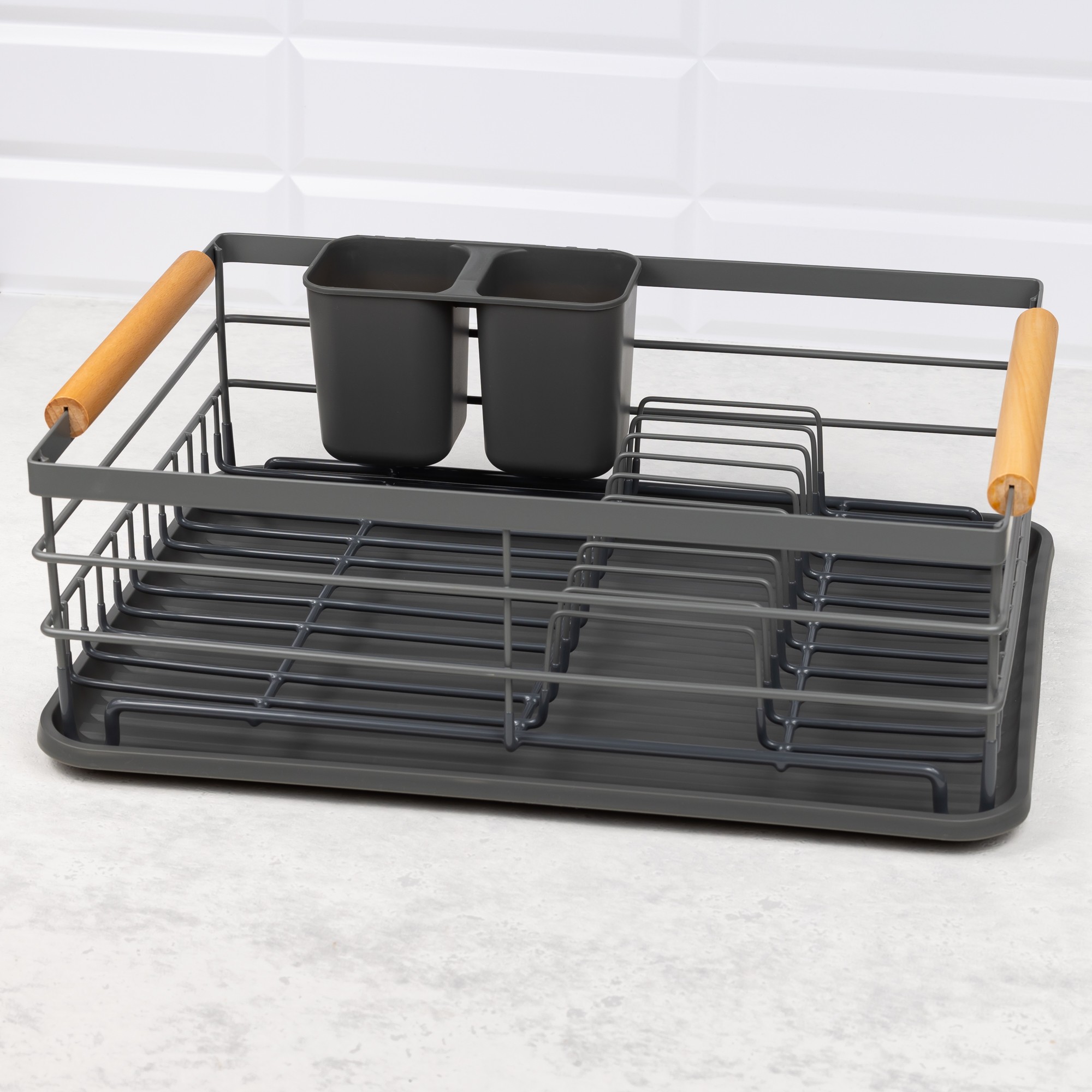 Szary ociekacz do naczyń KINGHoff łączy minimalistyczny styl z funkcjonalnością, dzięki czemu świetnie wpisuje się w każde wnętrze kuchni. Duża pojemność pozwala na wygodne suszenie talerzy, kubków i sztućców. Zdejmowany pojemnik na sztućce podzielony na dwie części ułatwia segregację. Drewniane uchwyty z obu stron służą do wygodnego przenoszenia lub zawieszenia ściereczki.