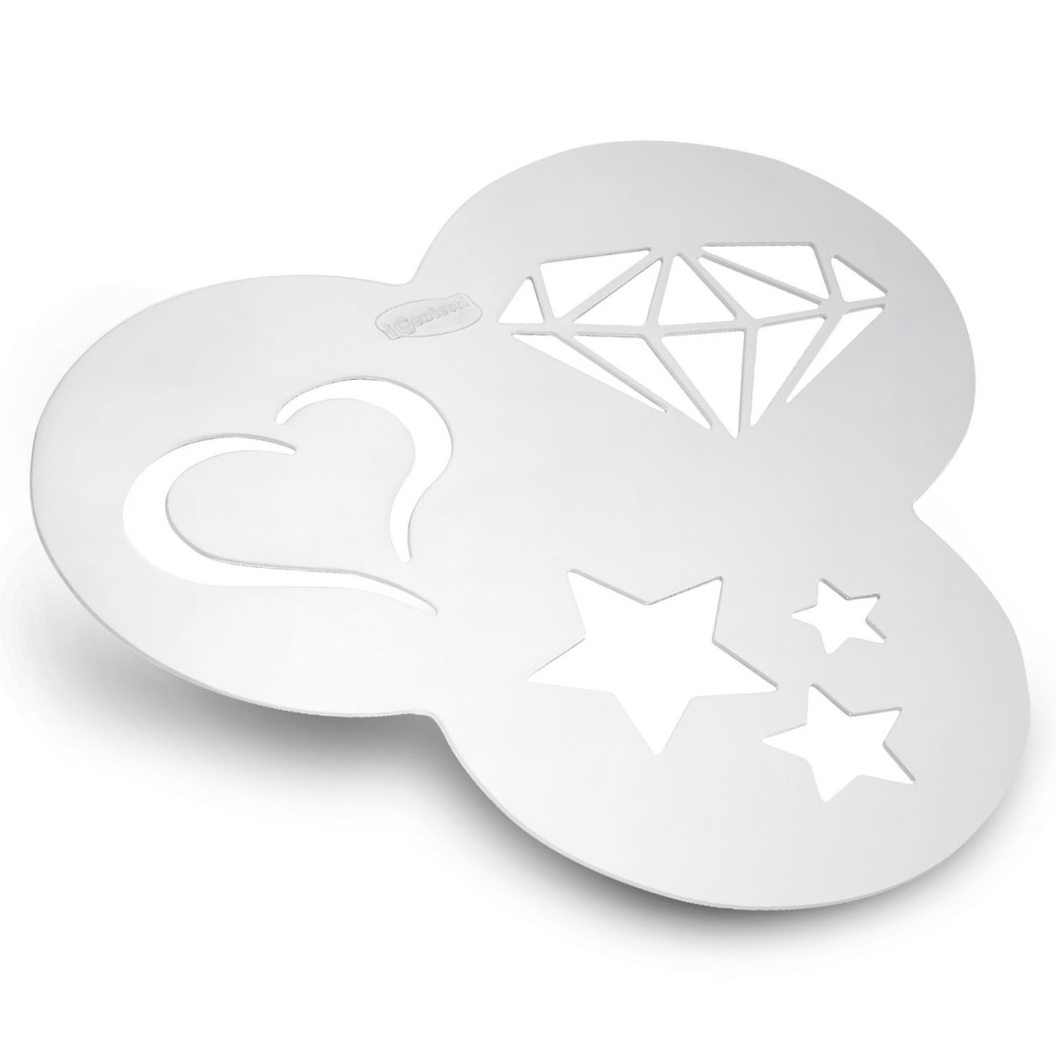 Szablon ze stali nierdzewnej z trzema wzorami (diament, serce, gwiazdki) do dekorowania Cappuccino lub ciastek kakałem bądź cukrem pudrem. Można myć w zmywarce. Produkt może nosić ślady produkcyjne, które w żaden sposób nie wpływają na jego walory użytkowe. Materiał: stal nierdzewna. Wymiary brutto: 22,8x15x0,2cm Wymiary: 14×0,07×13,3cm. Waga brutto: 0,090kg. Waga netto: 0,076kg.