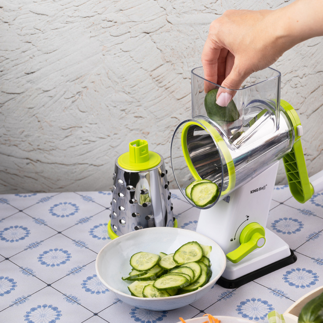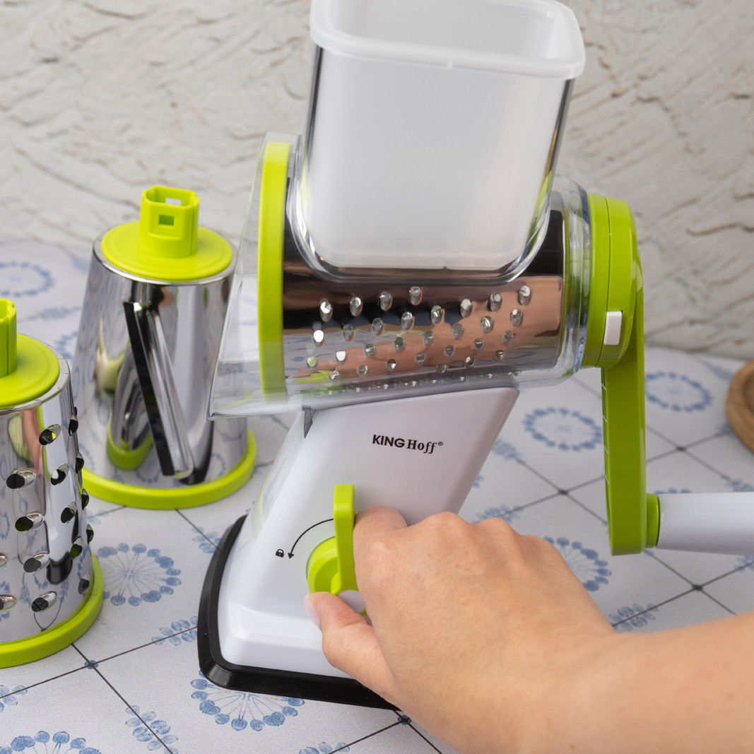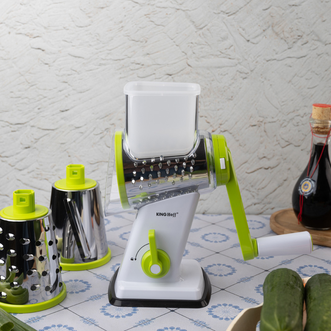 Uniwersalna tarka bębnowa 3 w 1 KINGHoff w świeżym, zielonym kolorze to praktyczny pomocnik, który ułatwi codzienne przygotowywanie posiłków. Wyposażona w trzy wymienne bębny ze stali nierdzewnej 420, pozwala z łatwością ścierać, kroić i szatkować warzywa, sery, orzechy czy owoce. Idealna zarówno dla domowych kucharzy, jak i profesjonalnych pasjonatów gotowania.