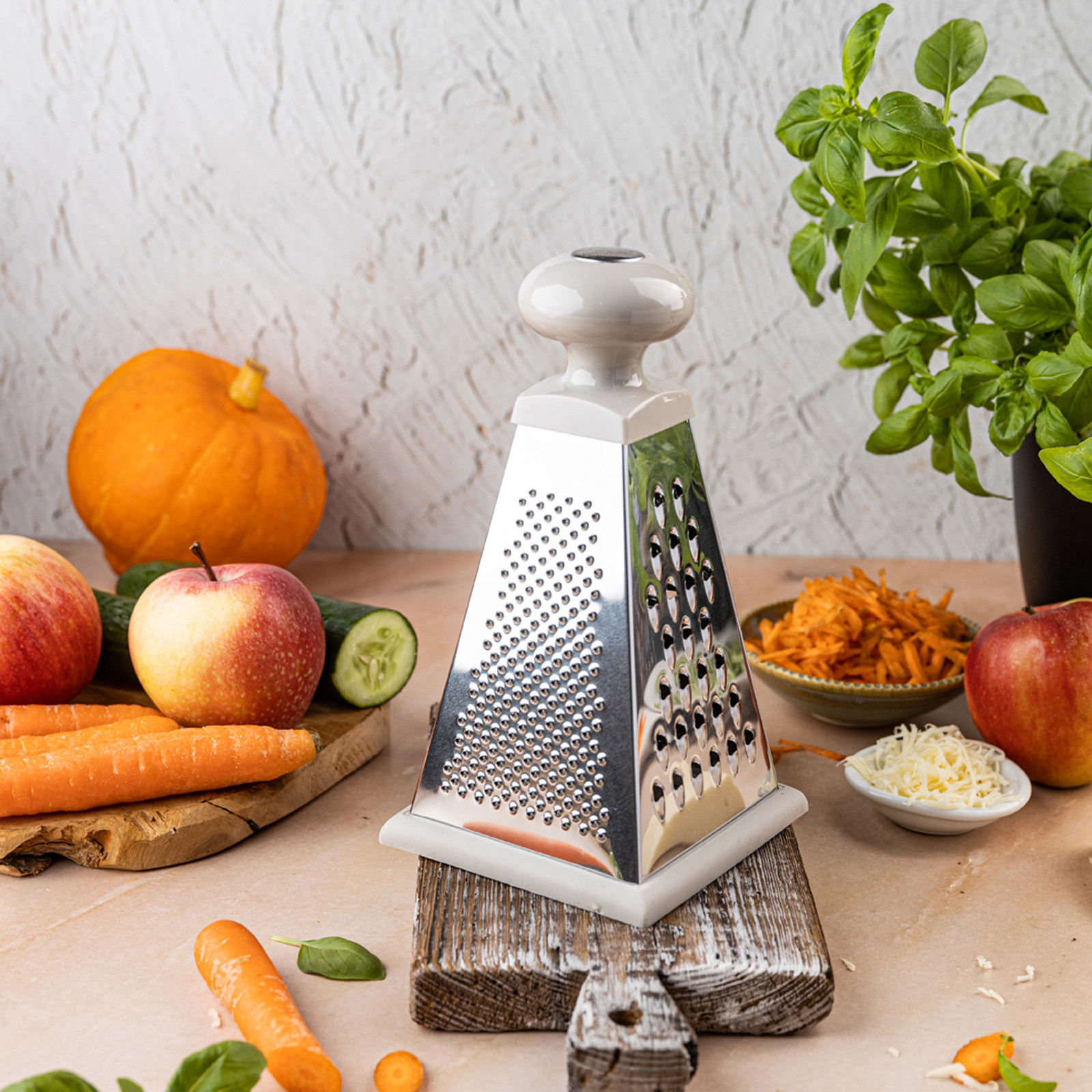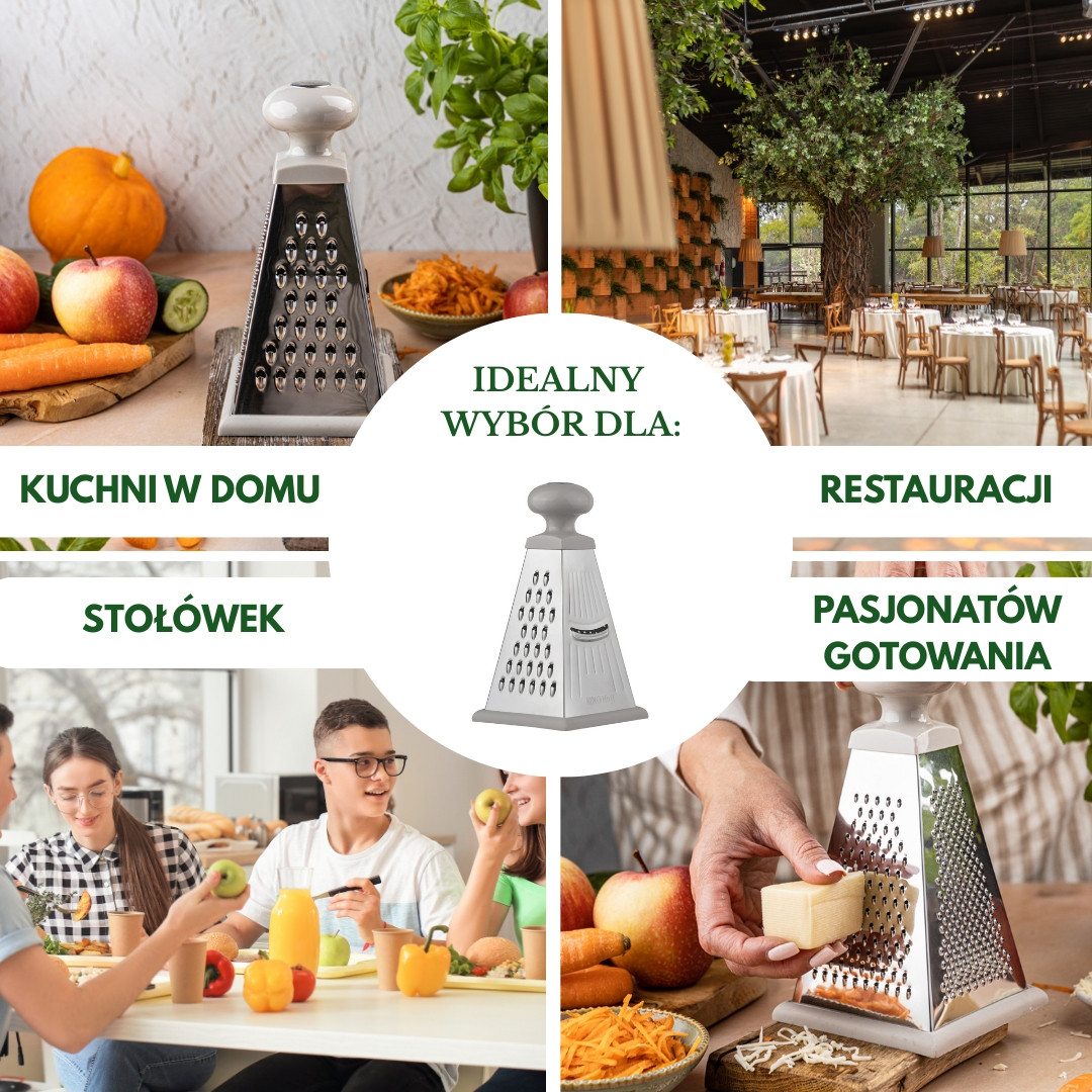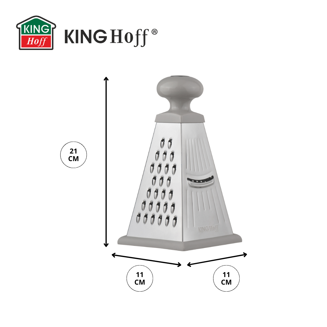 Praktyczna i solidna tarka czterostronna z serii KINGHoff to niezastąpione akcesorium w każdej kuchni. Dzięki ostrym i trwałym krawędziom ze stali nierdzewnej umożliwia szybkie i precyzyjne ścieranie warzyw, owoców, serów czy czekolady. Wyposażona w silikonową, antypoślizgową podstawę gwarantuje stabilność podczas pracy, a ergonomiczny uchwyt zapewnia komfort i bezpieczeństwo użytkowania.