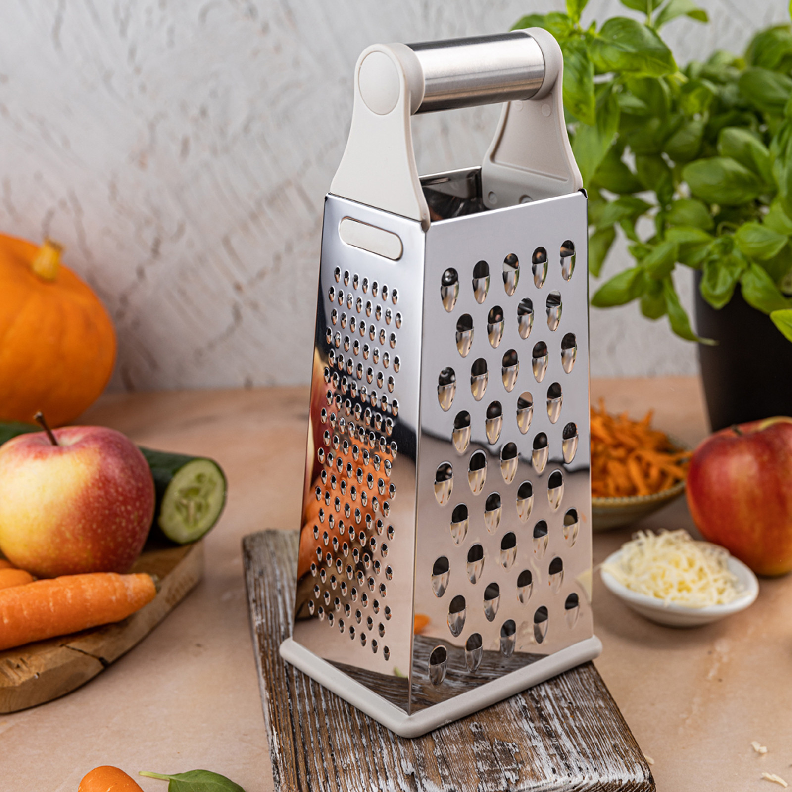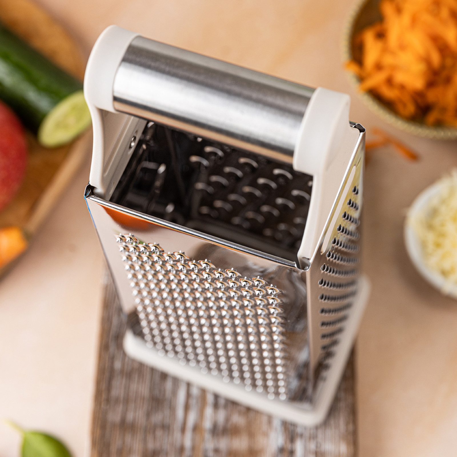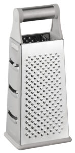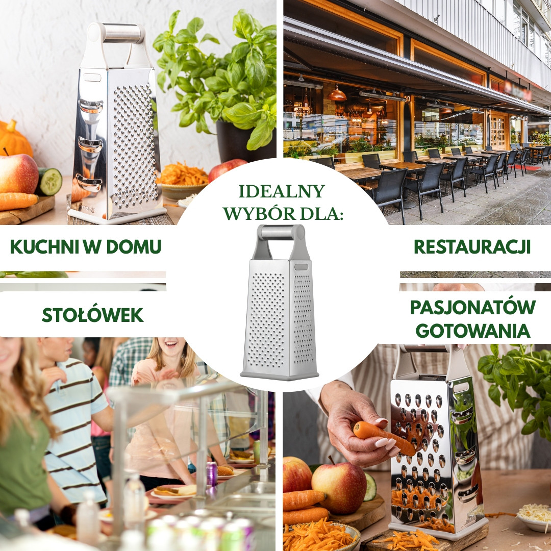 4 różne strony tarki – do tarcia grubego, drobnego, ścinania plasterków i krojenia warzyw